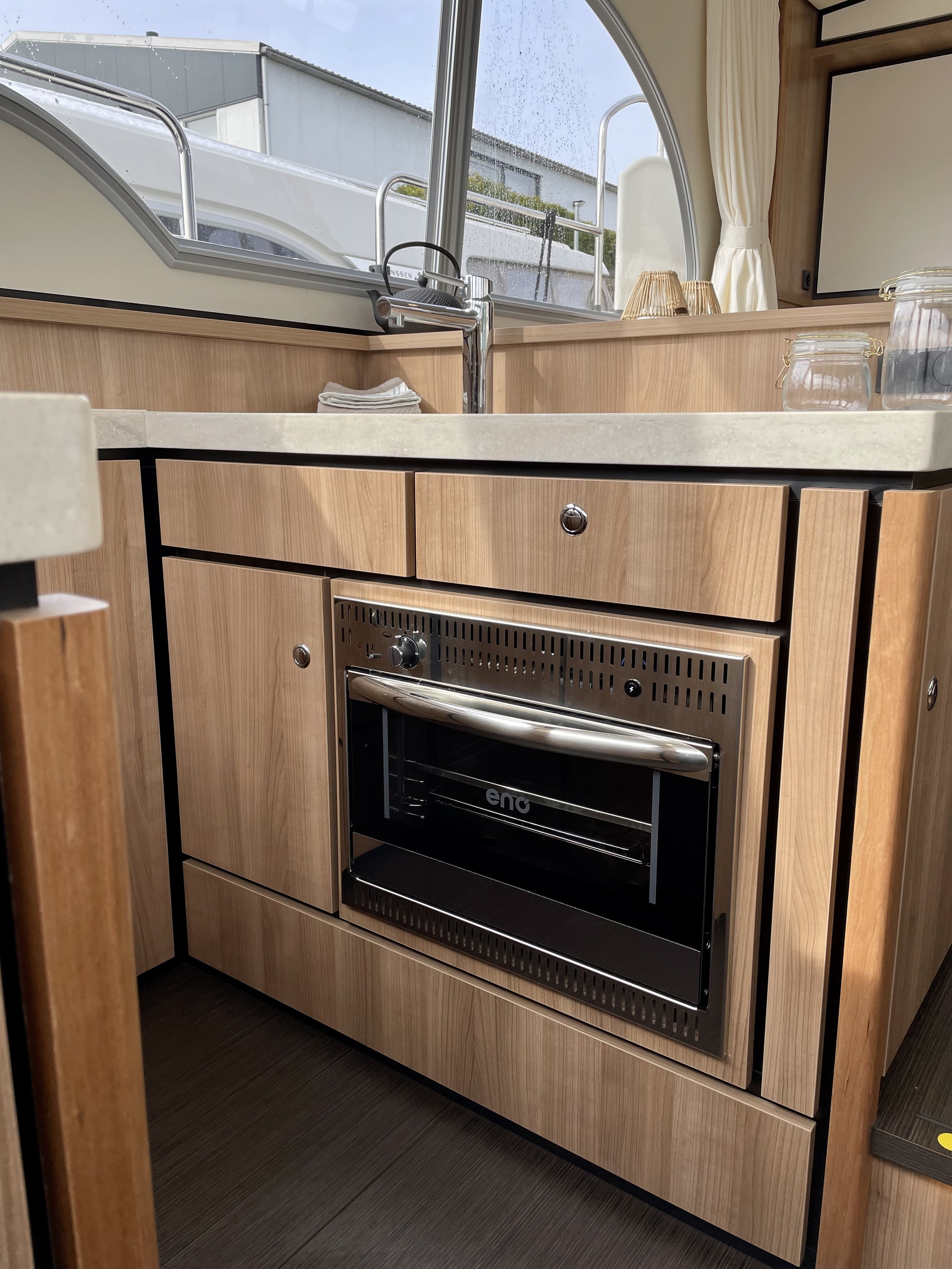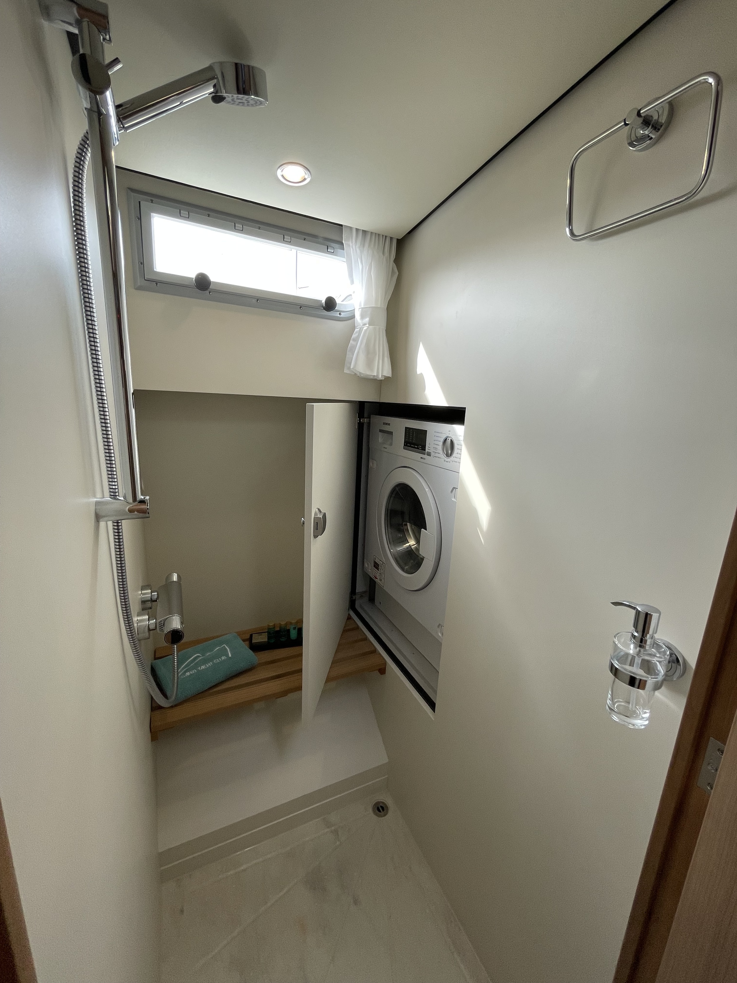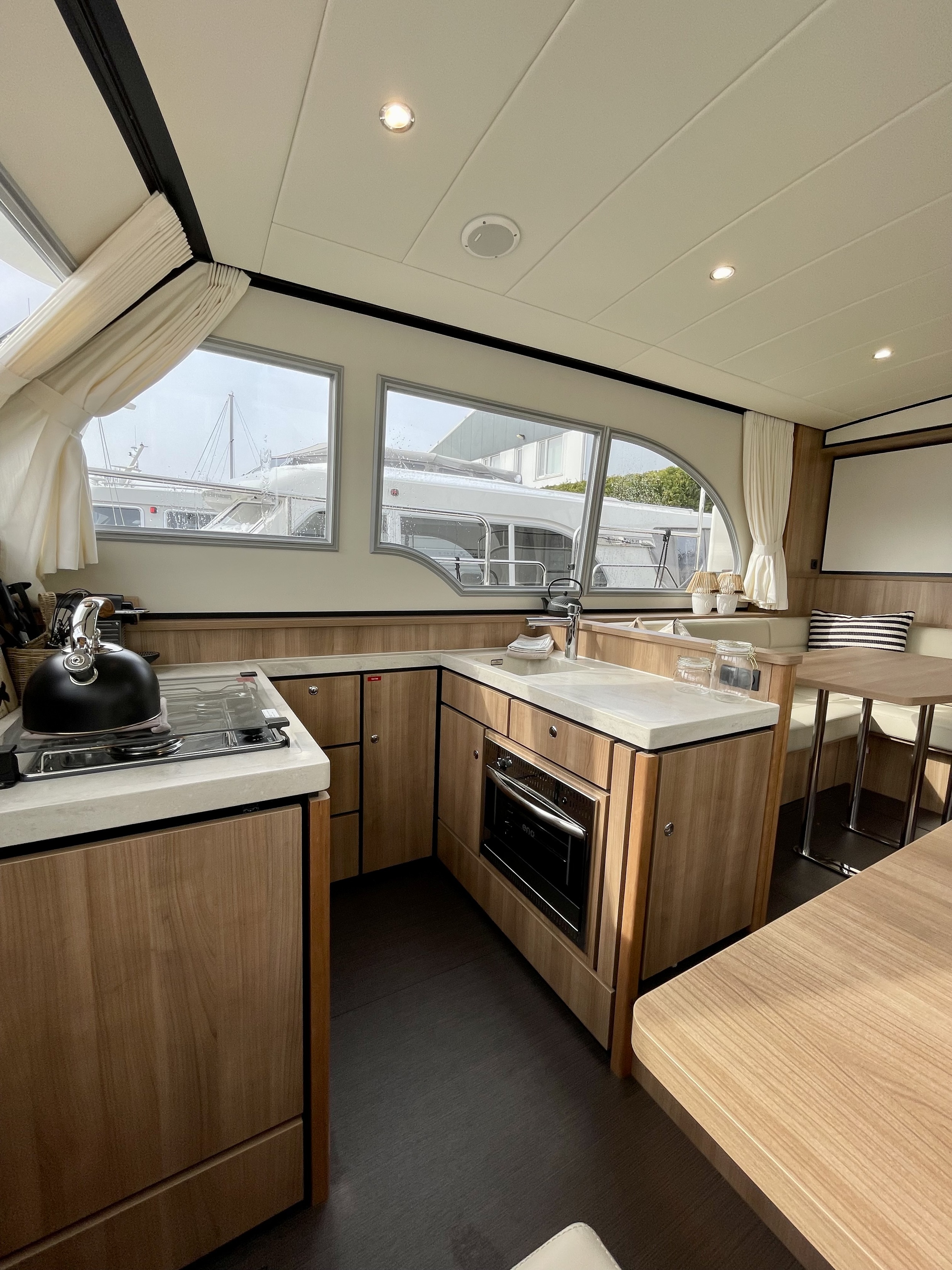 The layout in the salon is practical and from any position there is a rich view outside. The elevated kitchen means there is plenty of light there as well. The kitchen is equipped with a 3-burner gas stove and a gas oven. In the bathroom closet is a washer-dryer which works via shore power.