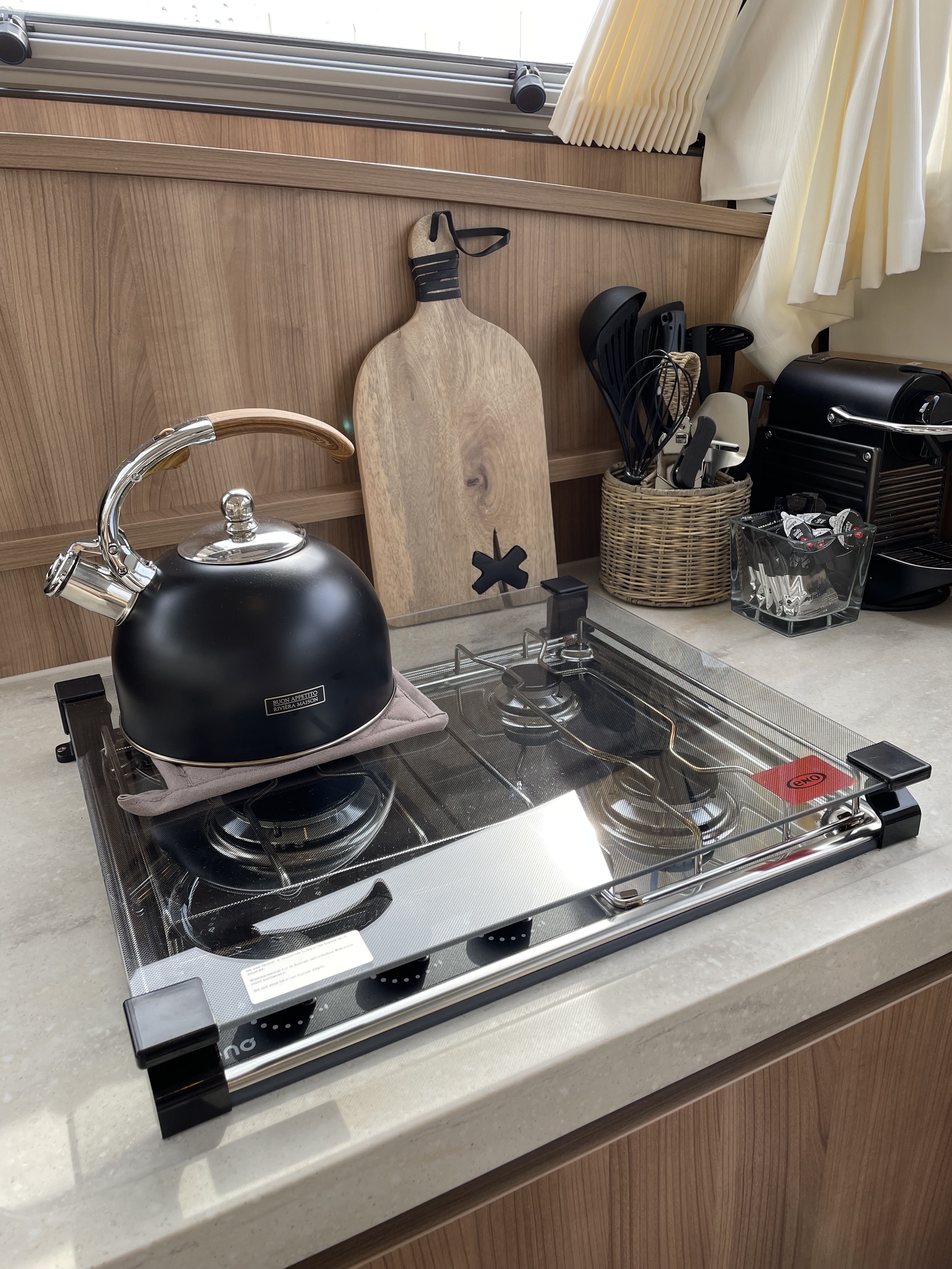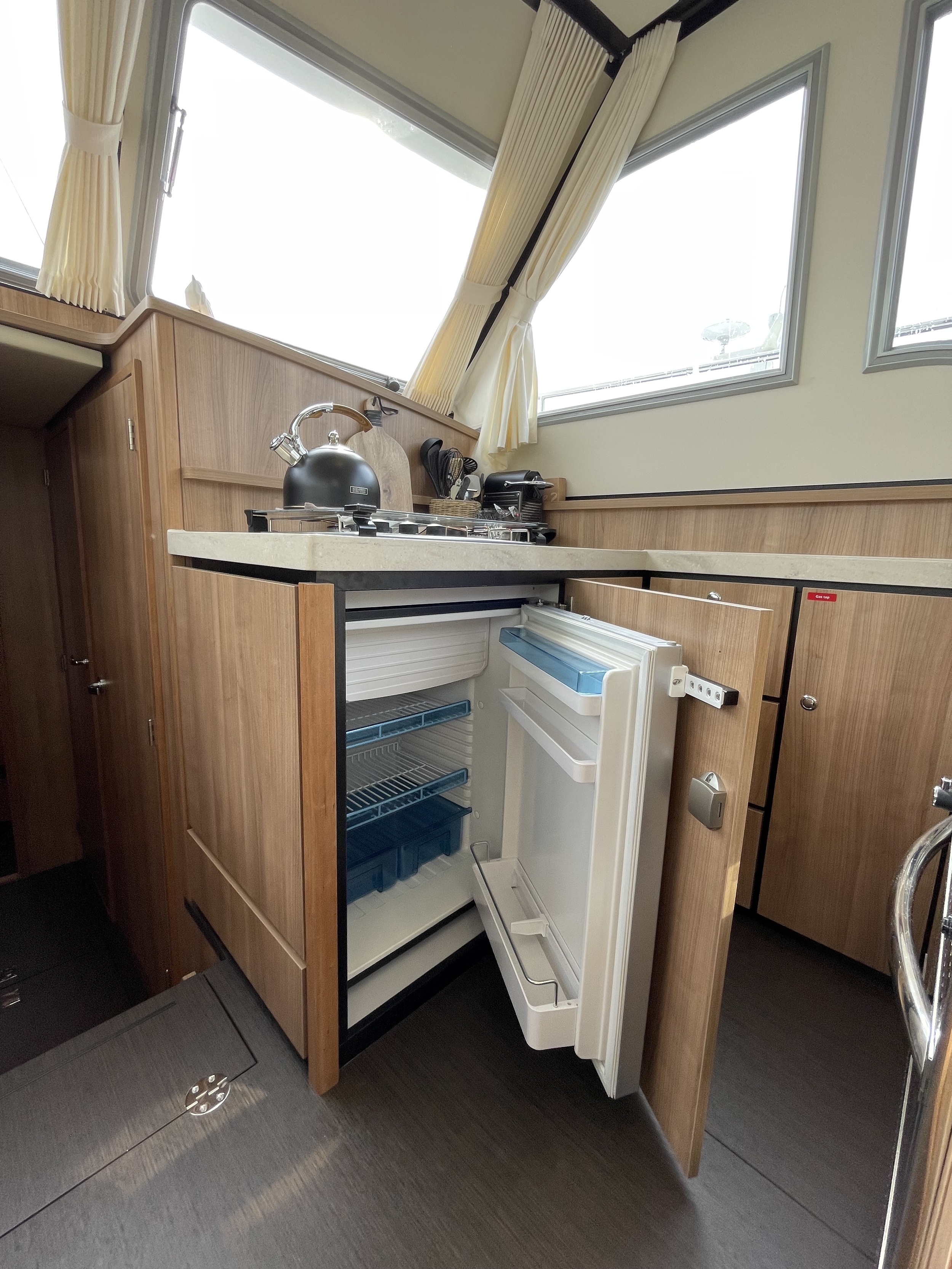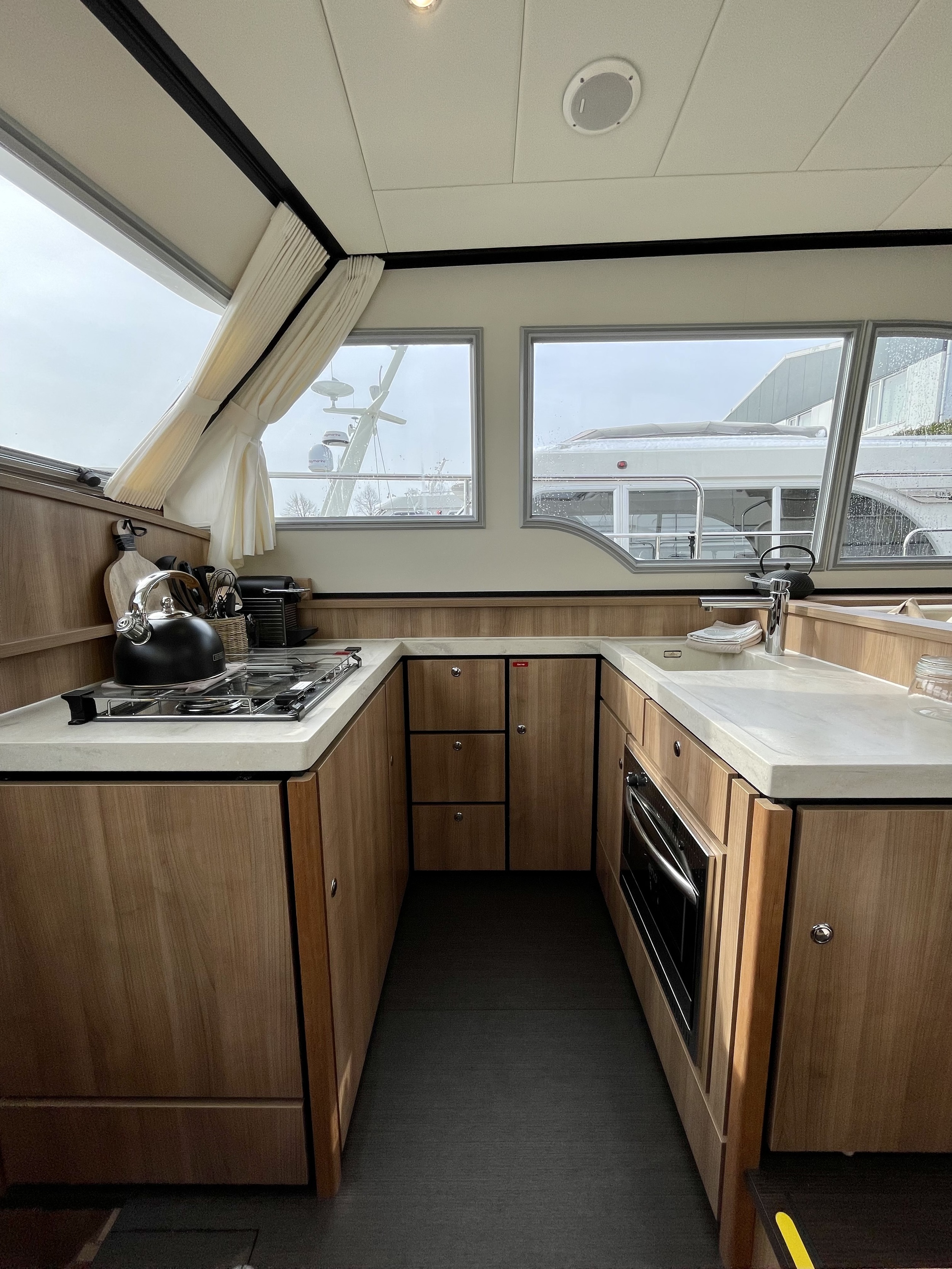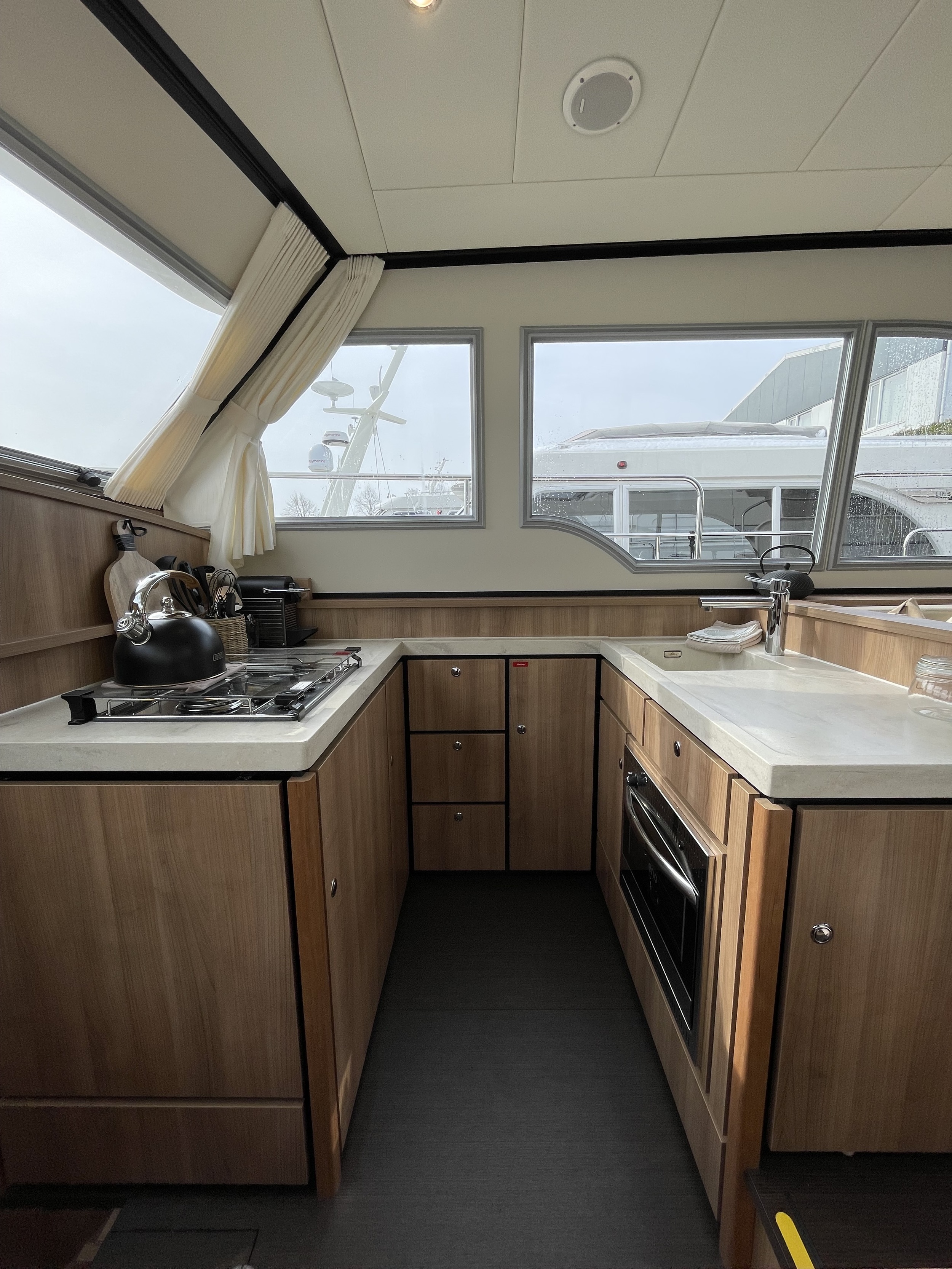 The layout in the salon is practical and from any position there is a rich view outside. The elevated kitchen means there is plenty of light there as well. The kitchen is equipped with a 3-burner gas stove and a gas oven. In the bathroom closet is a washer-dryer which works via shore power.