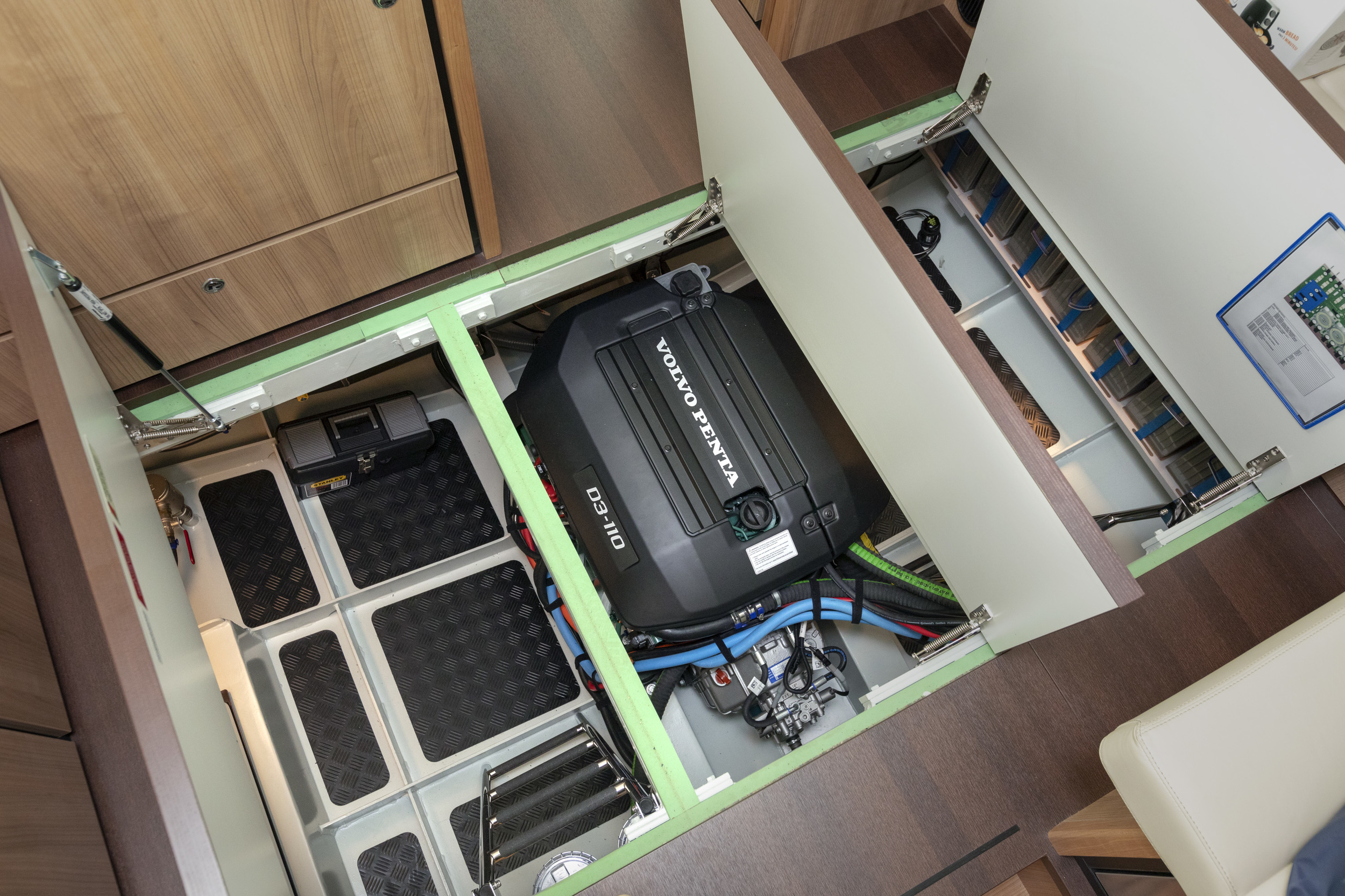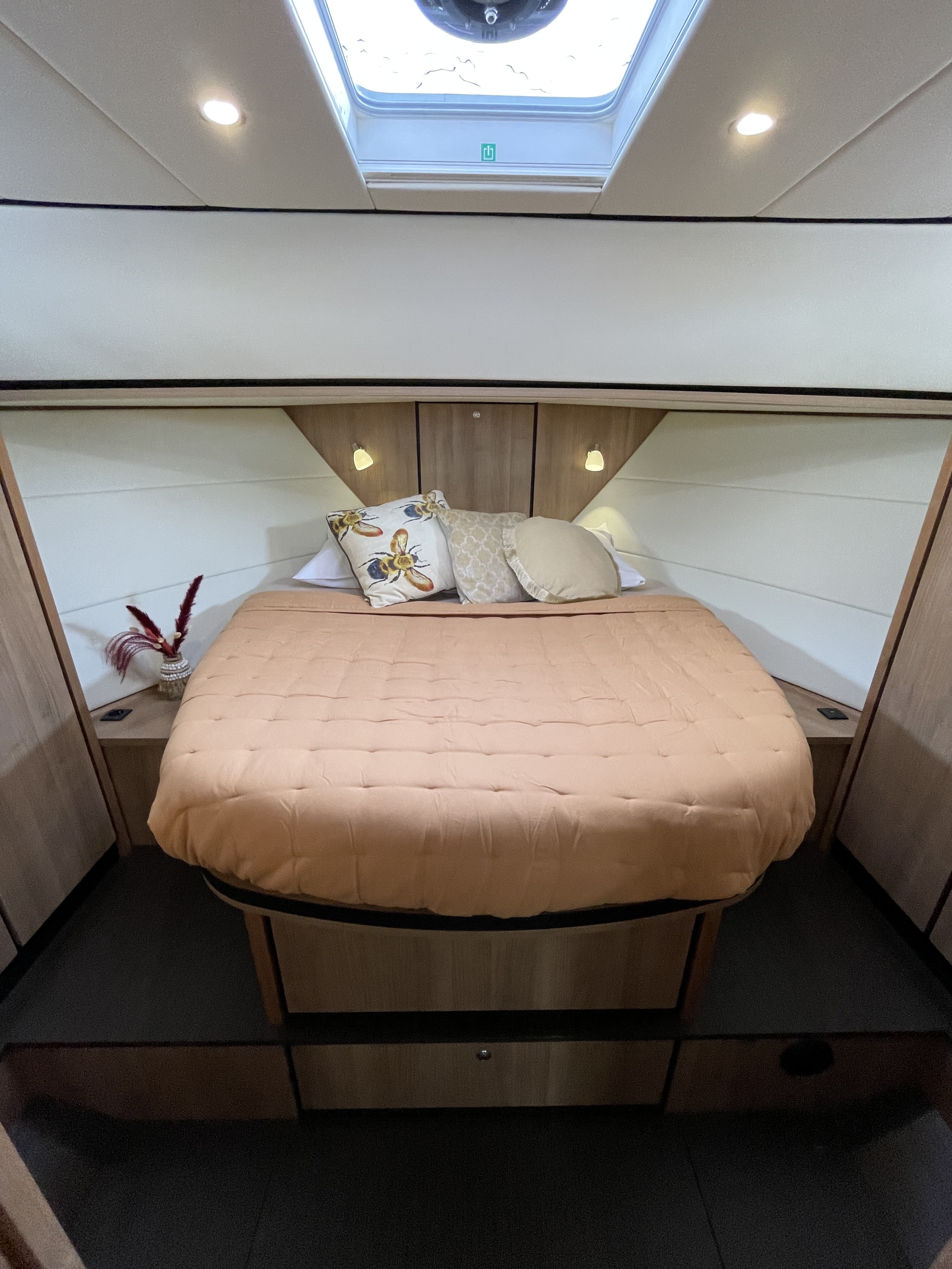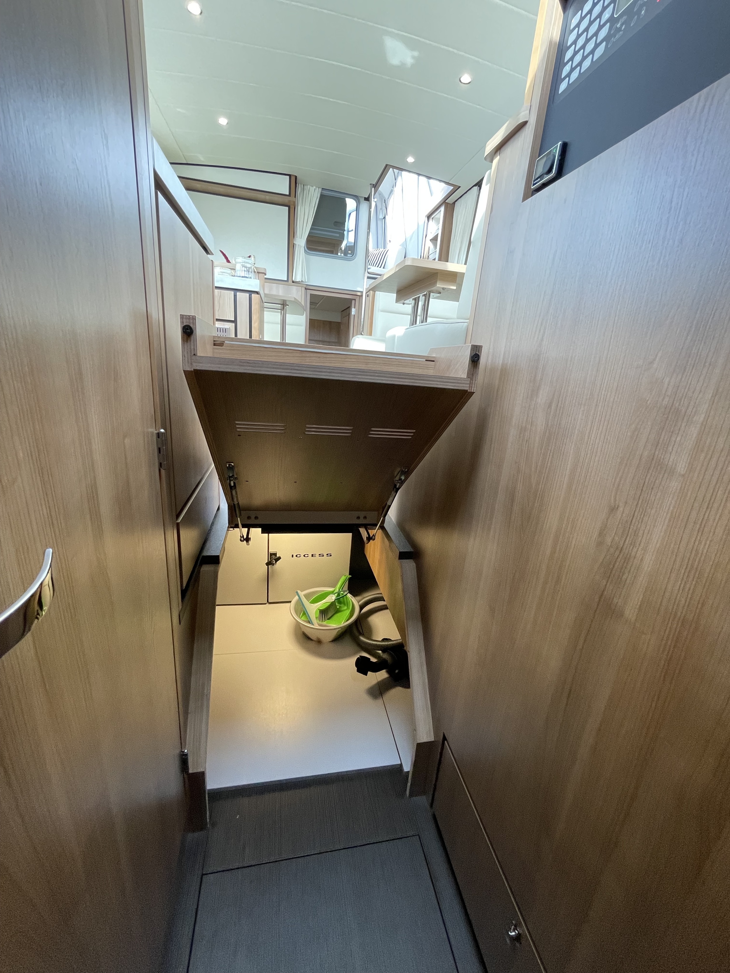 The upward folding staircase towards the forward cabin offers plenty of storage space and is an ideal space for a wine lover, for example.