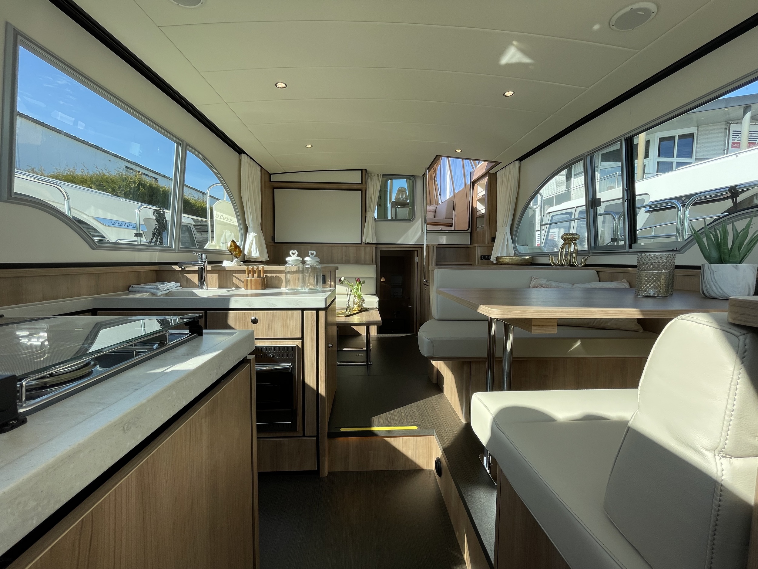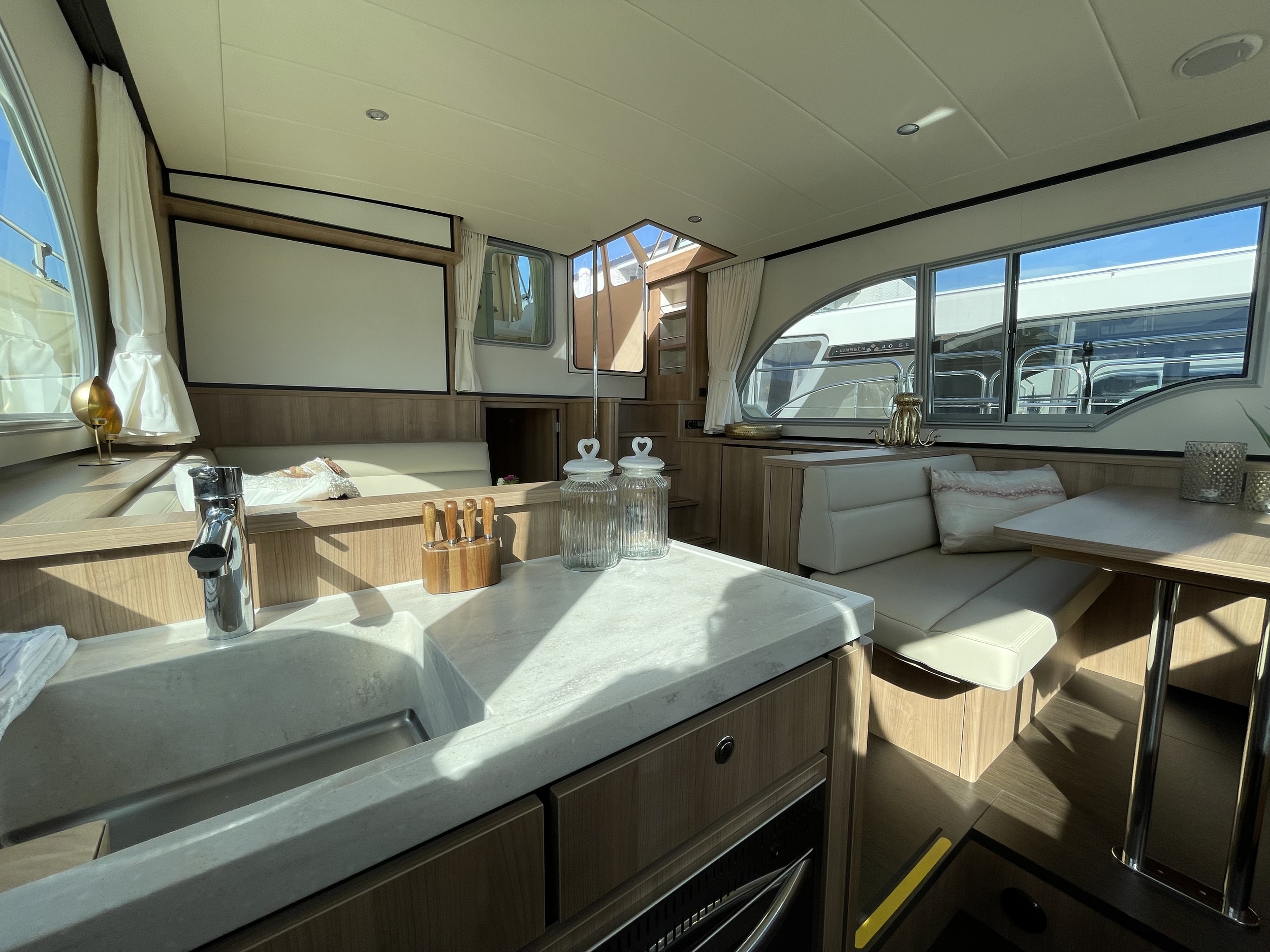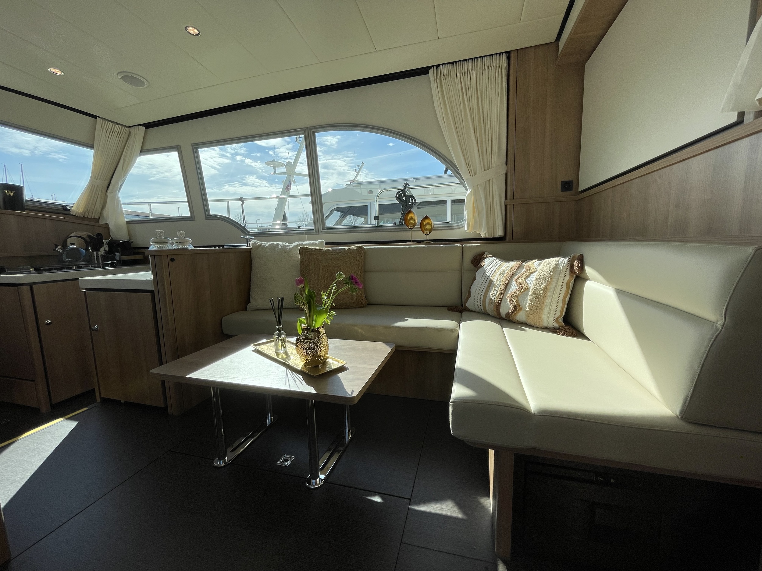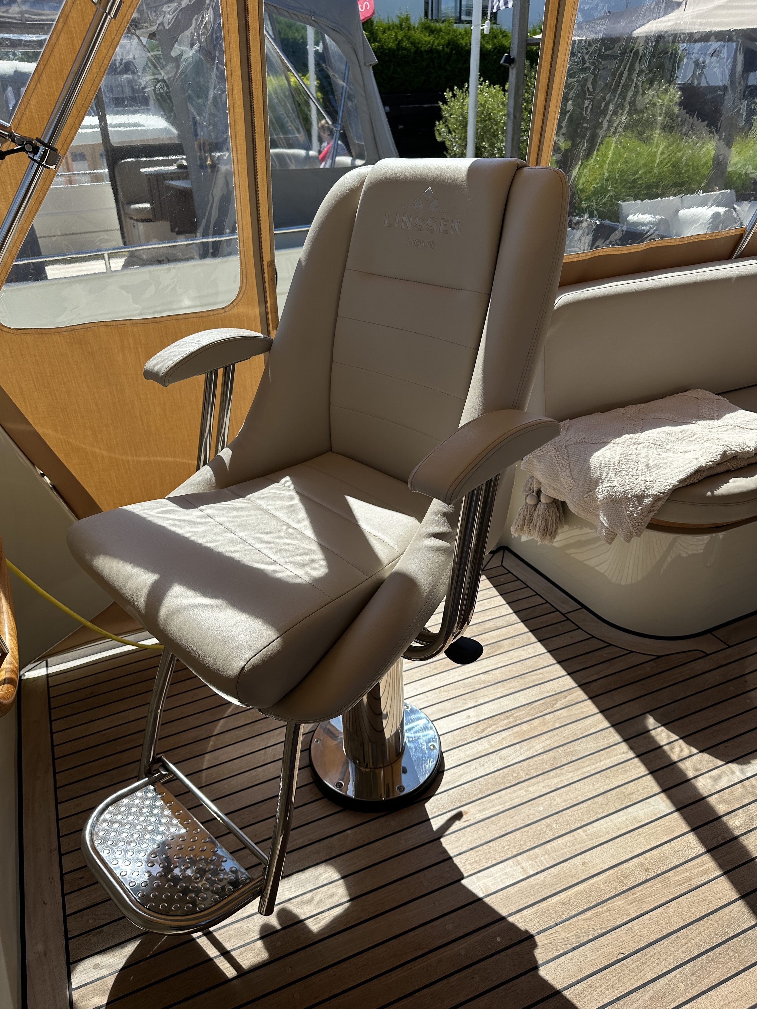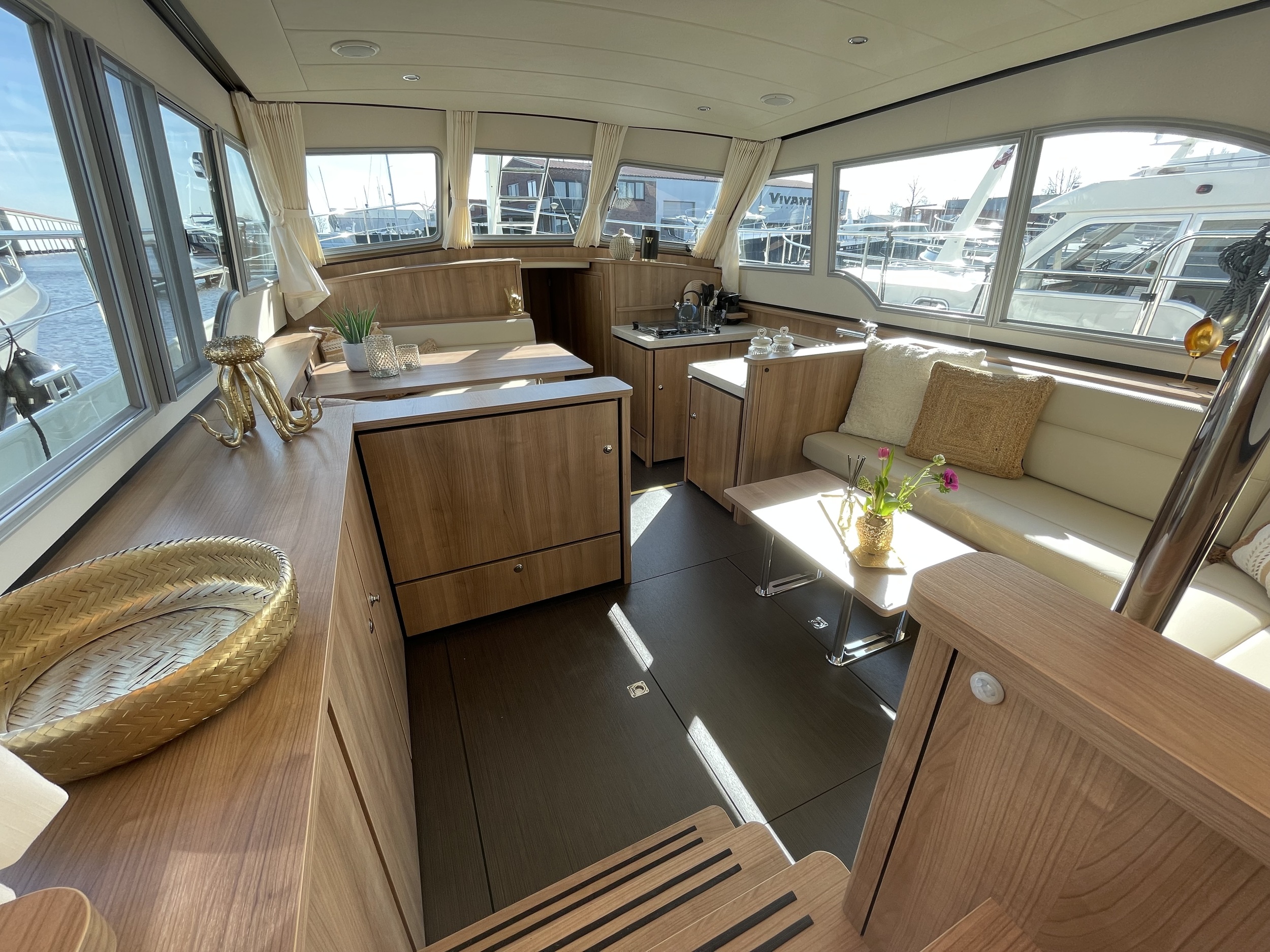 On deck is the steering position with a complete navigation package from Raymarine, including two plotters, AIS, a radar, a day and night camera, a bow and stern thruster and cameras all around. The galley is spacious and equipped with a ceramic 4-burner stove a spacious fridge freezer and an electric combination oven. There are also two additional coolers (drawers) on board and a 40-liter freezer. Furthermore, built-in on board is a 4-G Wifi router. Throughout the yacht is extremely large closet space. In the saloon there is a spacious settee with an easy sleep system; a simple operation creates two extra beds. The salon offers a nice atmosphere with its beautiful light paneling and generous light. The aft deck has a spacious settee with an original Linssen deck cushion set, a fixed teak table on two high-gloss stainless steel legs and a fixed comfortable helm chair.