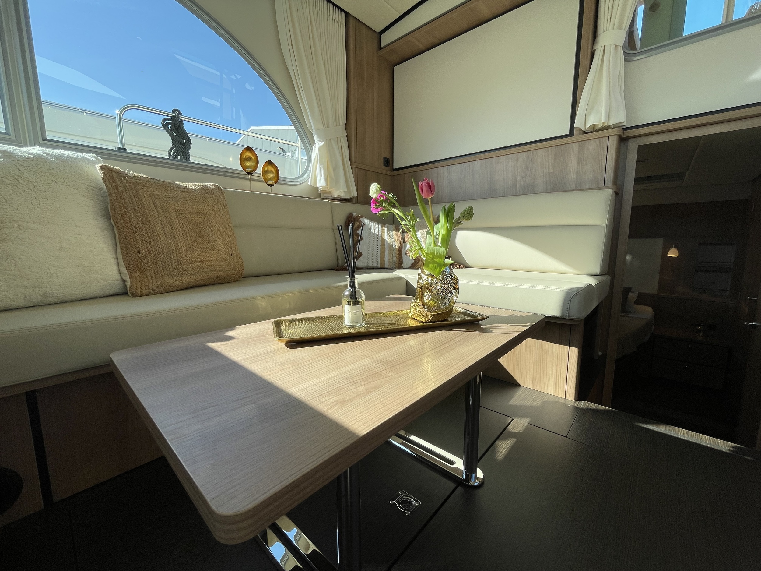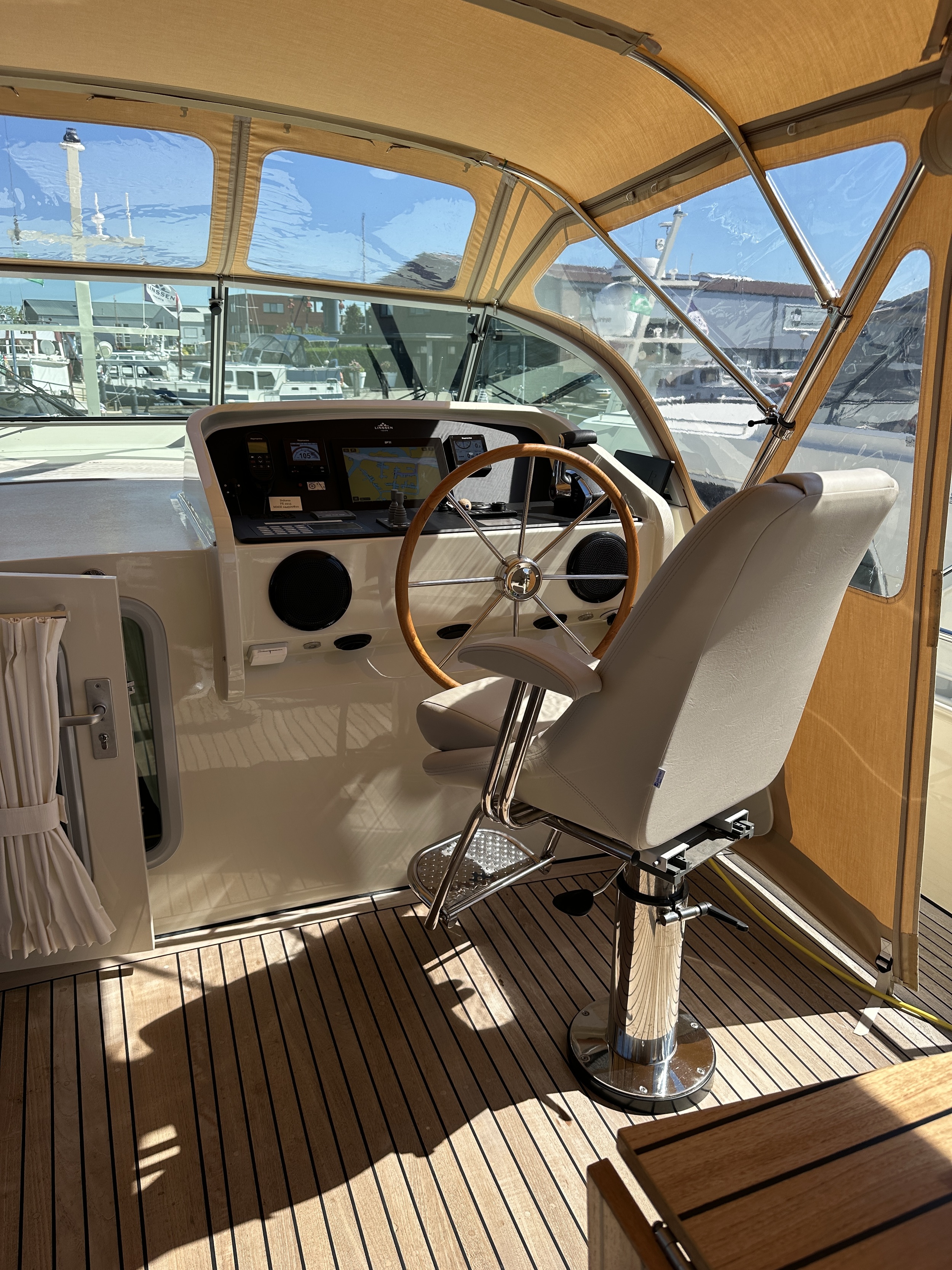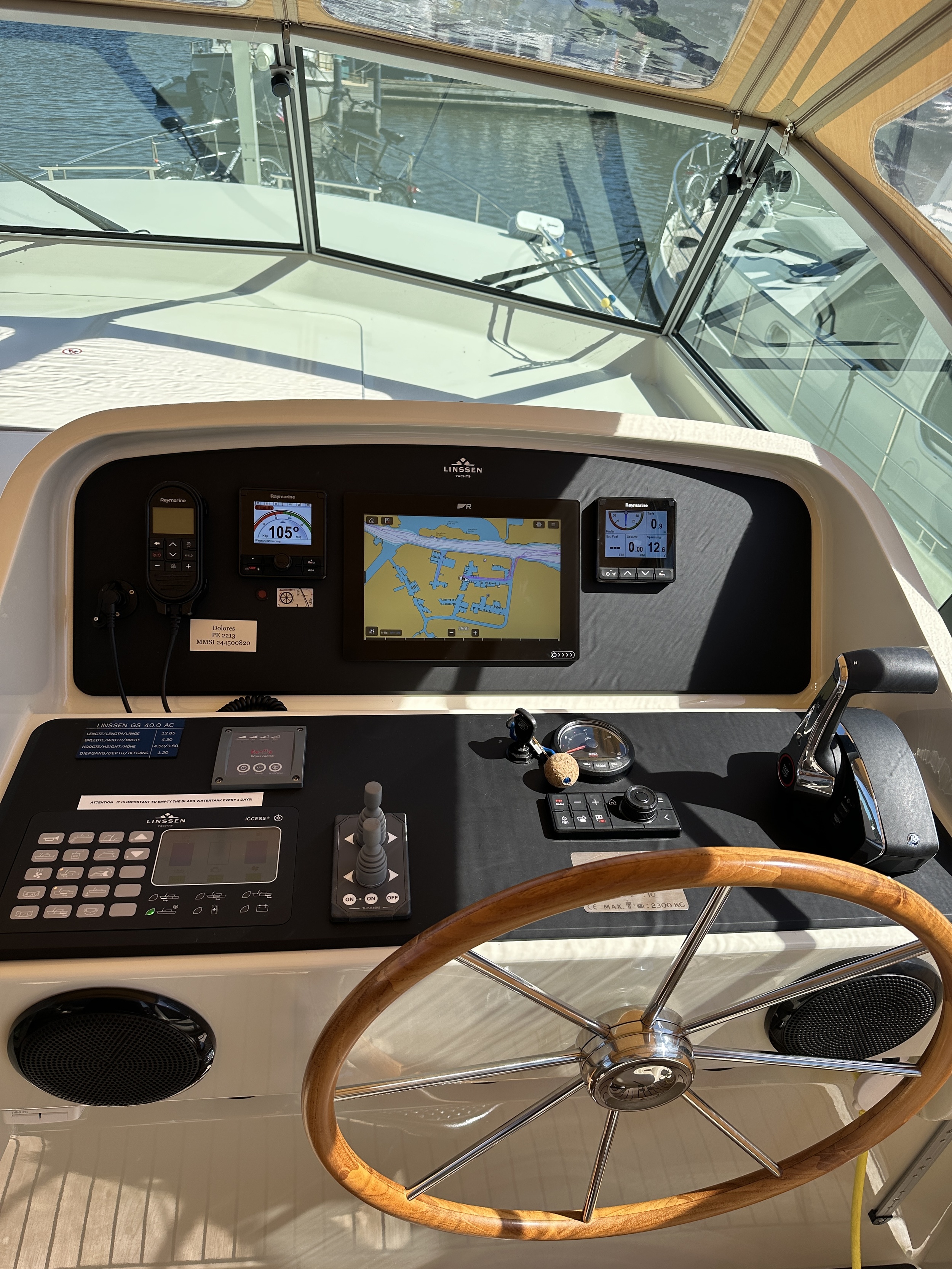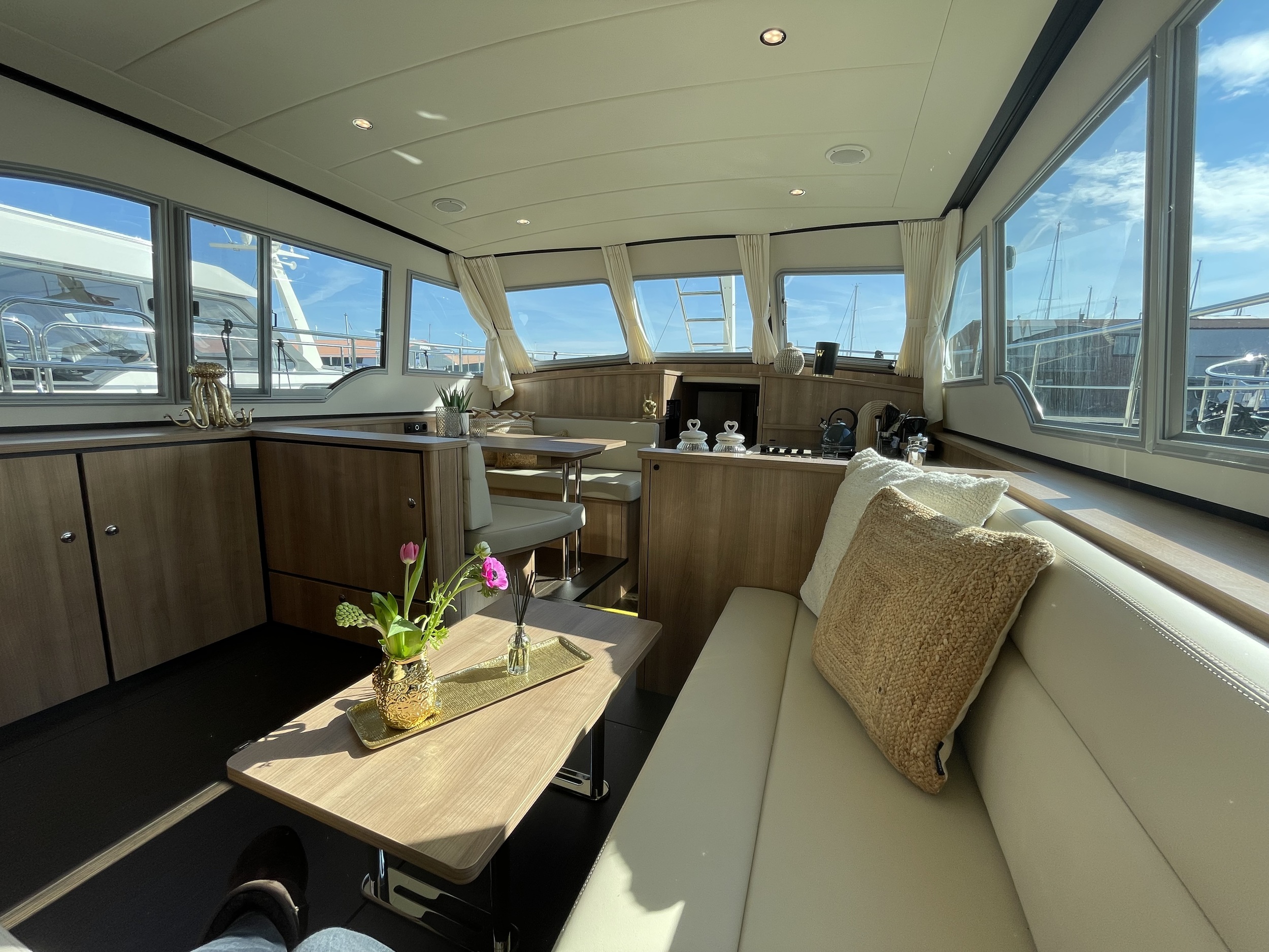 On deck is the steering position with a complete navigation package from Raymarine, including two plotters, AIS, a radar, a day and night camera, a bow and stern thruster and cameras all around. The galley is spacious and equipped with a ceramic 4-burner stove a spacious fridge freezer and an electric combination oven. There are also two additional coolers (drawers) on board and a 40-liter freezer. Furthermore, built-in on board is a 4-G Wifi router. Throughout the yacht is extremely large closet space. In the saloon there is a spacious settee with an easy sleep system; a simple operation creates two extra beds. The salon offers a nice atmosphere with its beautiful light paneling and generous light. The aft deck has a spacious settee with an original Linssen deck cushion set, a fixed teak table on two high-gloss stainless steel legs and a fixed comfortable helm chair.