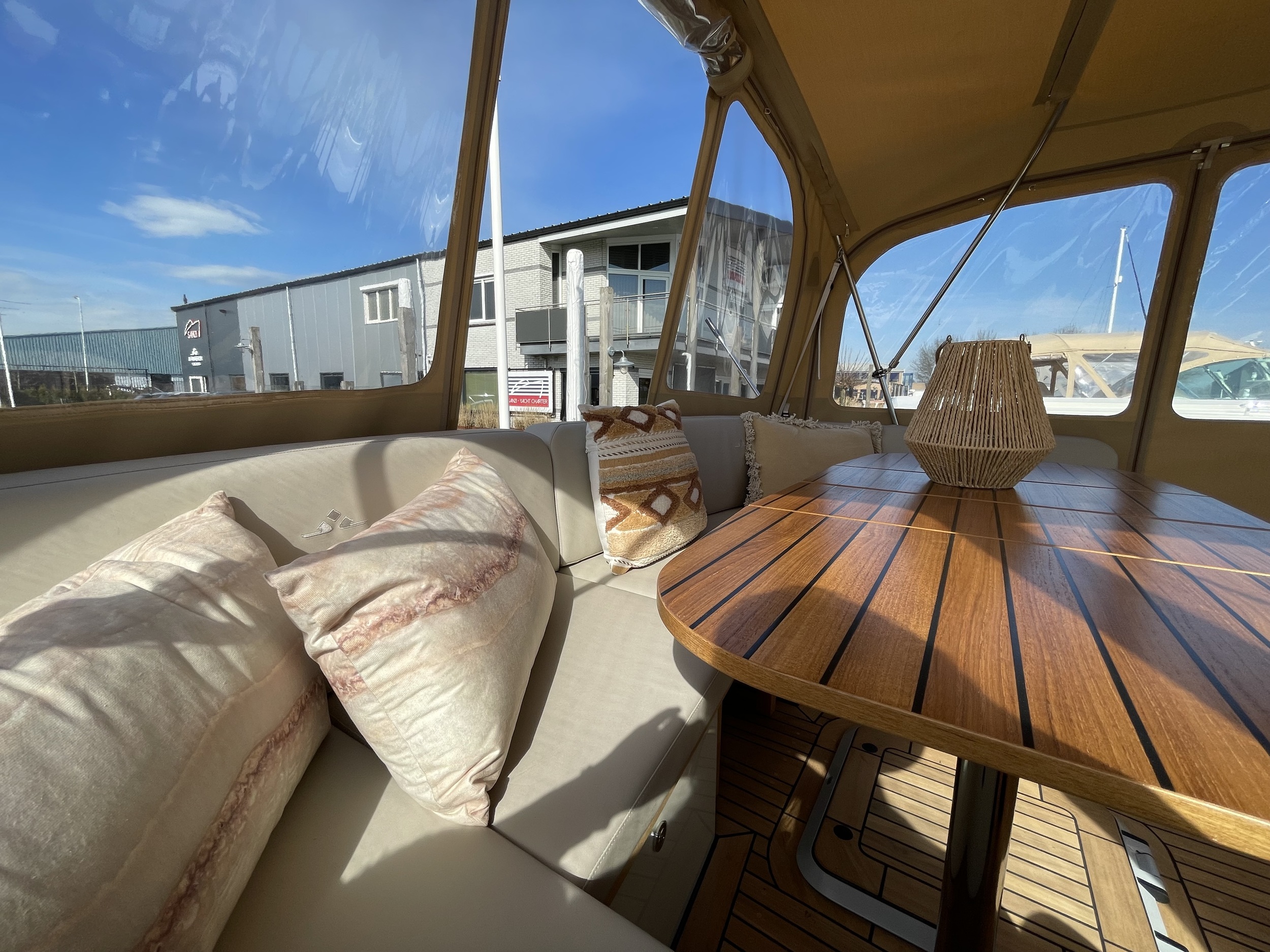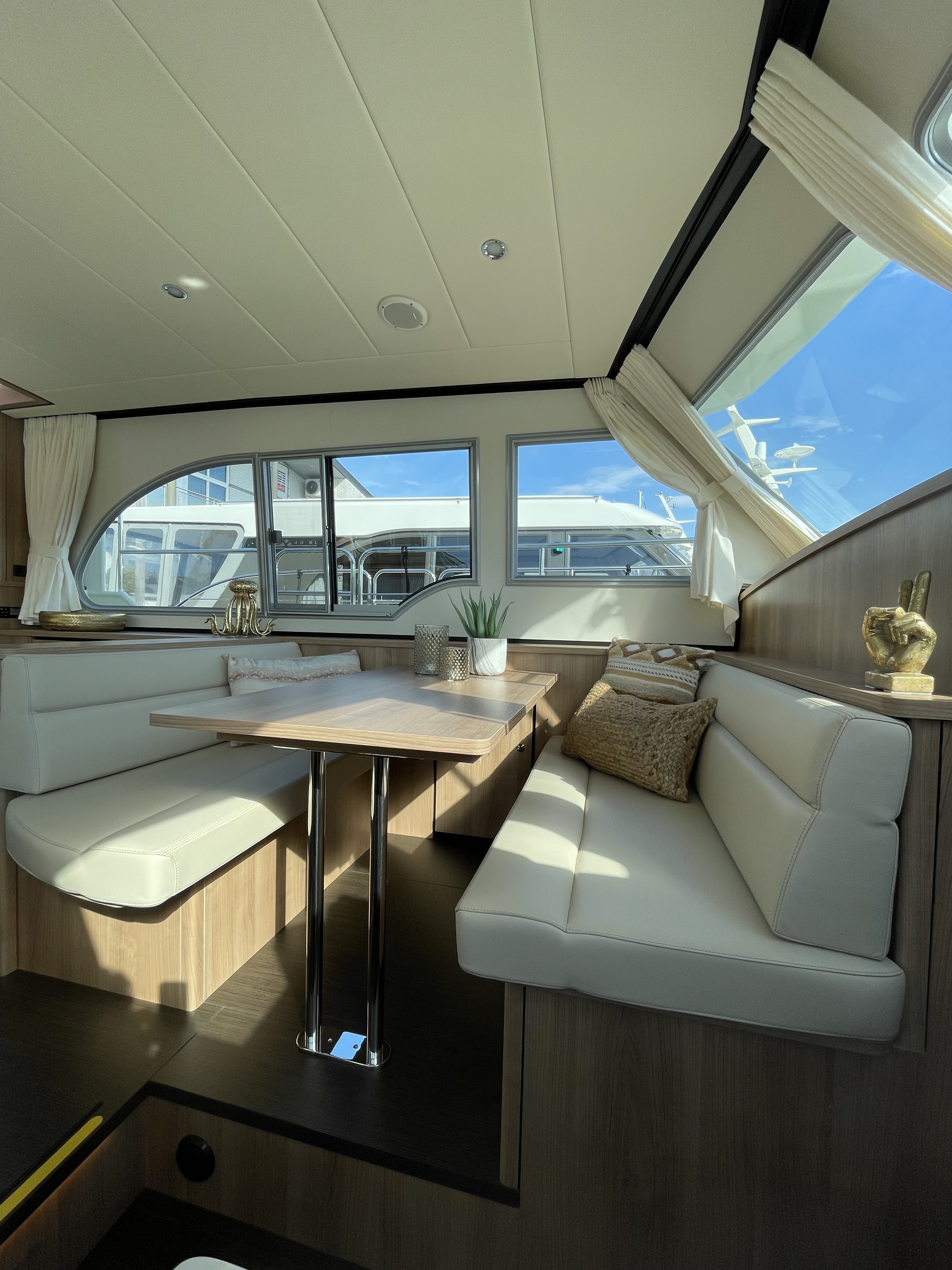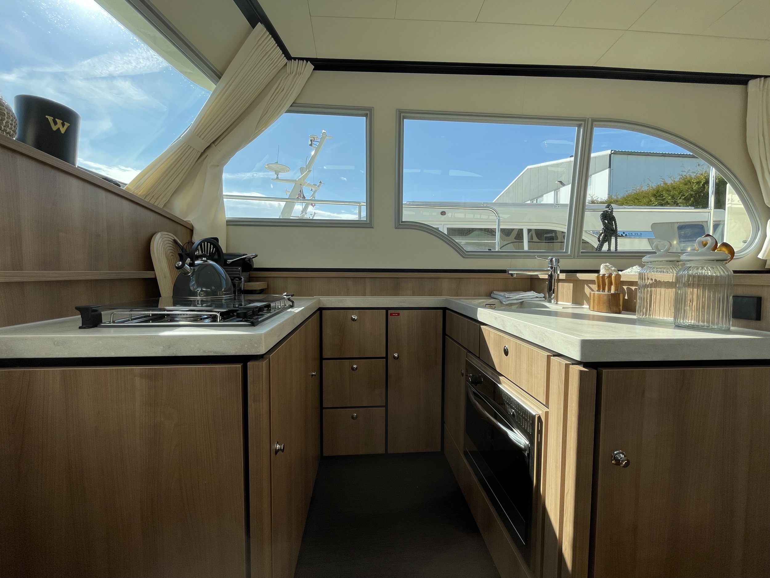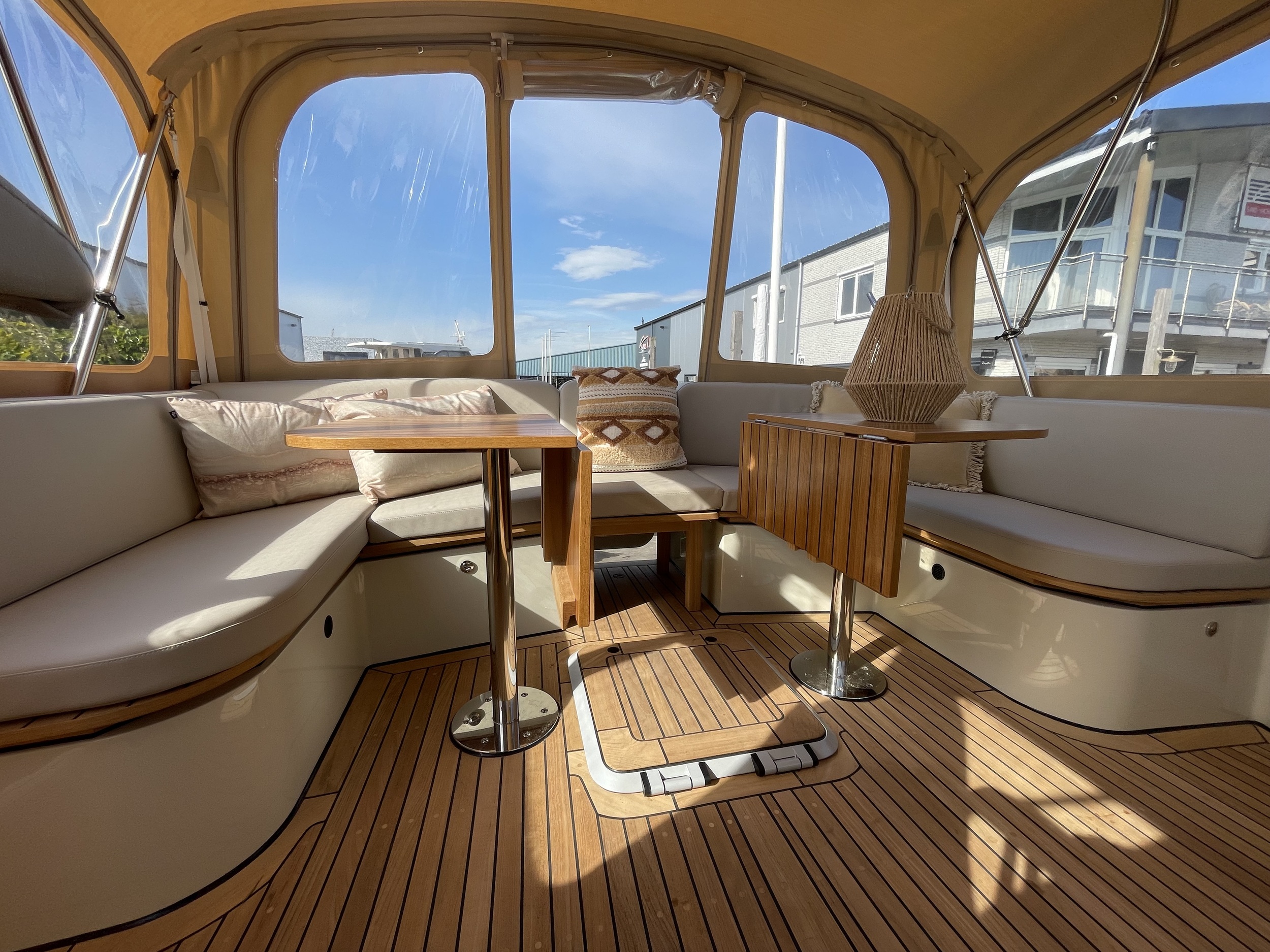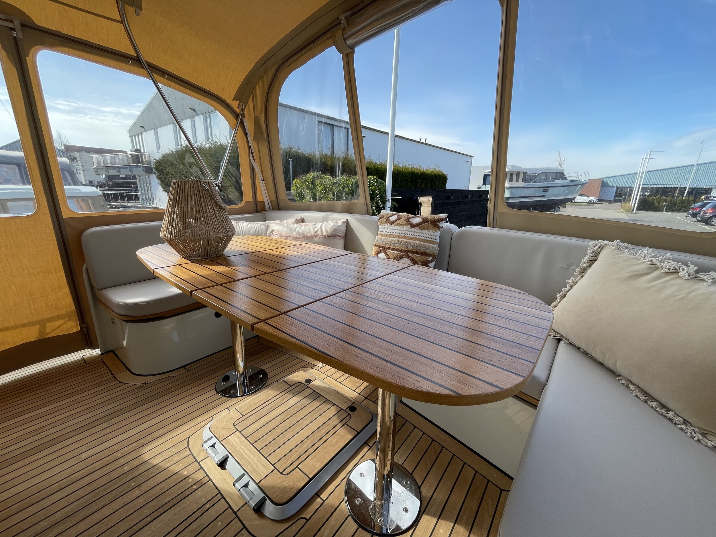 On deck is the steering position with a complete navigation package from Raymarine, including two plotters, AIS, a radar, a day and night camera, a bow and stern thruster and cameras all around. The galley is spacious and equipped with a ceramic 4-burner stove a spacious fridge freezer and an electric combination oven. There are also two additional coolers (drawers) on board and a 40-liter freezer. Furthermore, built-in on board is a 4-G Wifi router. Throughout the yacht is extremely large closet space. In the saloon there is a spacious settee with an easy sleep system; a simple operation creates two extra beds. The salon offers a nice atmosphere with its beautiful light paneling and generous light. The aft deck has a spacious settee with an original Linssen deck cushion set, a fixed teak table on two high-gloss stainless steel legs and a fixed comfortable helm chair.