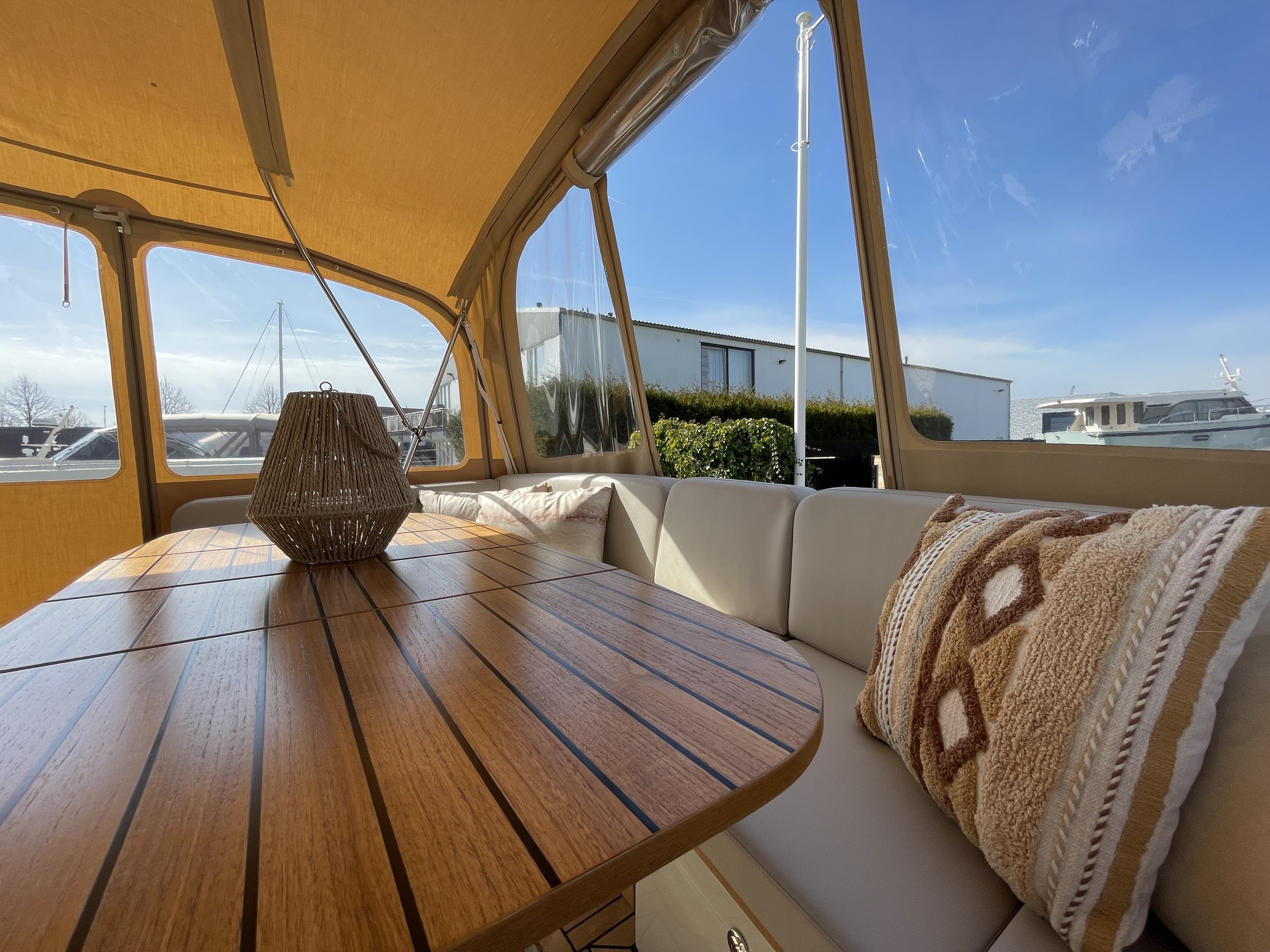 This area is completely lockable with tent sections in the color Sand. The aft deck is heatable and can easily accommodate 6-8 people.