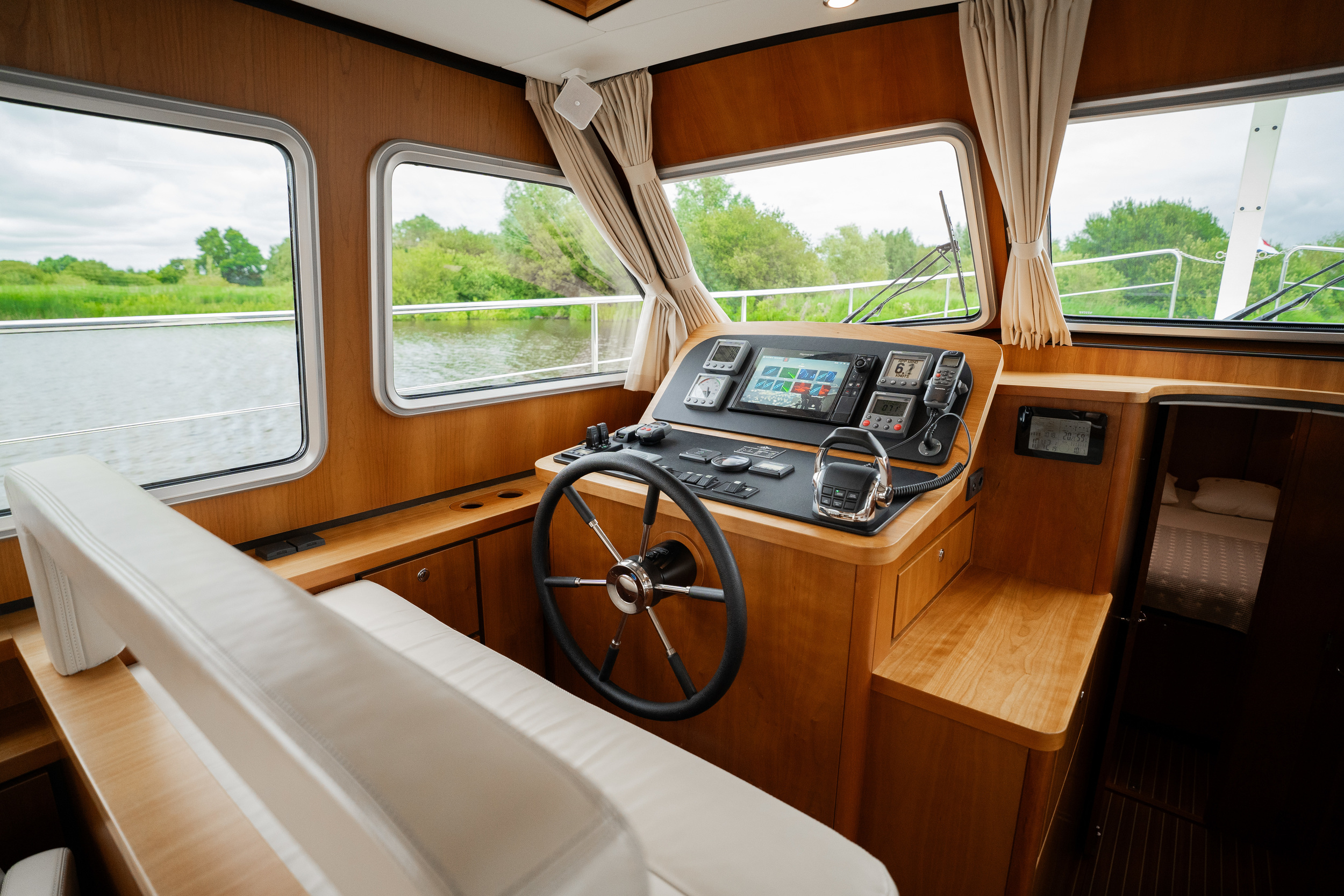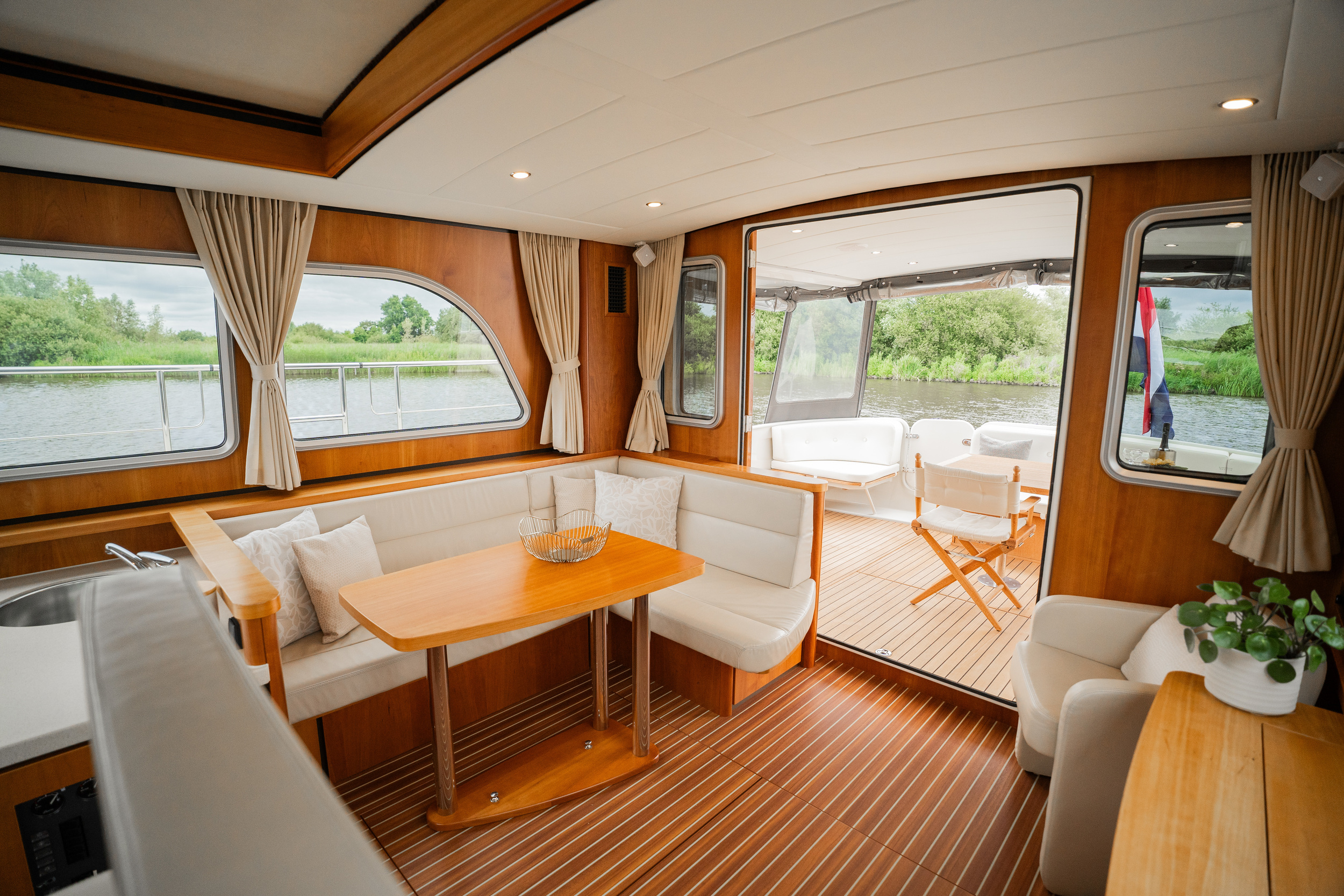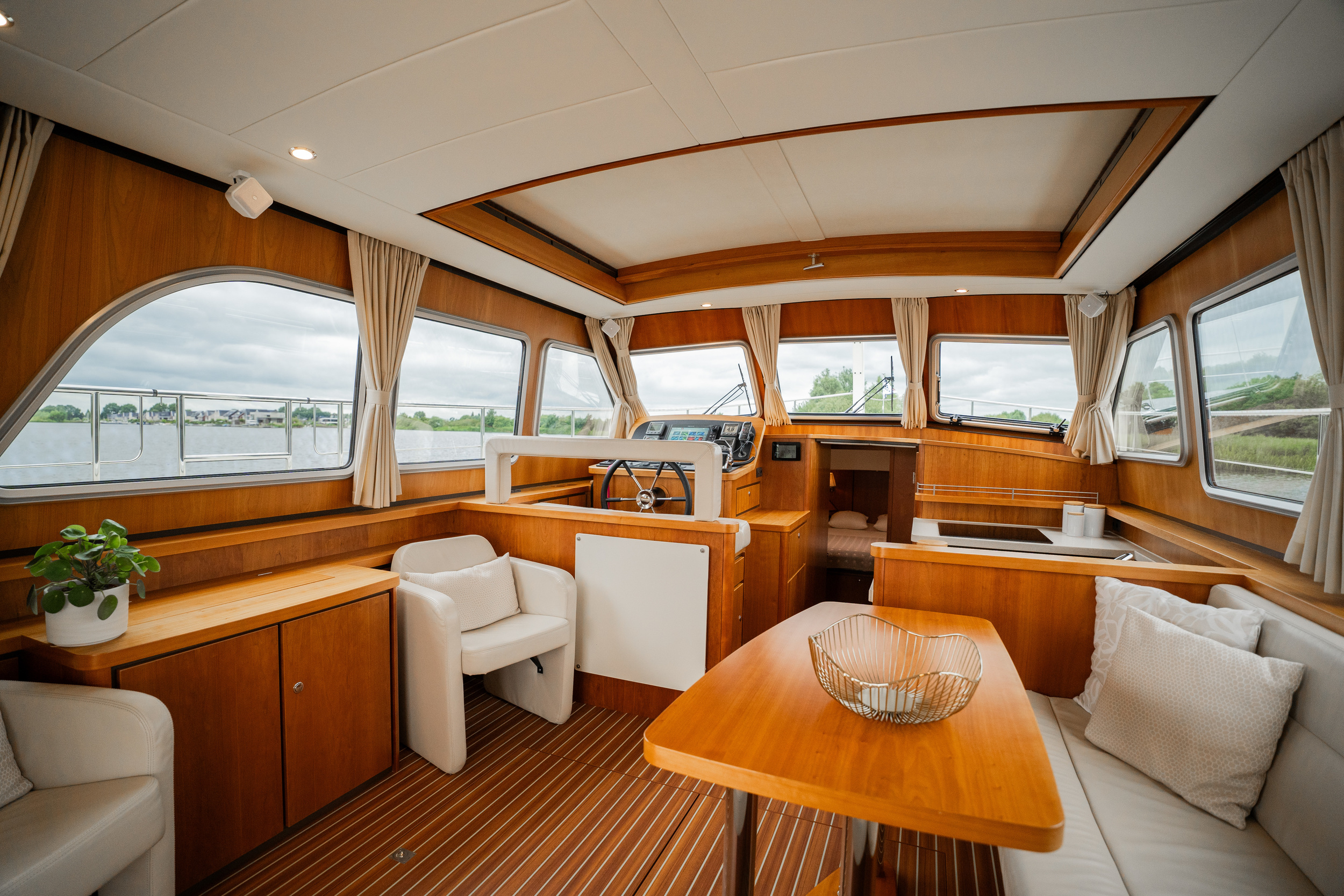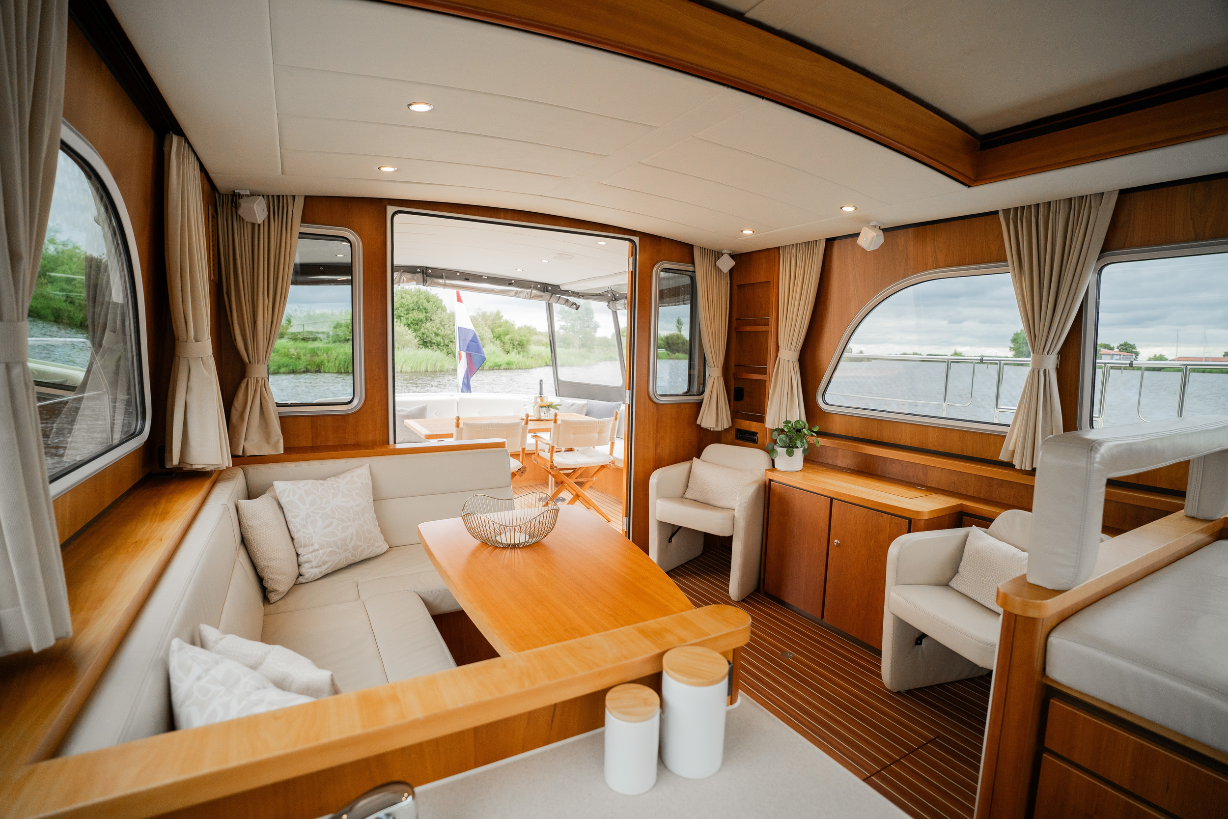 On the port side is the helm station with a complete navigation package and bow and stern thruster. The yacht features a spacious forward cabin with a double bed with a slatted bed base and quality mattresses. Midships there is a second cabin with two single beds. This yacht is equipped with a powerful generator. The galley is spacious and equipped with an induction stove, a spacious refrigerator with freezer compartment and a combination oven. Throughout the yacht is extremely ample closet space. In the salon there is a spacious settee equipped with the easy sleep system; a simple operation creates two extra beds. The salon offers a nice atmosphere with its beautiful light paneling and generous light. The open cockpit, which extends into the salon with folding doors, is a very spacious corner seat with an original Linssen cushion set and a robust fixed table on two high-gloss stainless steel legs. This space is completely lockable with tent sections in the color Sand. The cockpit is fully heatable and can easily accommodate at least eight people.