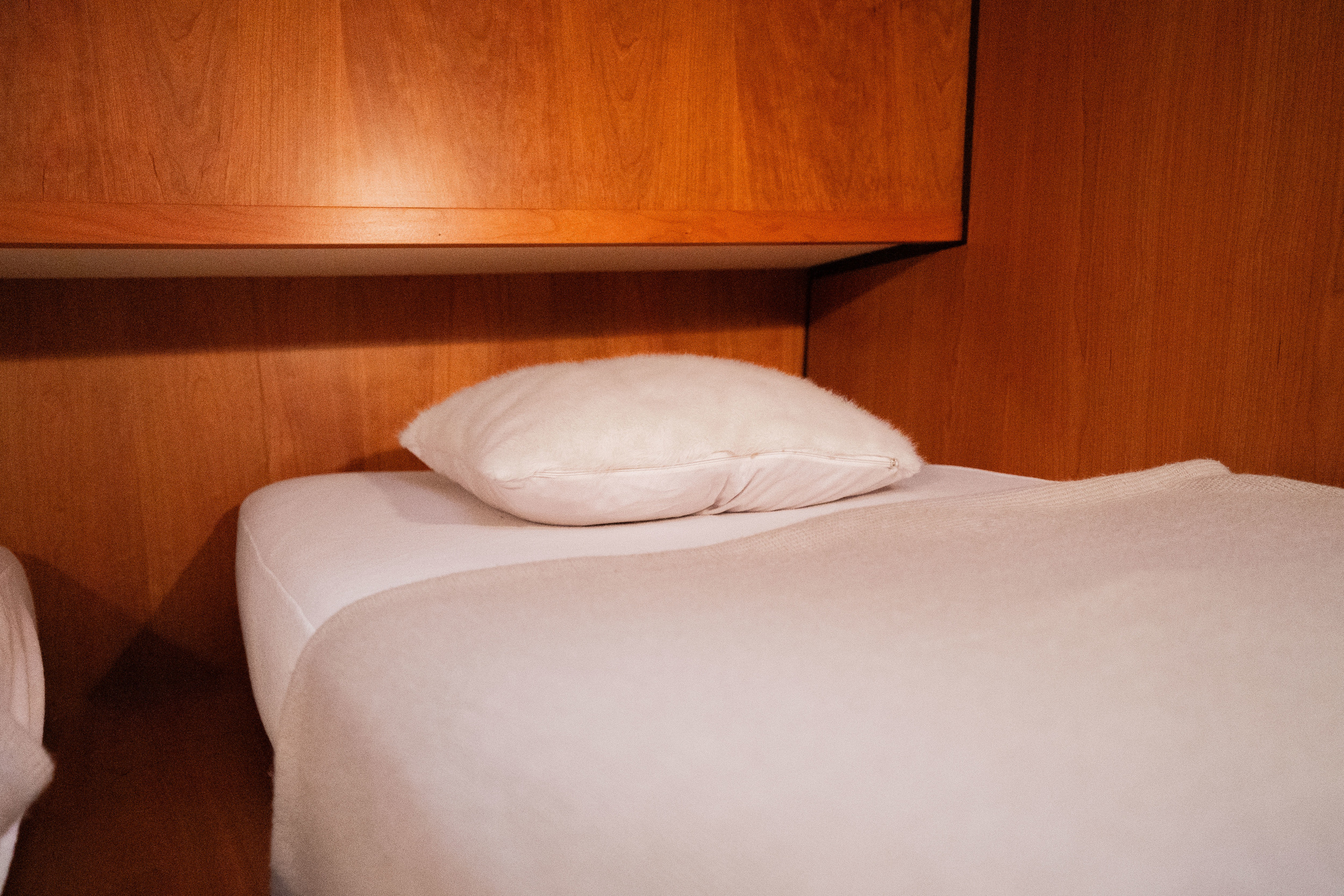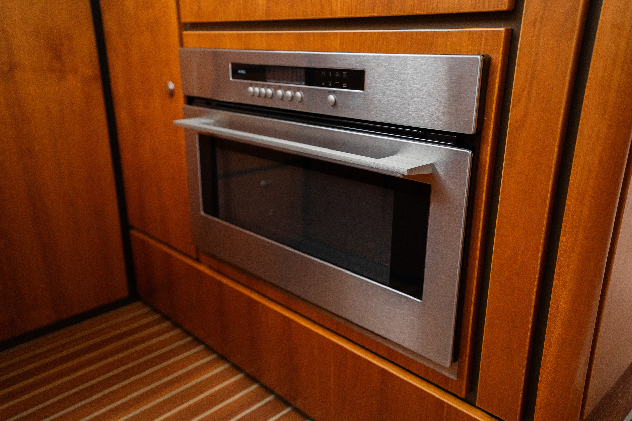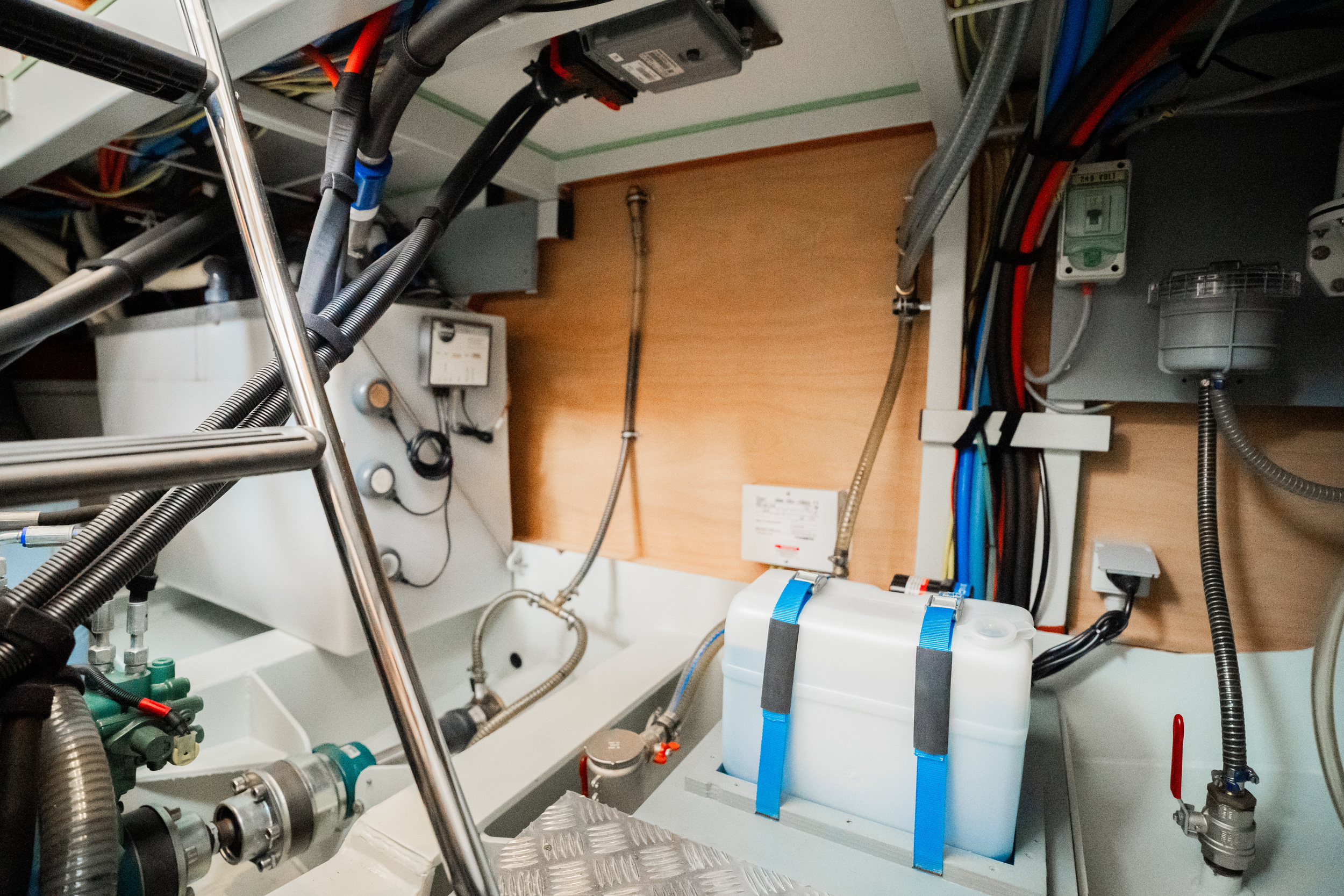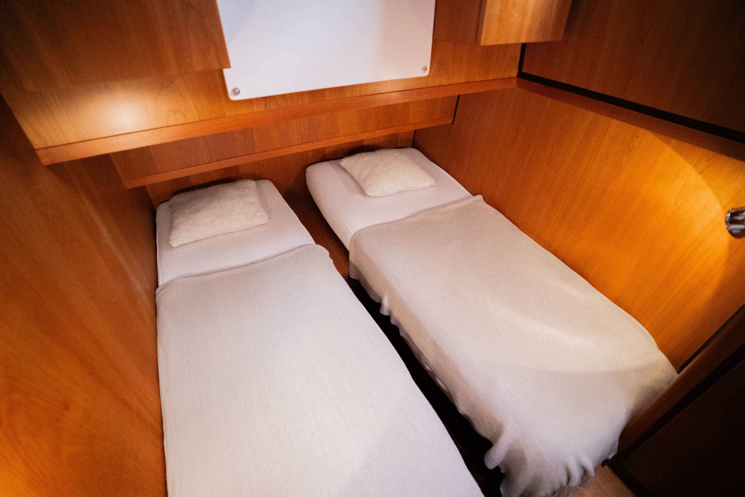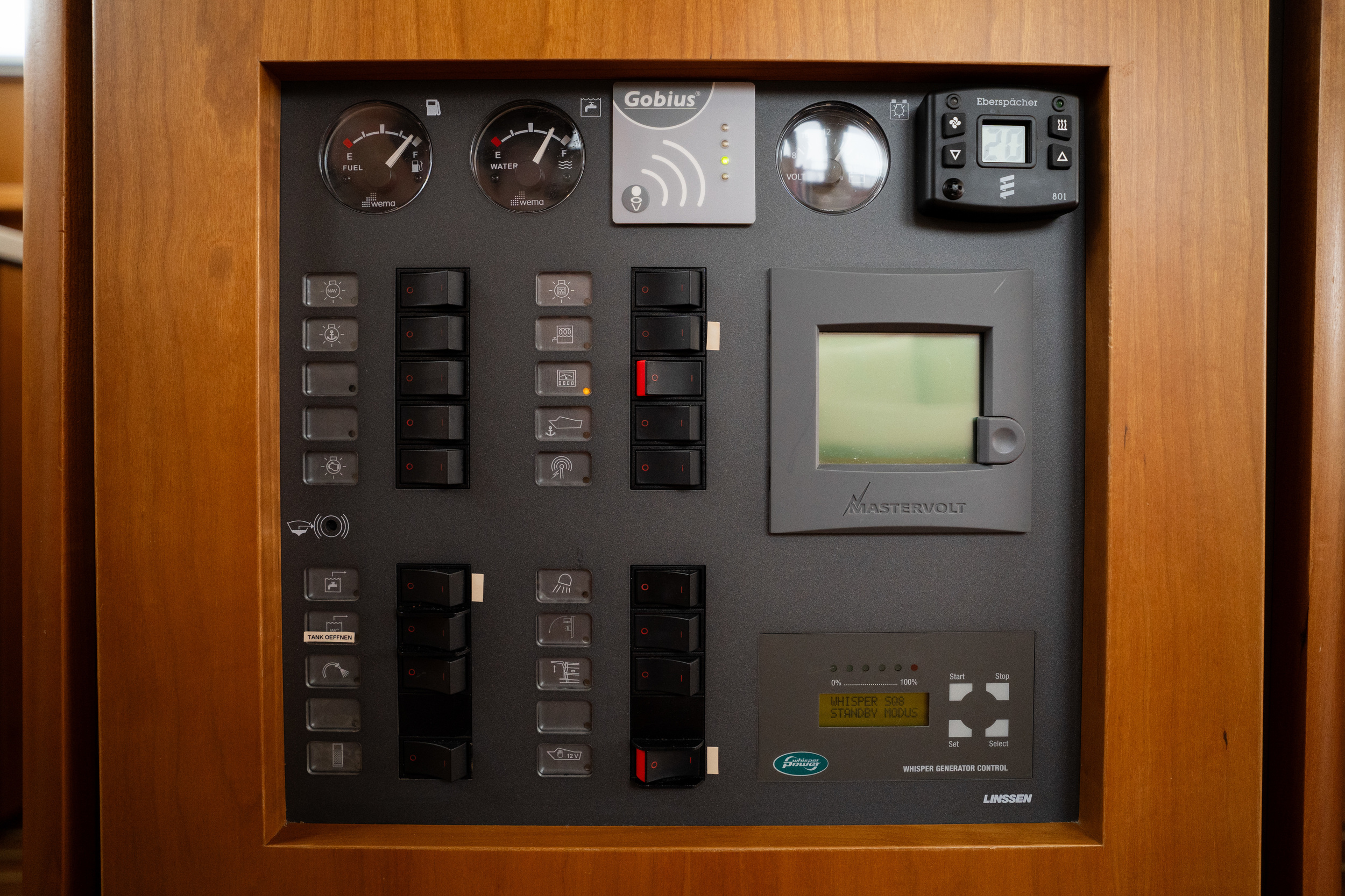 On the port side is the helm station with a complete navigation package and bow and stern thruster. The yacht features a spacious forward cabin with a double bed with a slatted bed base and quality mattresses. Midships there is a second cabin with two single beds. This yacht is equipped with a powerful generator. The galley is spacious and equipped with an induction stove, a spacious refrigerator with freezer compartment and a combination oven. Throughout the yacht is extremely ample closet space. In the salon there is a spacious settee equipped with the easy sleep system; a simple operation creates two extra beds. The salon offers a nice atmosphere with its beautiful light paneling and generous light. The open cockpit, which extends into the salon with folding doors, is a very spacious corner seat with an original Linssen cushion set and a robust fixed table on two high-gloss stainless steel legs. This space is completely lockable with tent sections in the color Sand. The cockpit is fully heatable and can easily accommodate at least eight people.