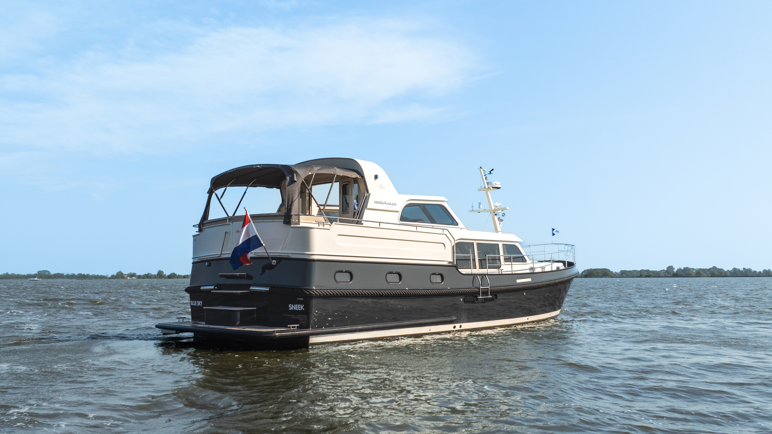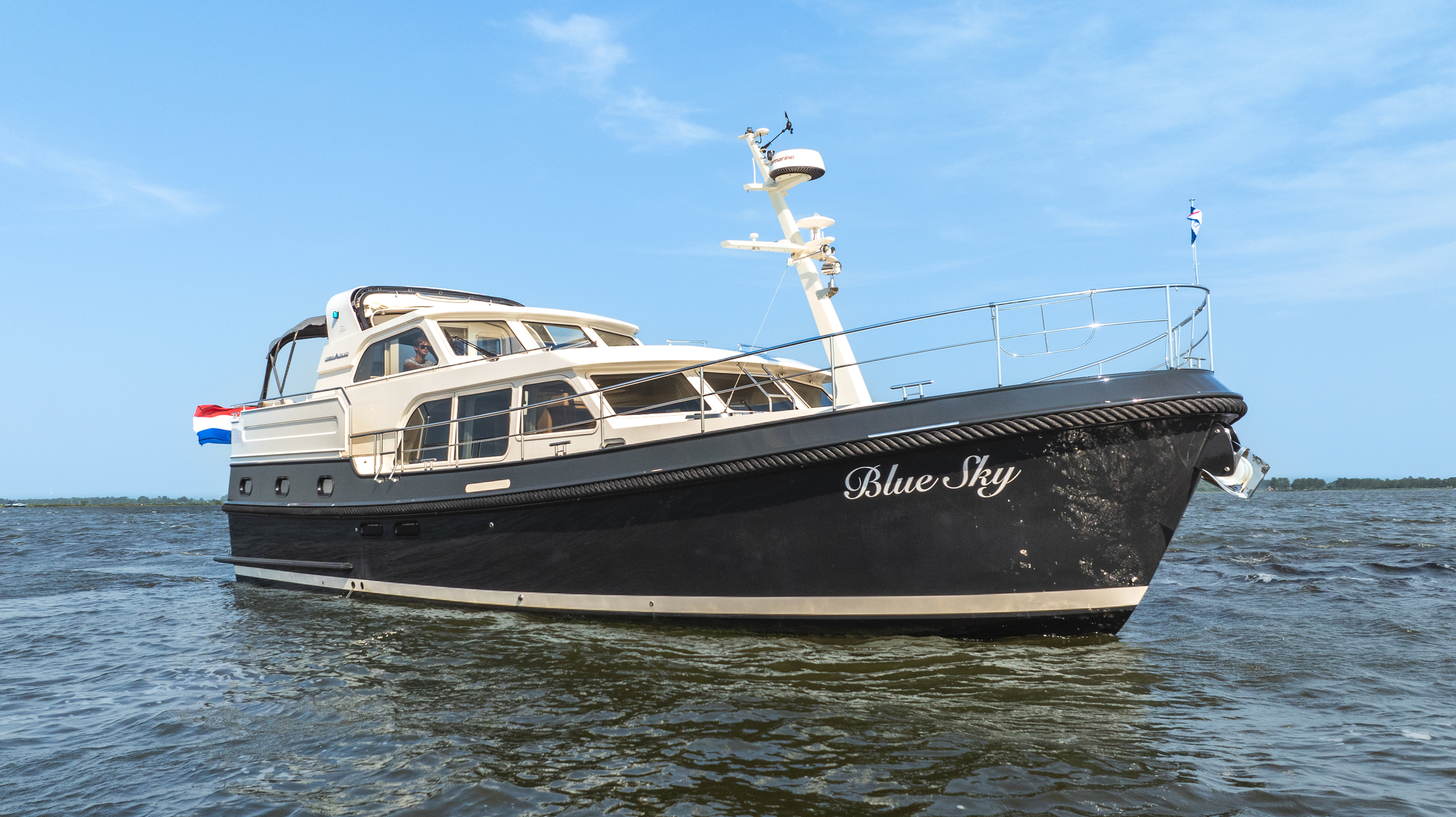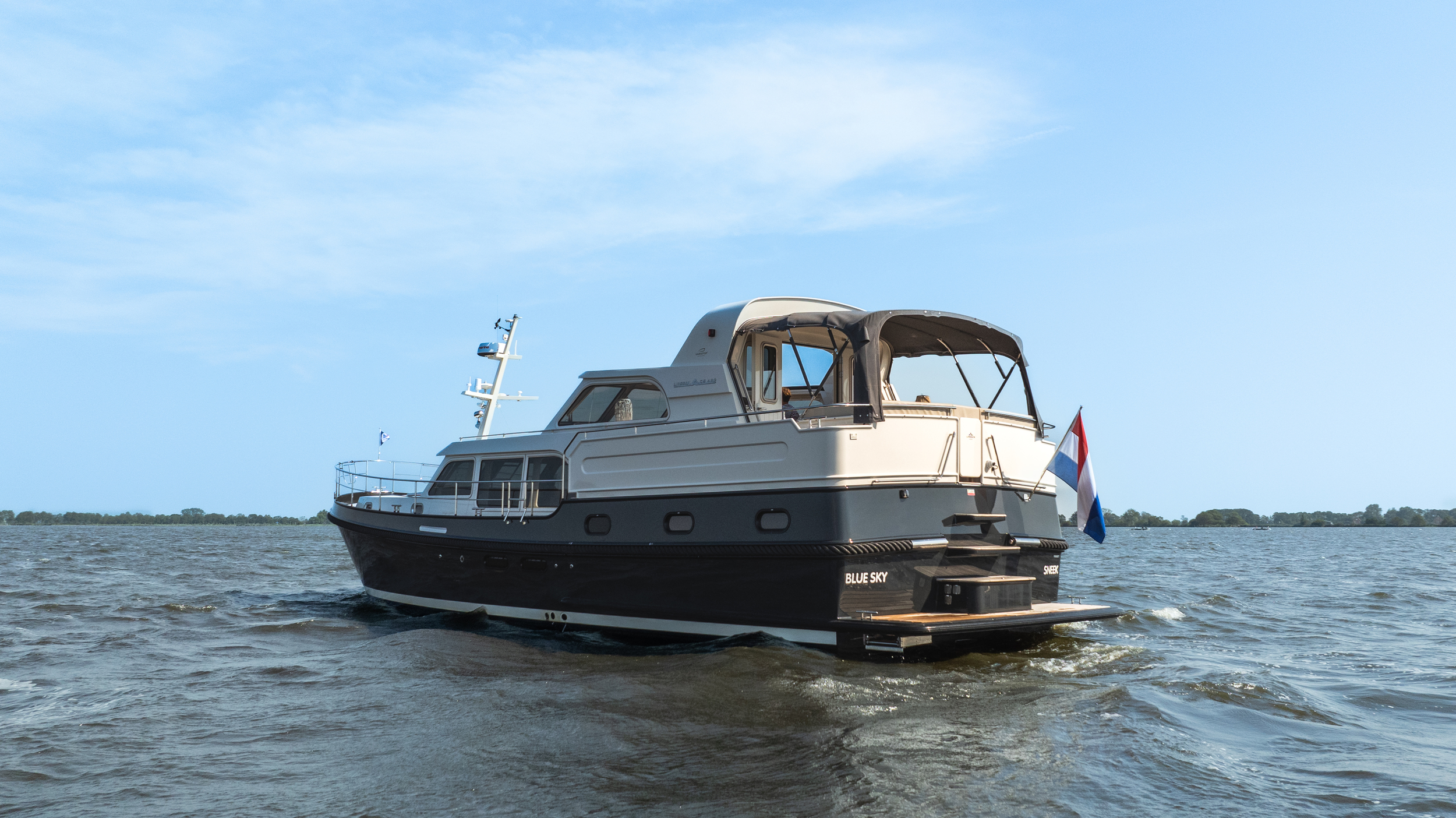A top model from Linssen Yachts with all the luxury options and with stabilizers and air conditioning. Fully equipped for even big waters (Blue Water) and long trips. Very chic yacht.