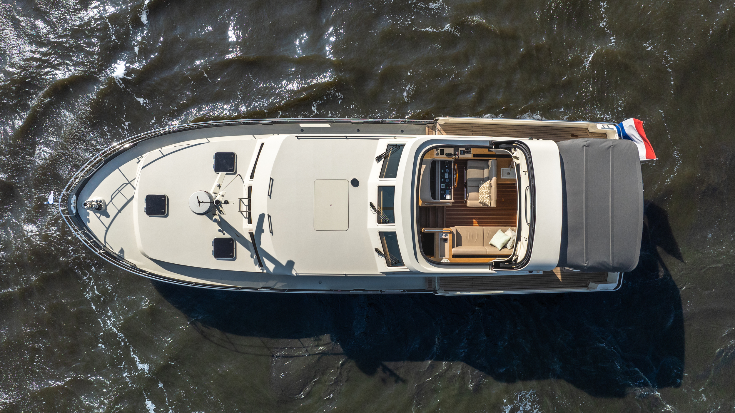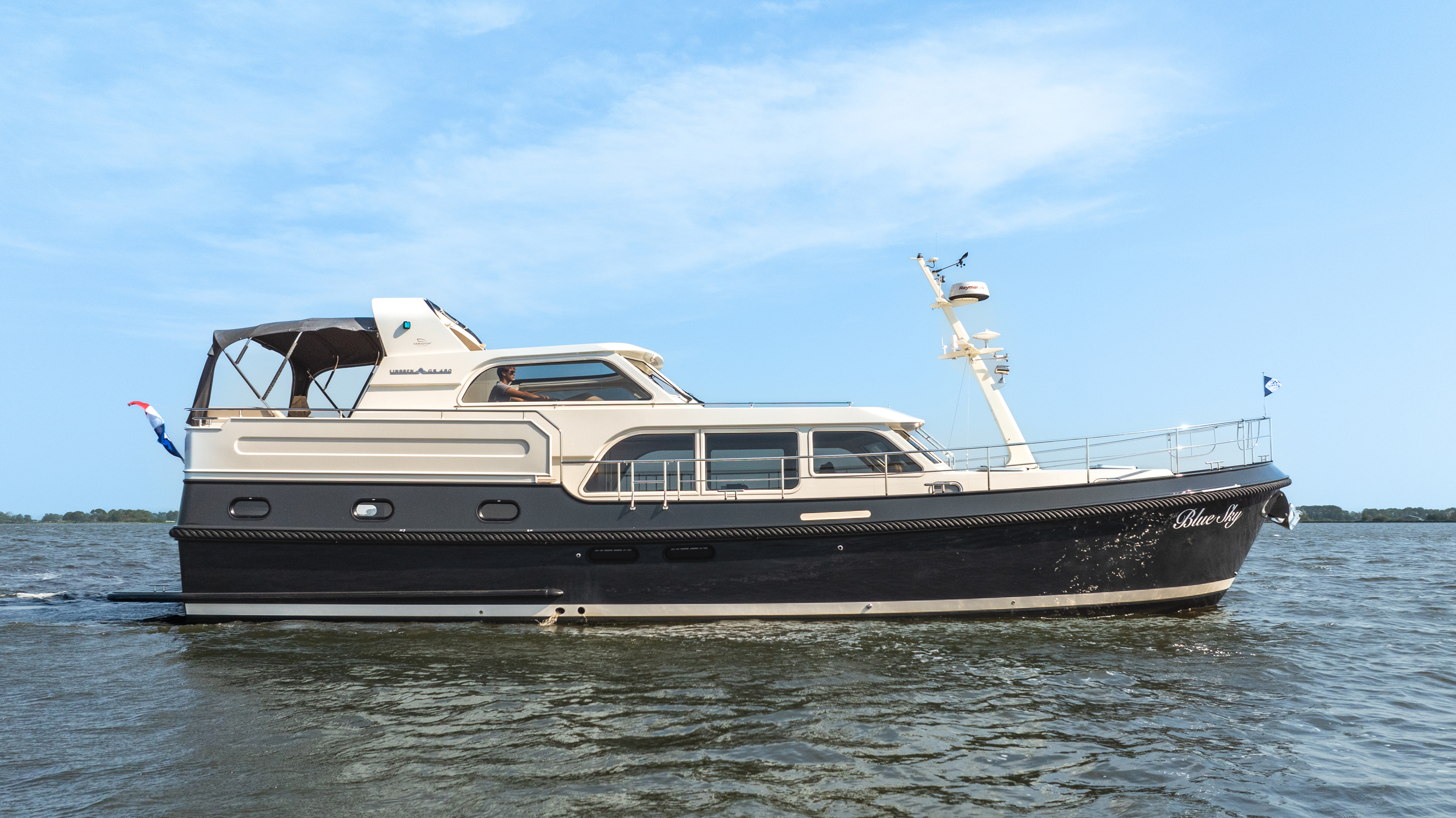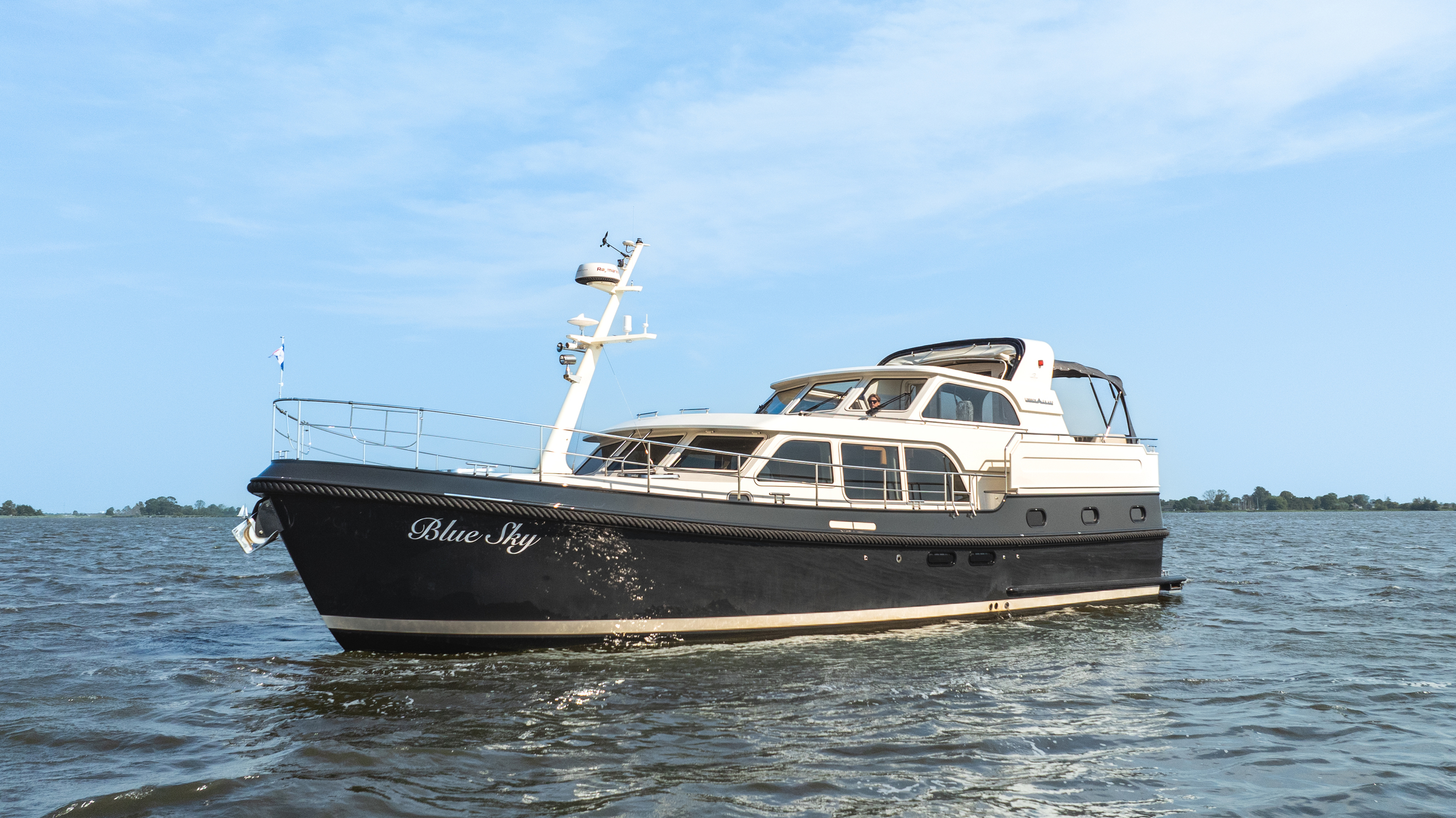 A top model from Linssen Yachts with all the luxury options and with stabilizers and air conditioning. Fully equipped for even big waters (Blue Water) and long trips. Very chic yacht.