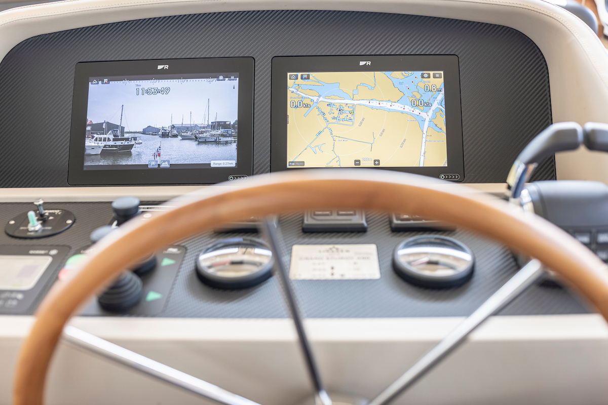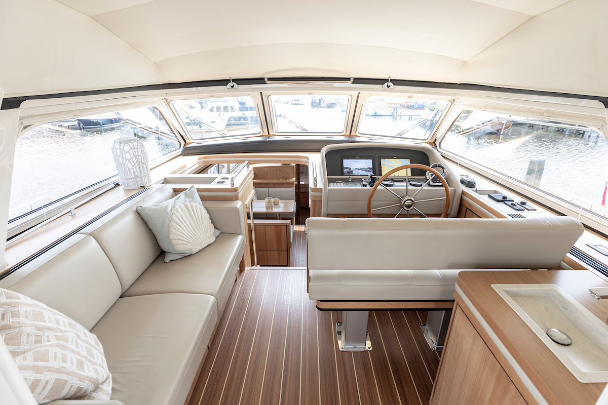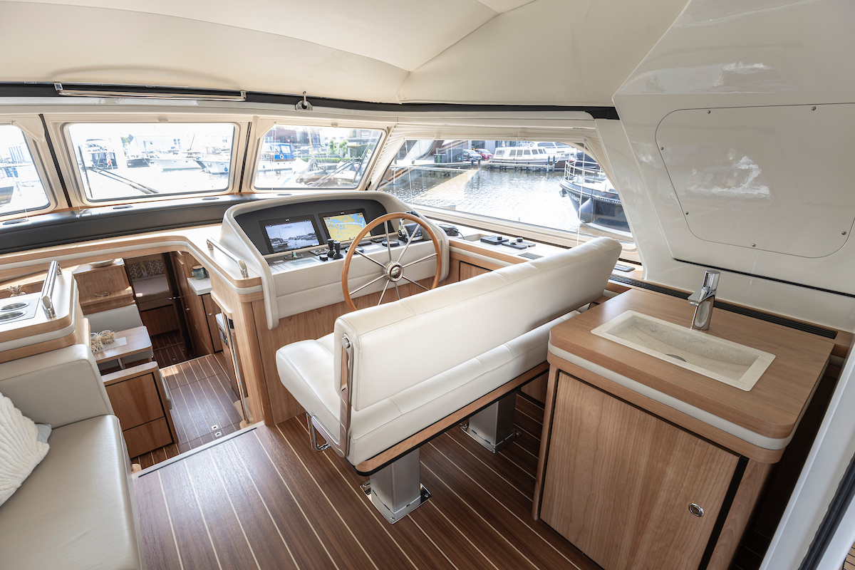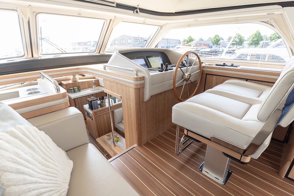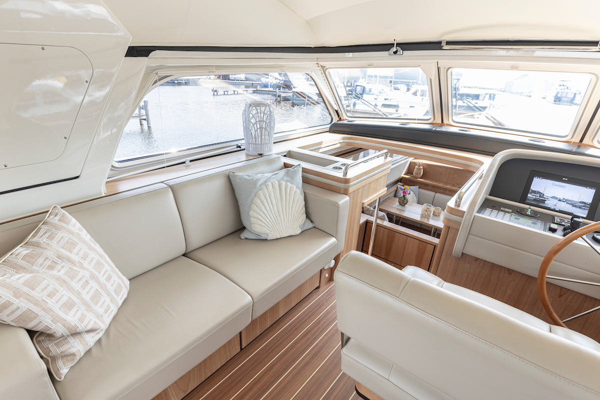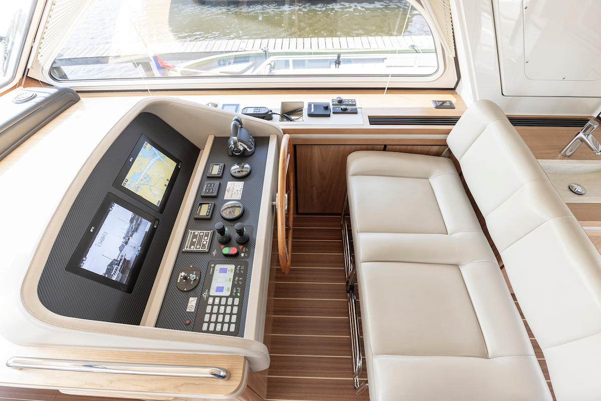In the wheelhouse is the dashboard with an extensive set of navigation equipment: double plotter screen, autopilot, AIS and radar, tiller steering, VHF radio, cameras around, Navionics map Europe, proportional powerful bow and stern thruster. Remote control via Yachtcontroller to operate bow and stern thruster and both engines. The steering position is equipped with a luxurious leather two-person steering bench which can be electrically adjusted to any position. In the steering bench is a small extendable bar table. Behind the steering bench is a kitchenette with a sink and a refrigerator. In the wheelhouse is a second bench on the port side.
