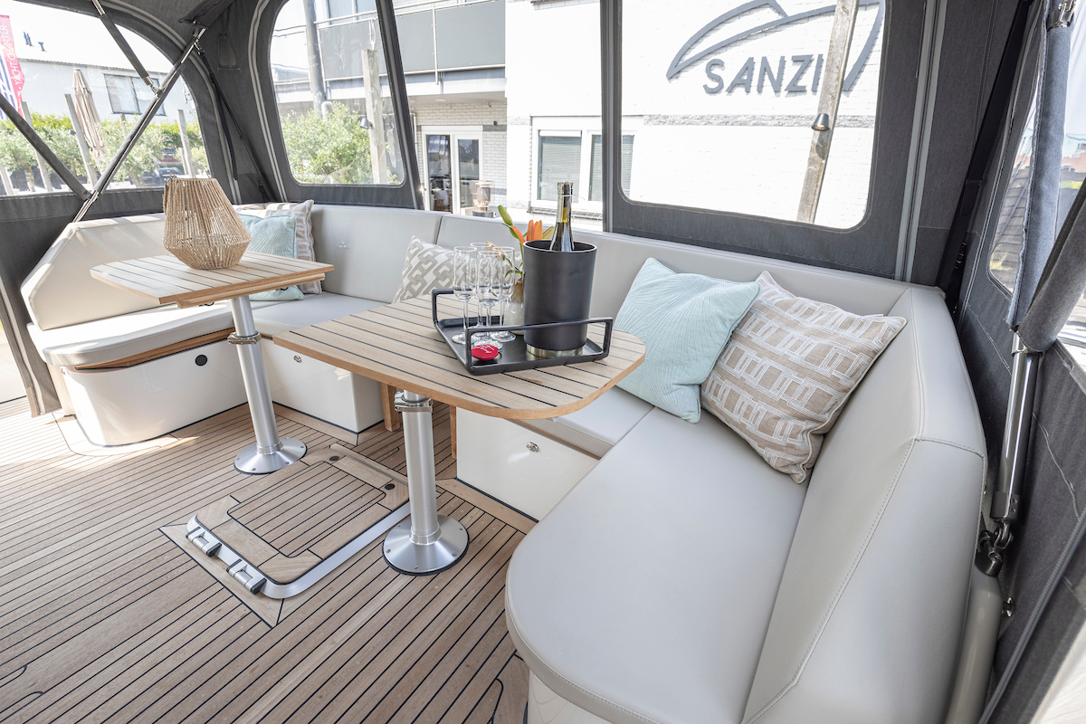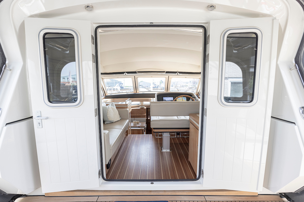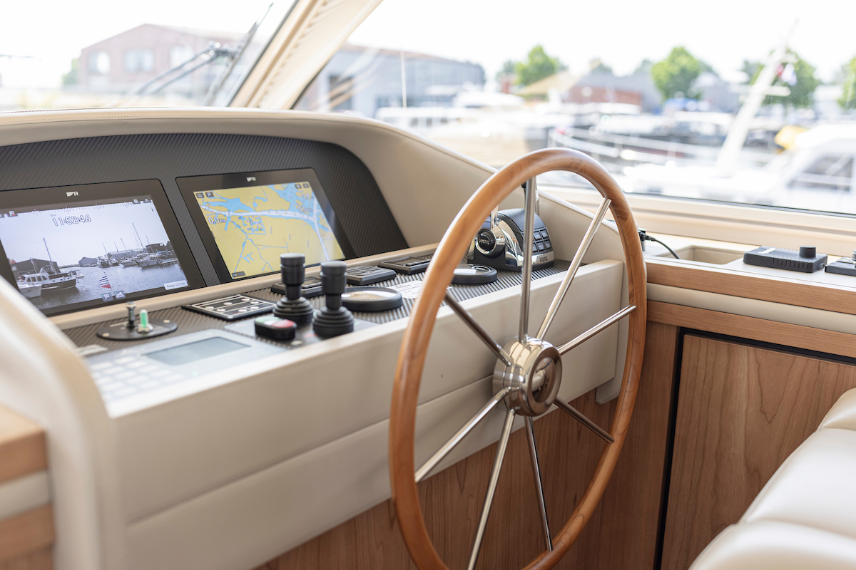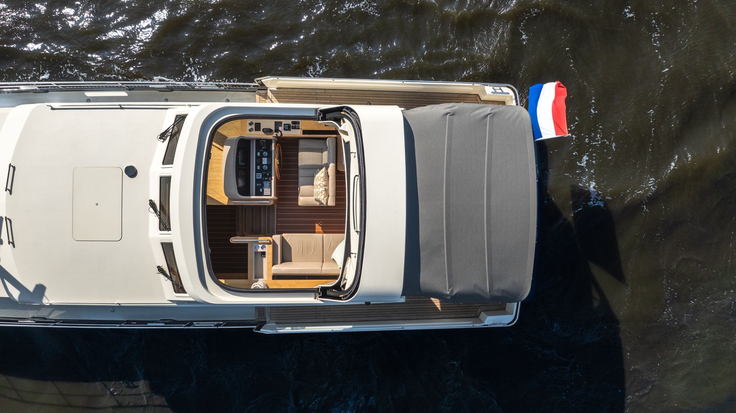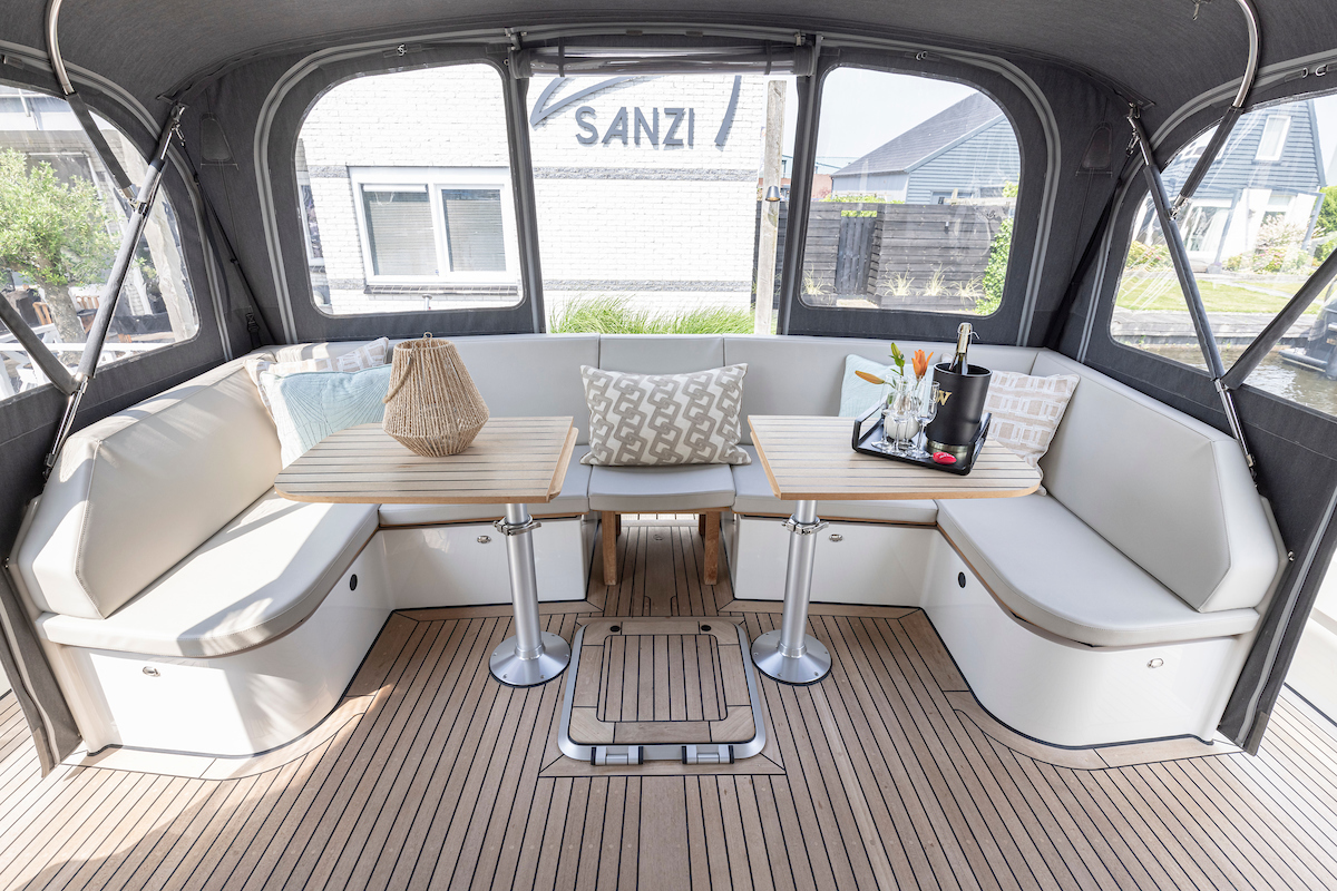 In the wheelhouse is the dashboard with an extensive set of navigation equipment: double plotter screen, autopilot, AIS and radar, tiller steering, VHF radio, cameras around, Navionics map Europe, proportional powerful bow and stern thruster. Remote control via Yachtcontroller to operate bow and stern thruster and both engines. The steering position is equipped with a luxurious leather two-person steering bench which can be electrically adjusted to any position. In the steering bench is a small extendable bar table. Behind the steering bench is a kitchenette with a sink and a refrigerator. In the wheelhouse is a second bench on the port side.