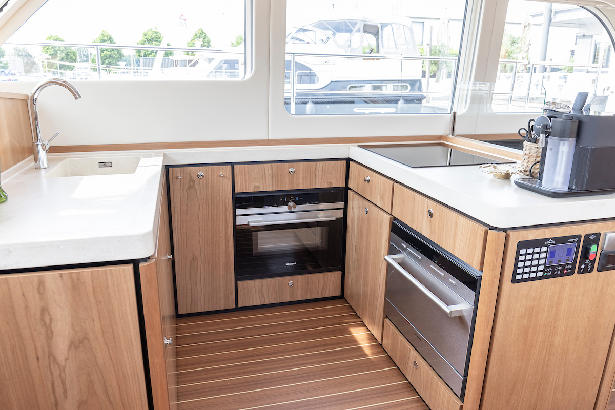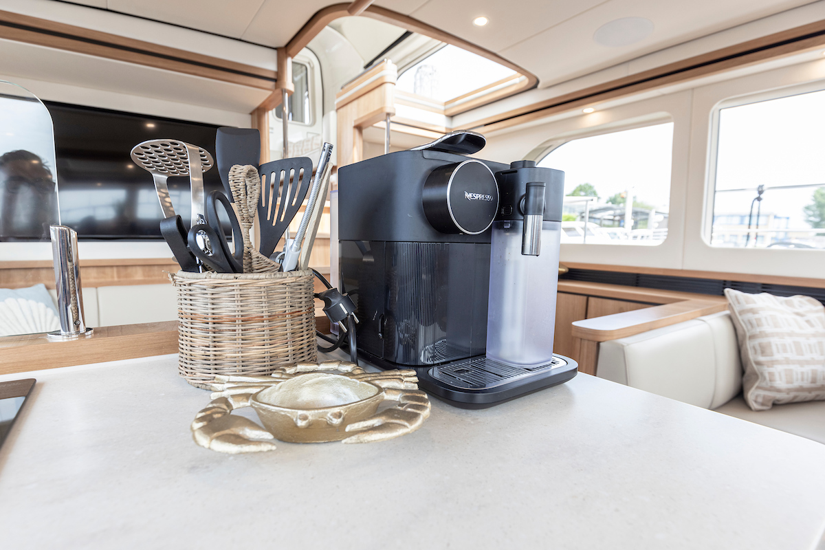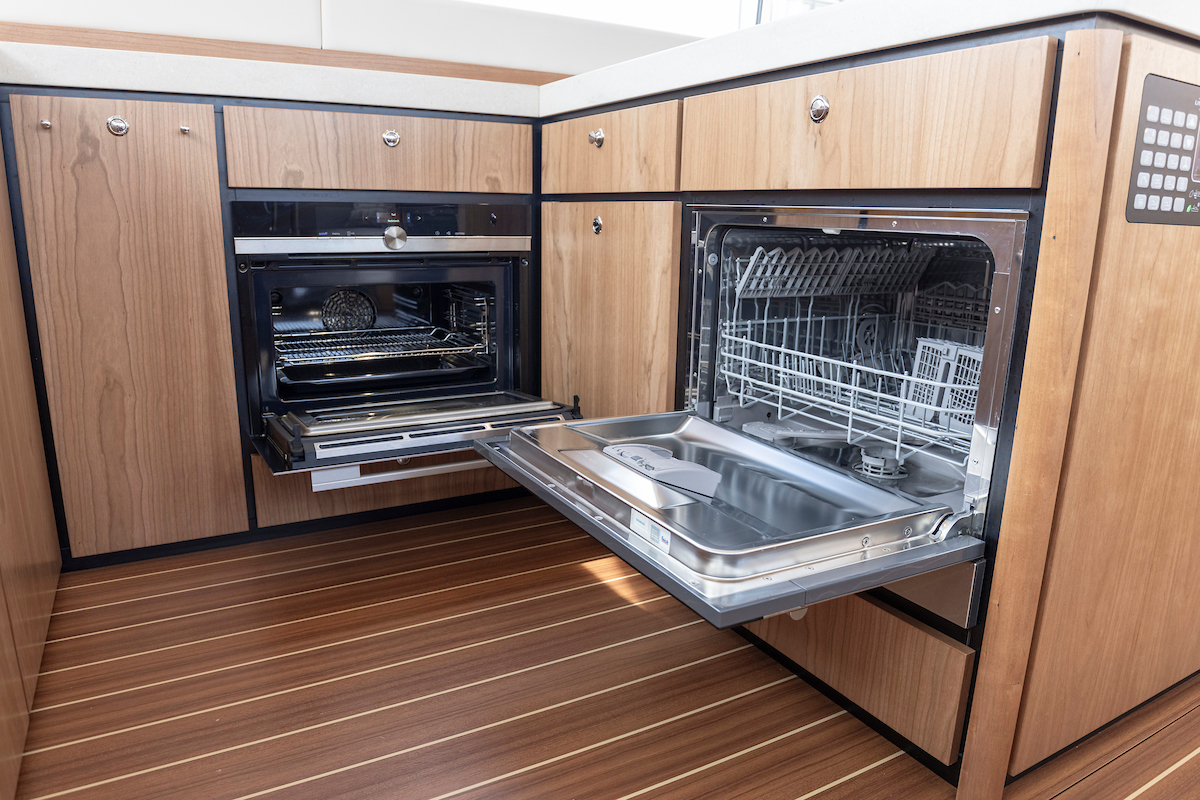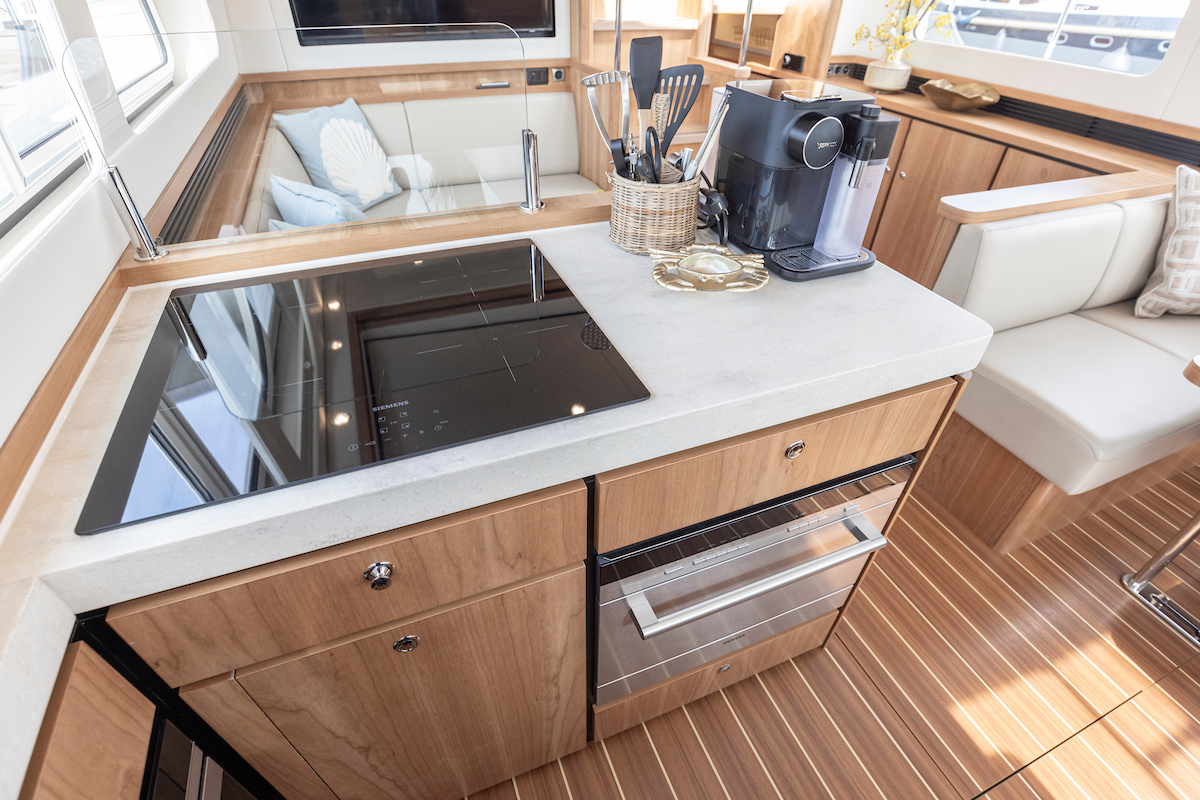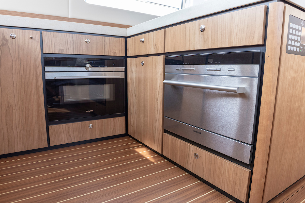 The galley is generous and bright and equipped with an induction cooktop, a combination oven (microwave and hot air oven), a dishwasher and a deluxe version of the Nespresso coffee maker.