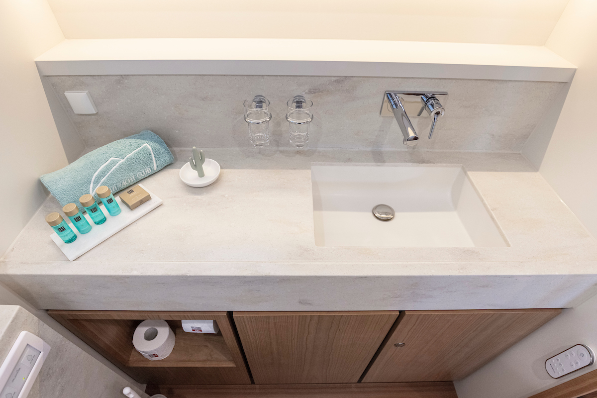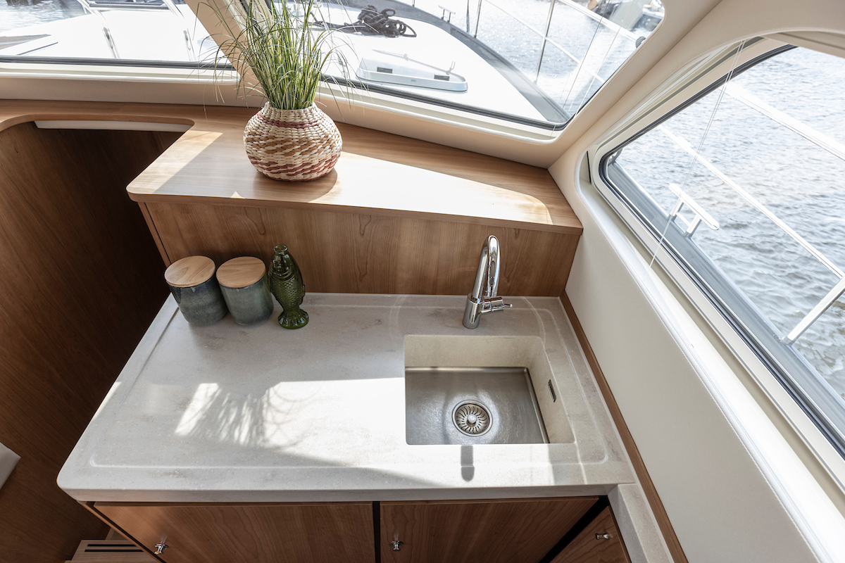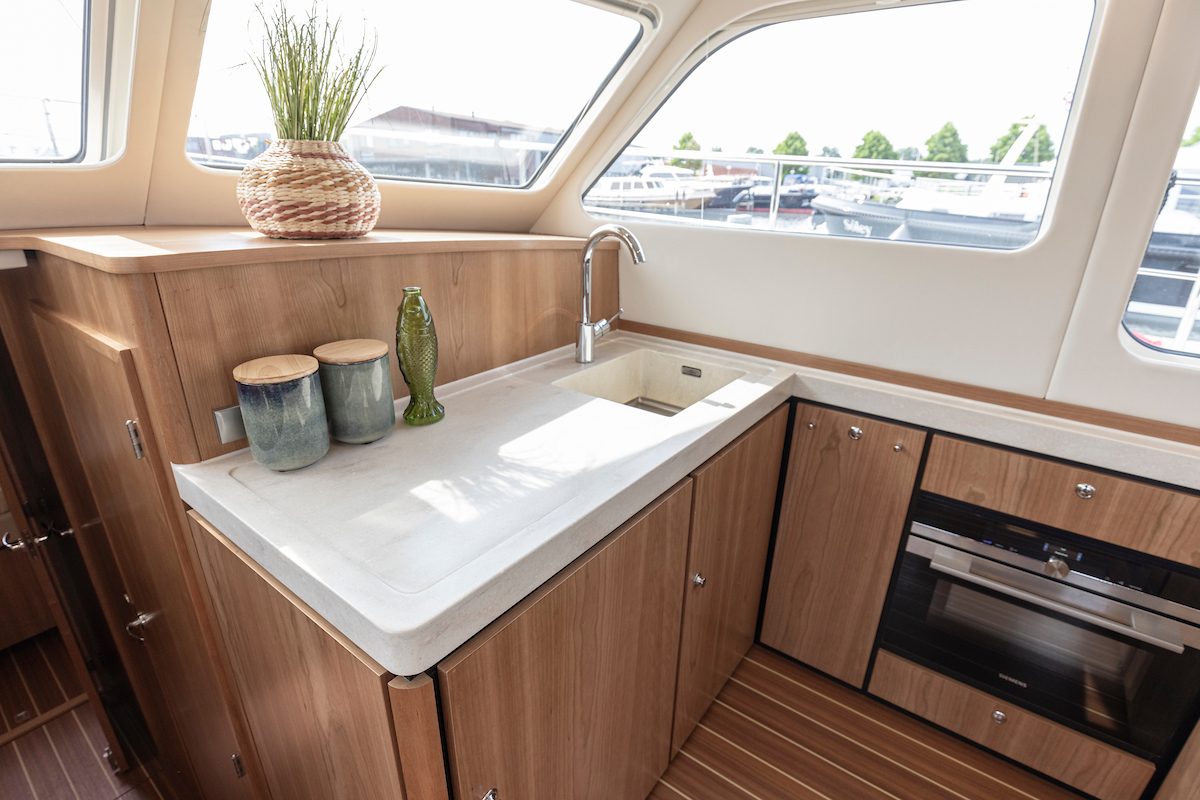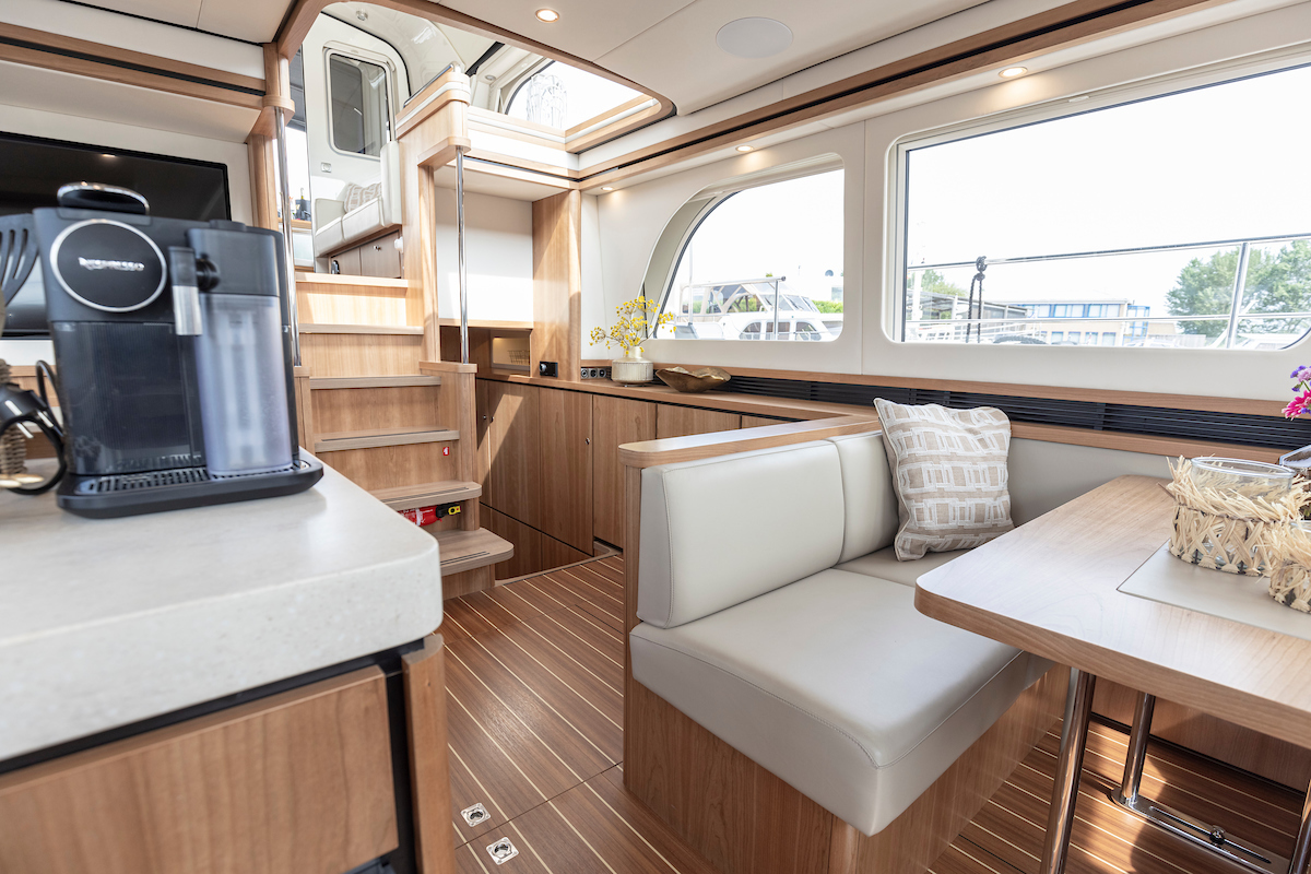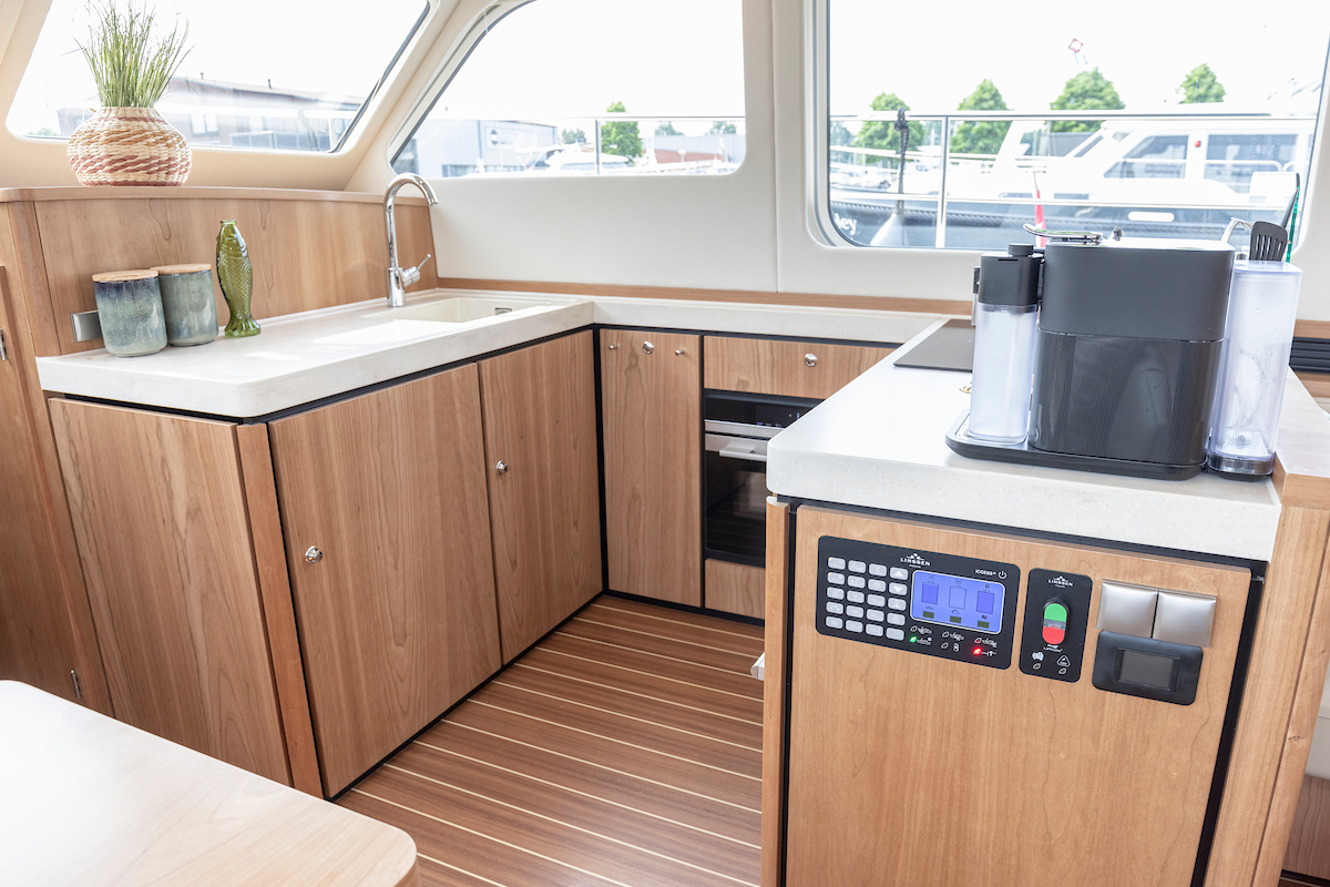 The galley is generous and bright and equipped with an induction cooktop, a combination oven (microwave and hot air oven), a dishwasher and a deluxe version of the Nespresso coffee maker.