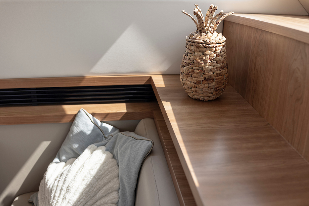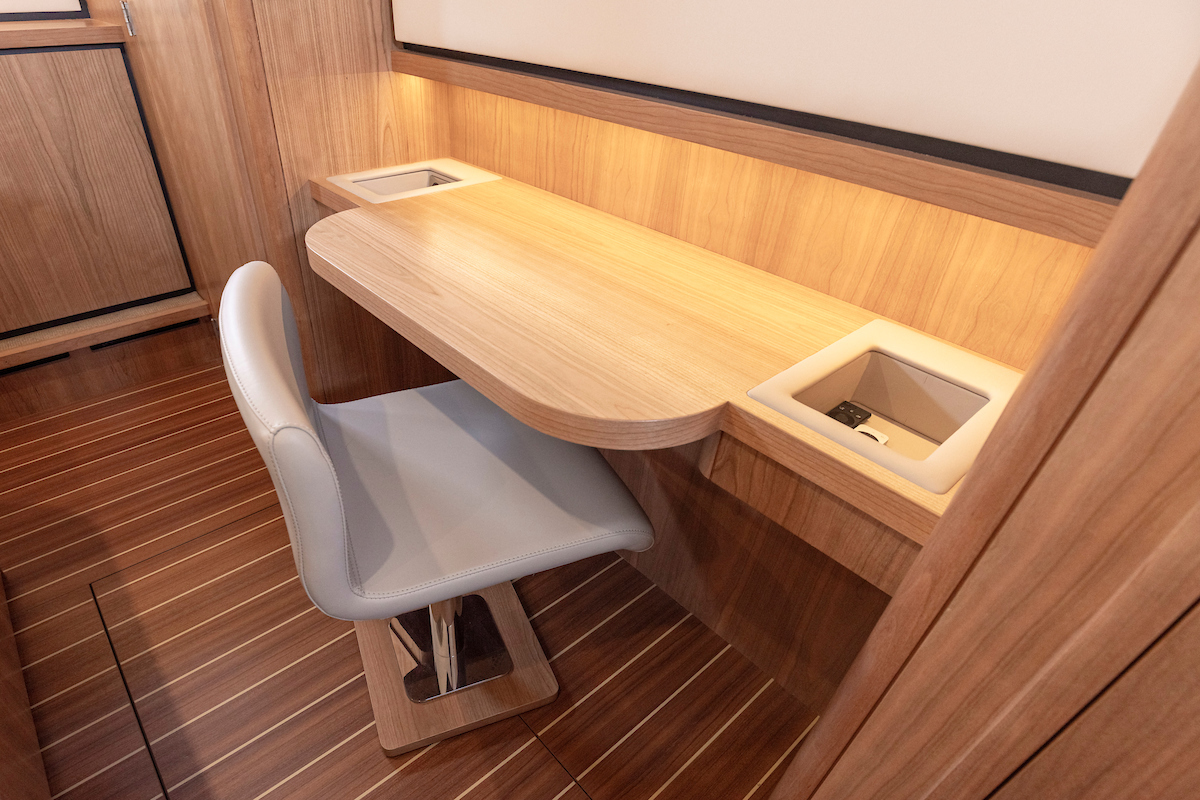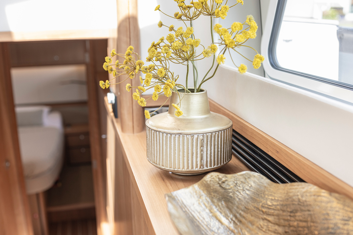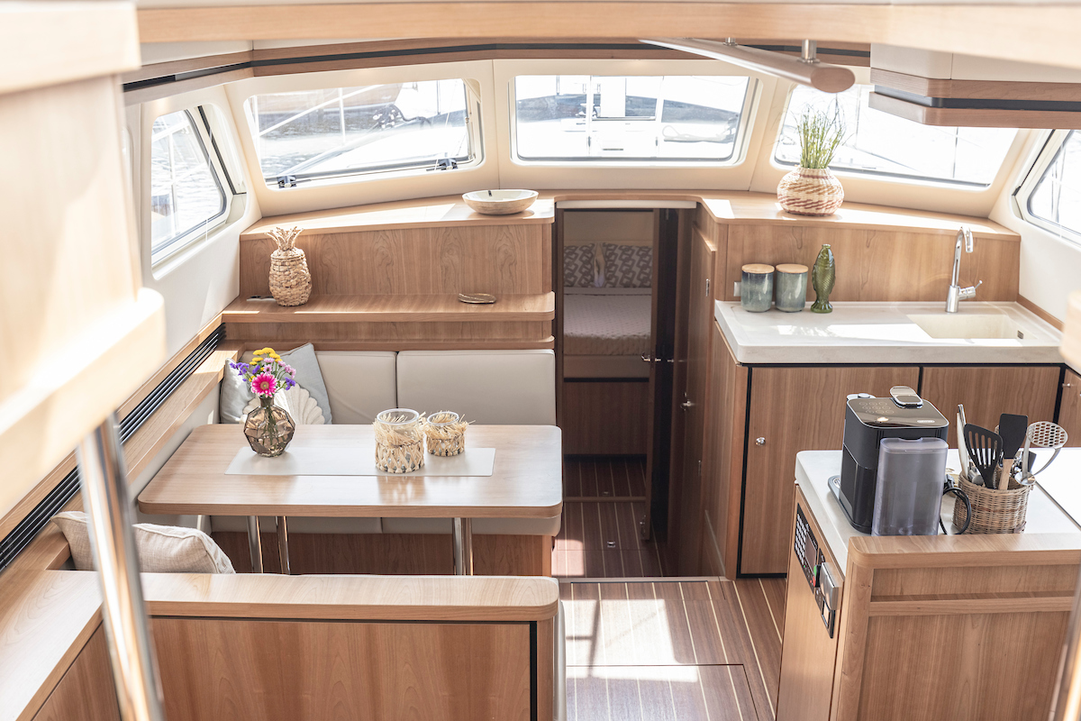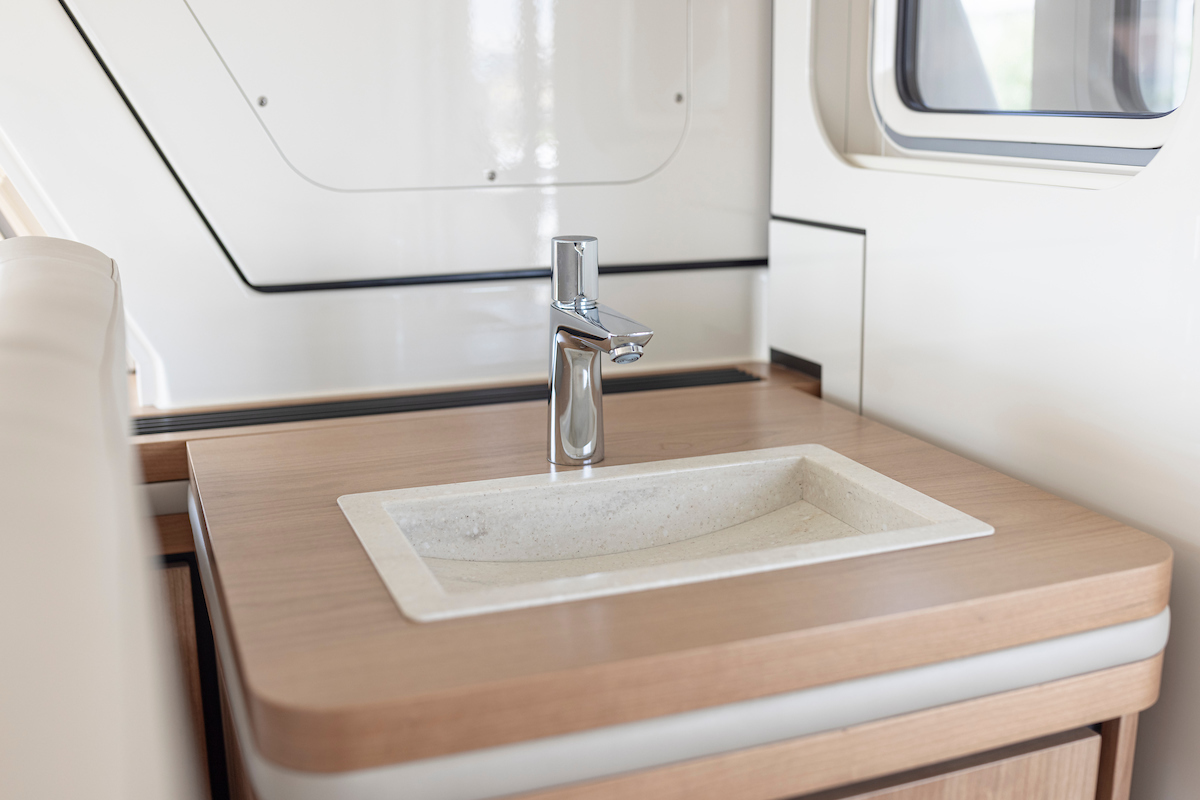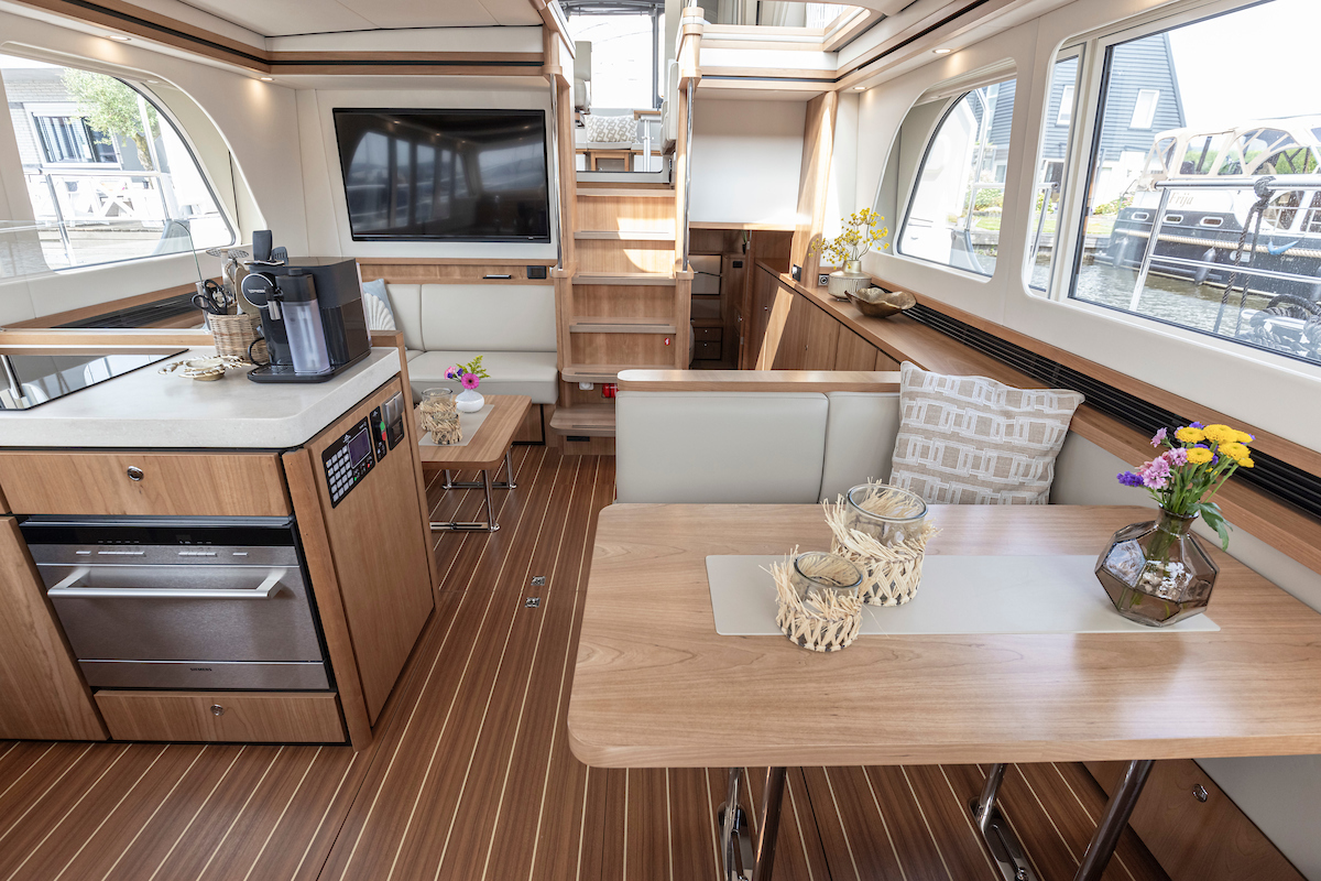 The galley is generous and bright and equipped with an induction cooktop, a combination oven (microwave and hot air oven), a dishwasher and a deluxe version of the Nespresso coffee maker.