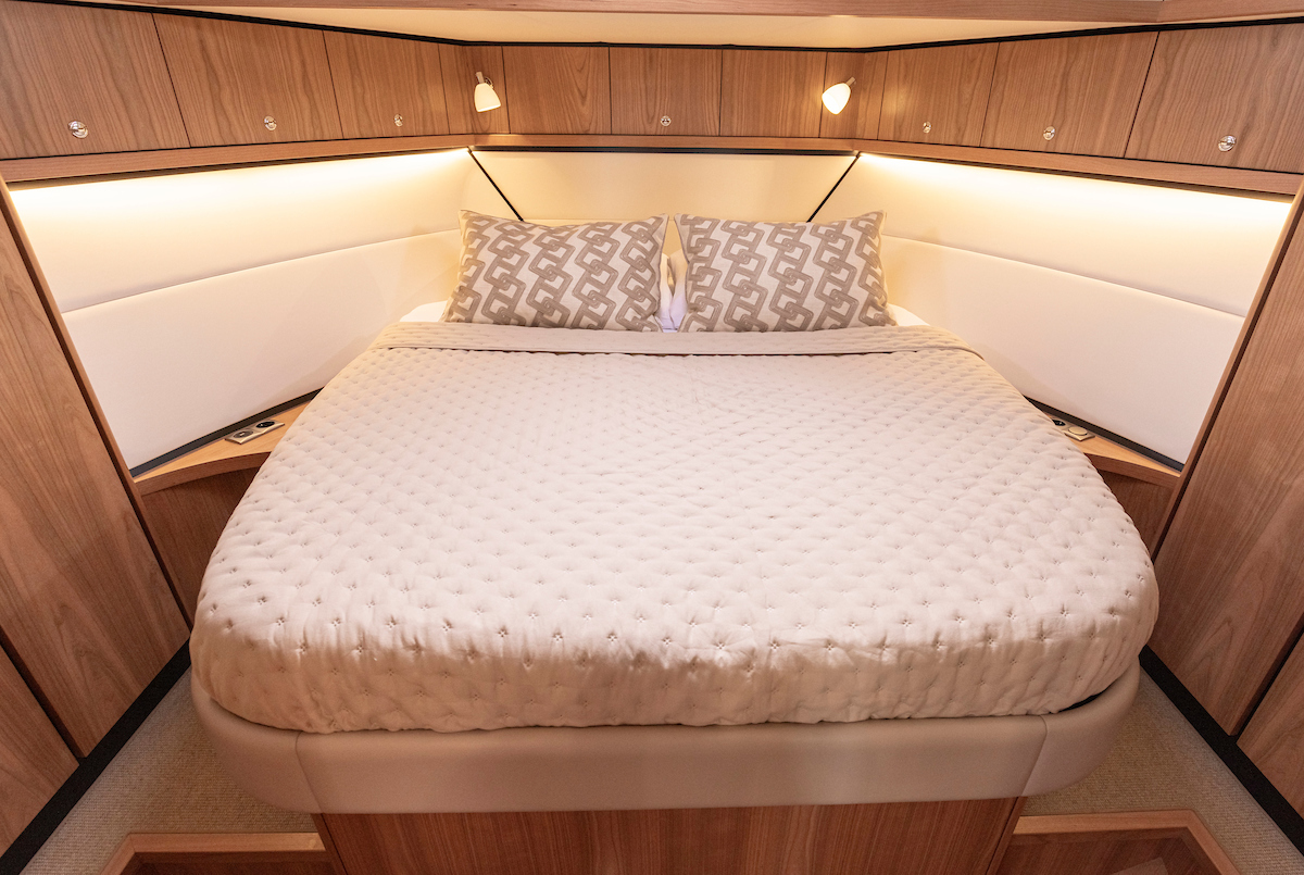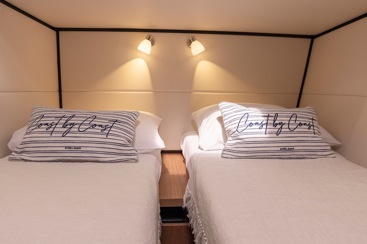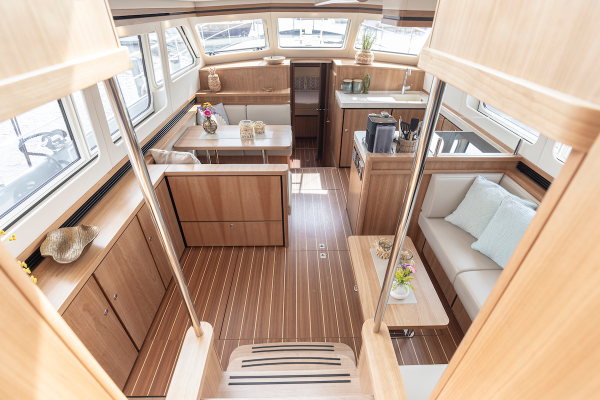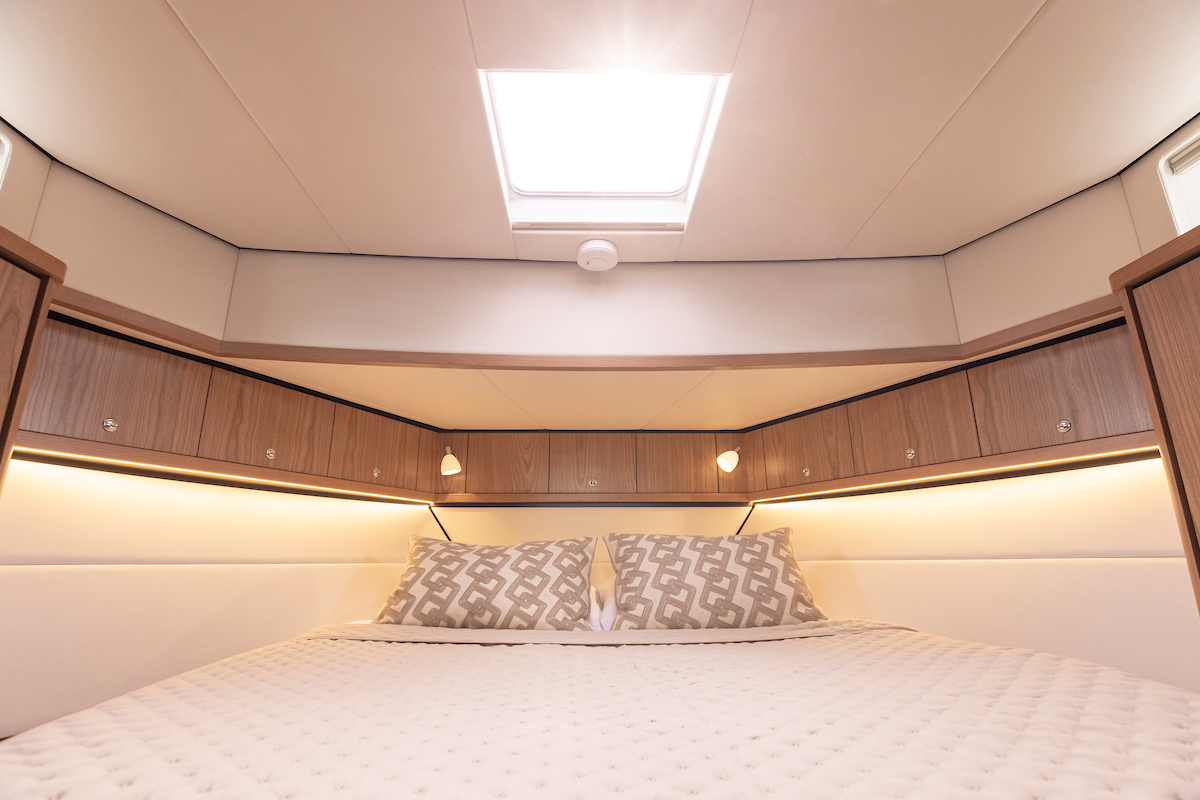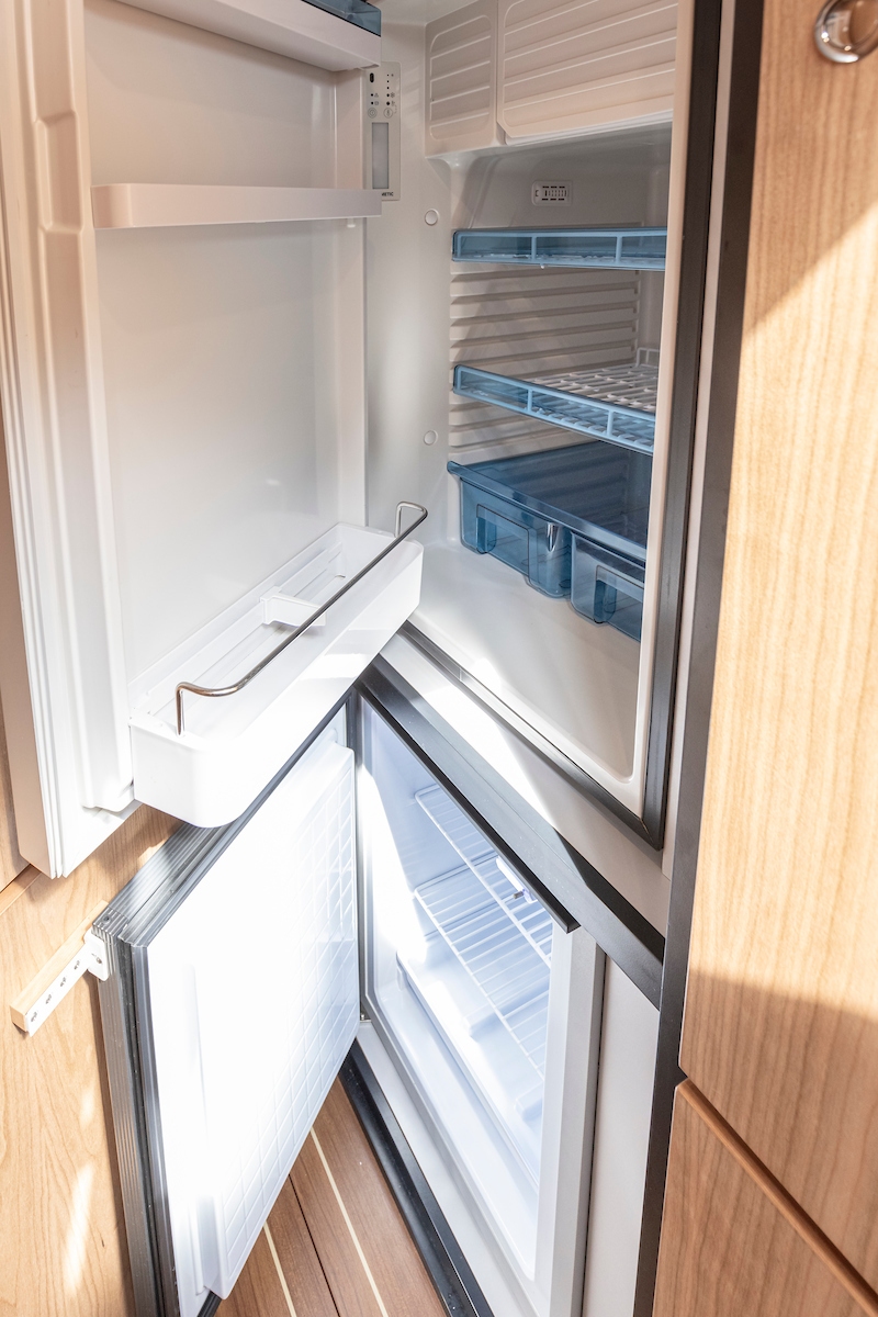 The galley is generous and bright and equipped with an induction cooktop, a combination oven (microwave and hot air oven), a dishwasher and a deluxe version of the Nespresso coffee maker.