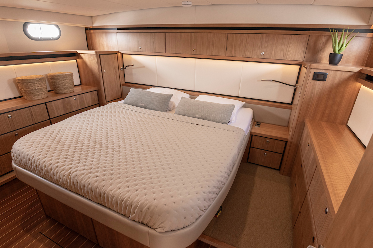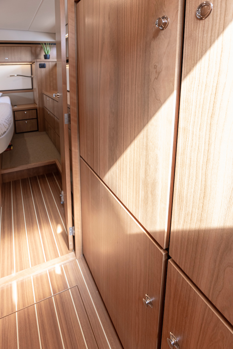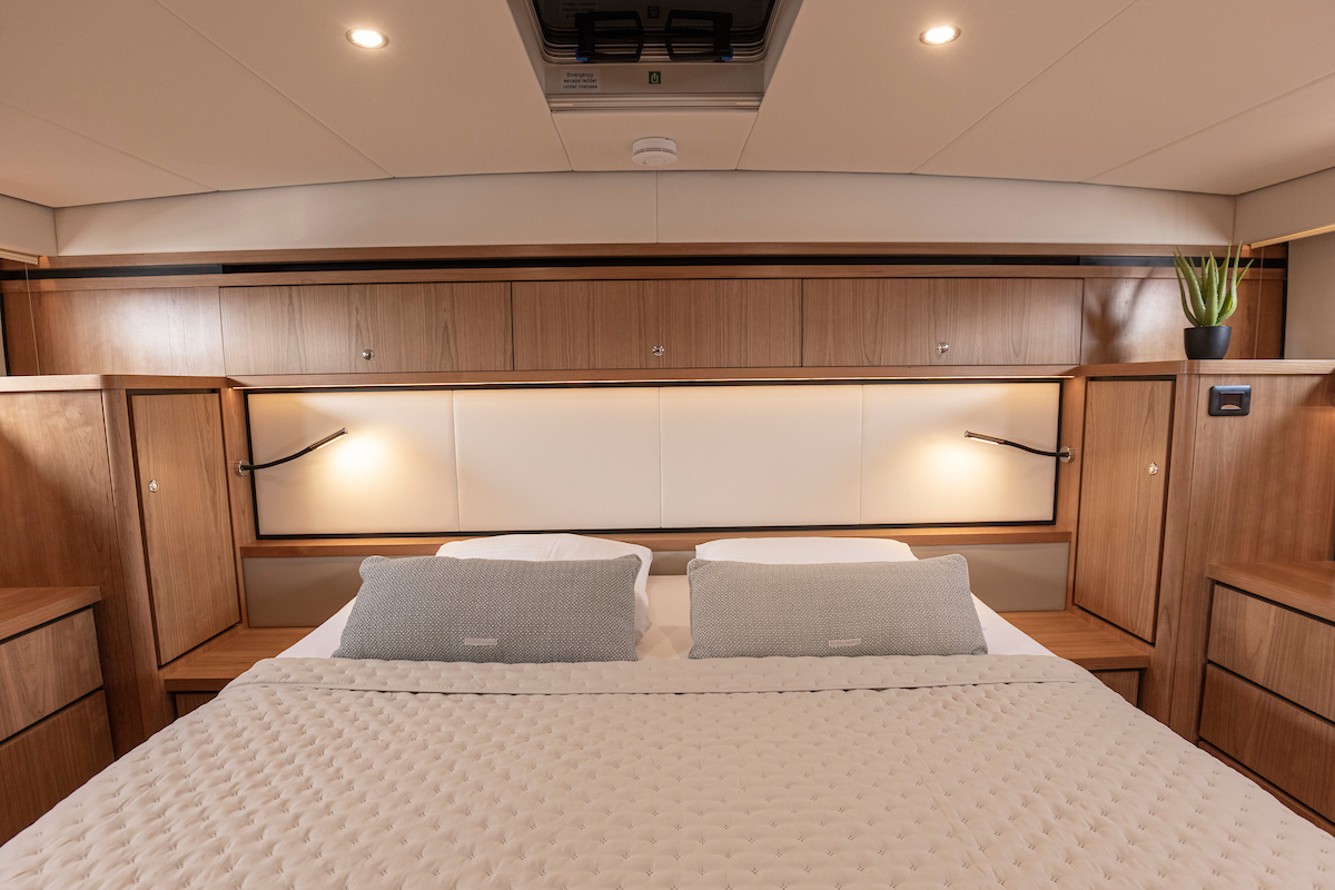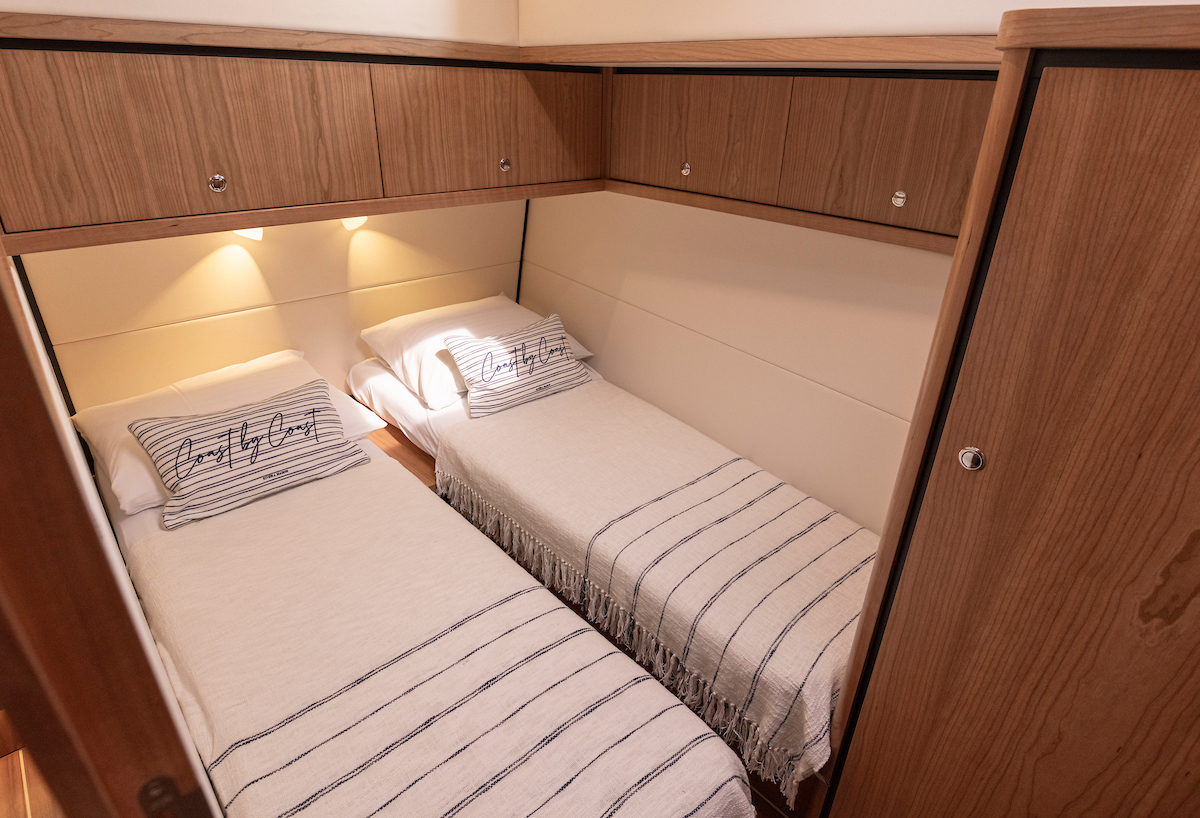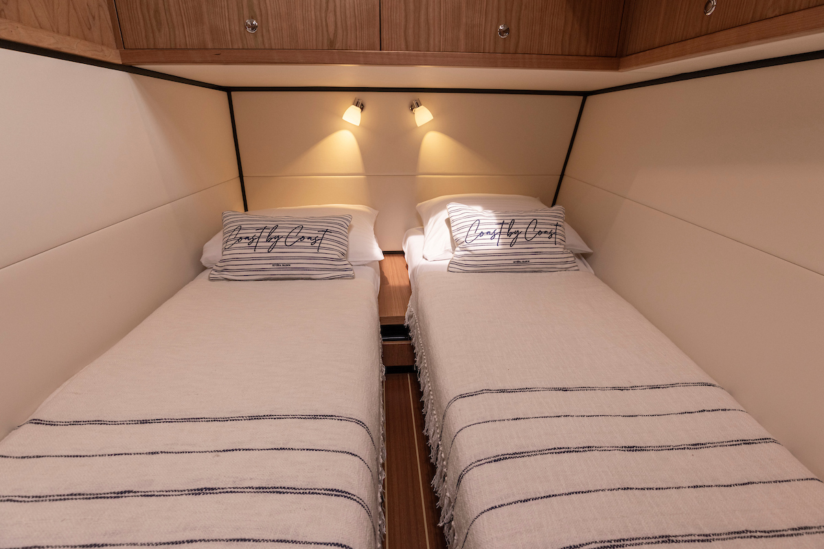 The forward cabin has a generous double bed and closets, with a separate toilet and shower area. The guest cabin has 2 single beds, one of which can be moved so that it can be used as a double bed. Plus in the aft cabin plenty of closet space.