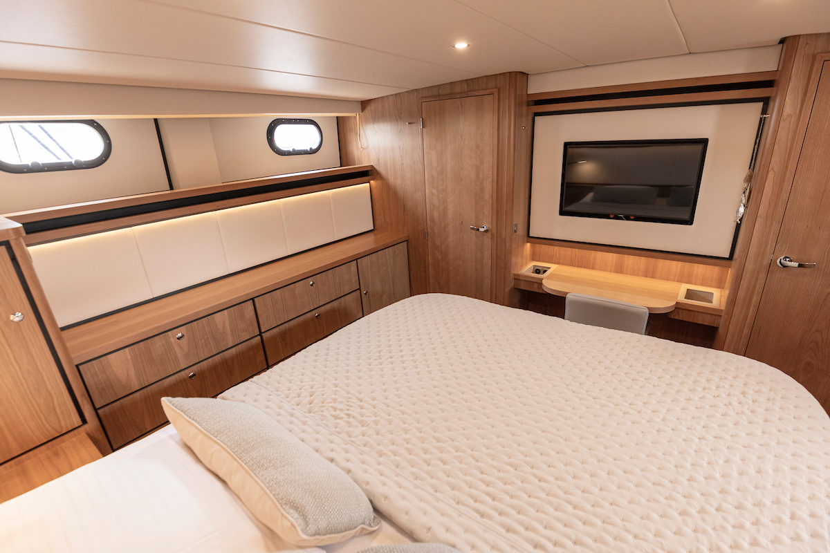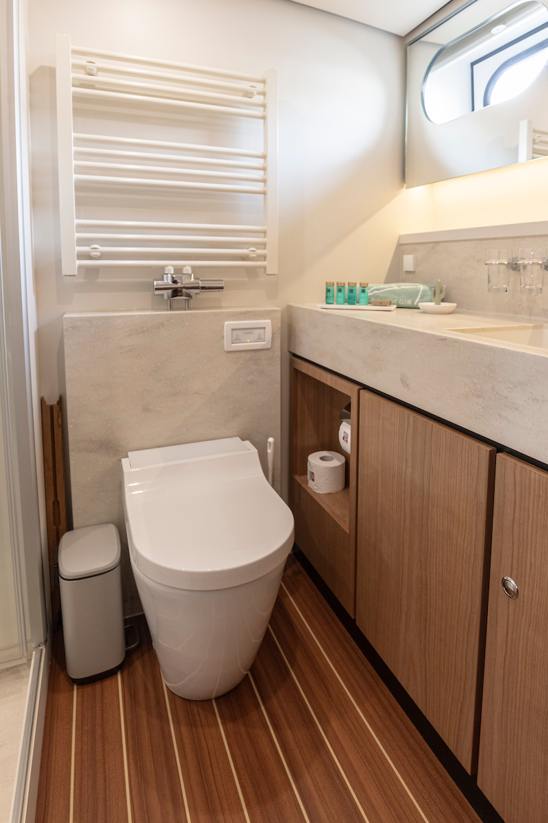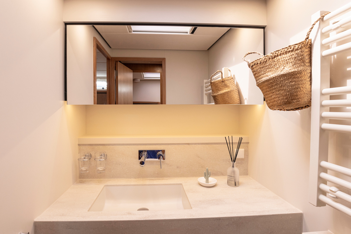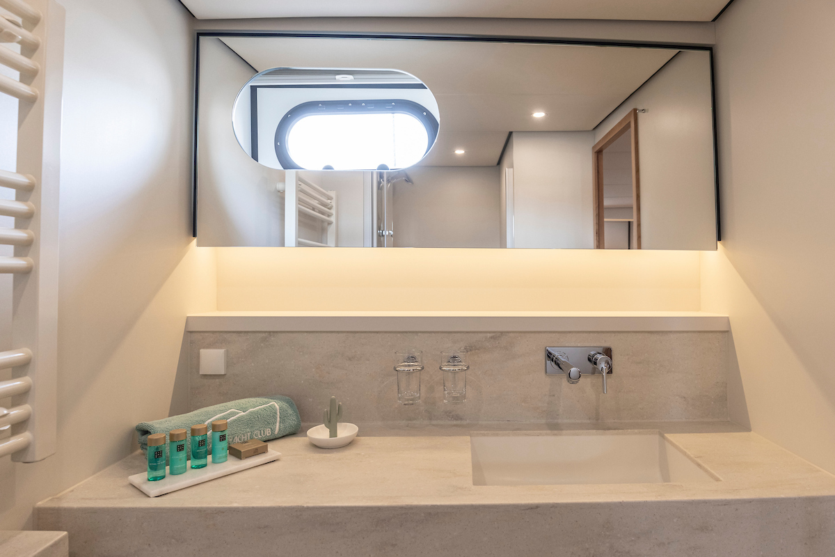 The chic aft cabin features a generous double bed with excellent quality mattresses, an en suite bathroom with a stylish washbasin, an attached shower and a Geberit shower toilet. Furthermore, the aft cabin has very ample storage space, a desk and a cozy sitting area.