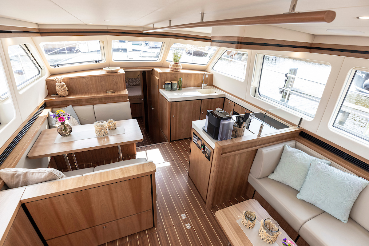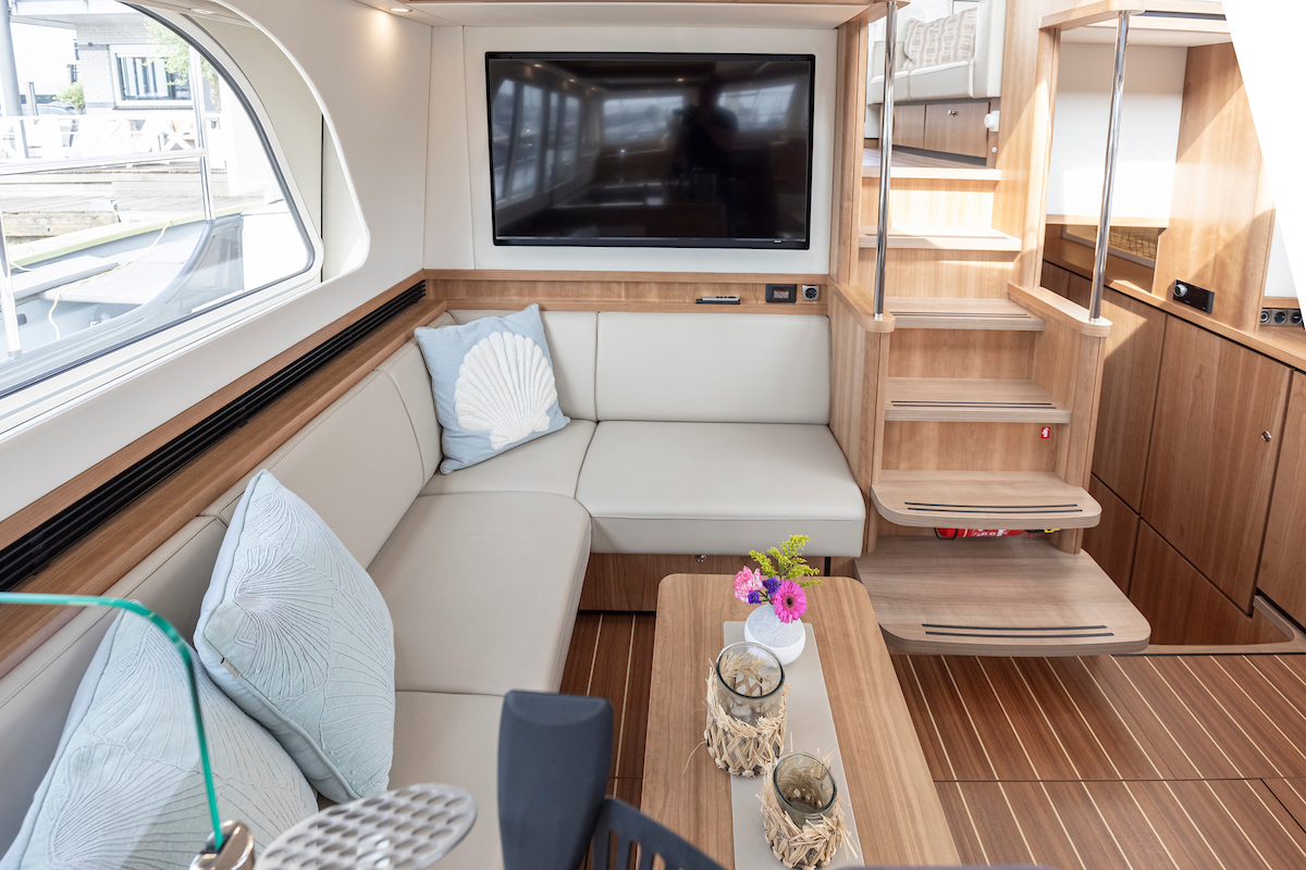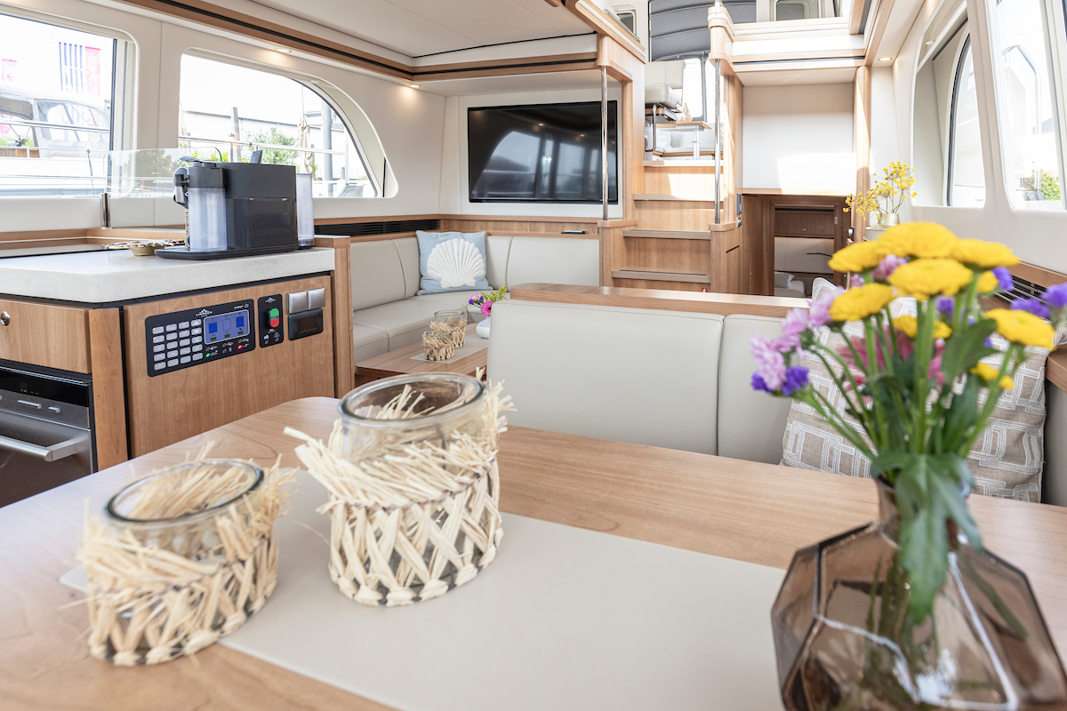 In the saloon you will find a spacious L-shaped settee and galley on the starboard side. On the port side there is a vis a vis dinette. Across from the seating area in the salon there is a low cabinet wall. The large TV (good reception via WiFi router and Apple TV) on the aft wall in the salon is pleasant to watch from several angles.