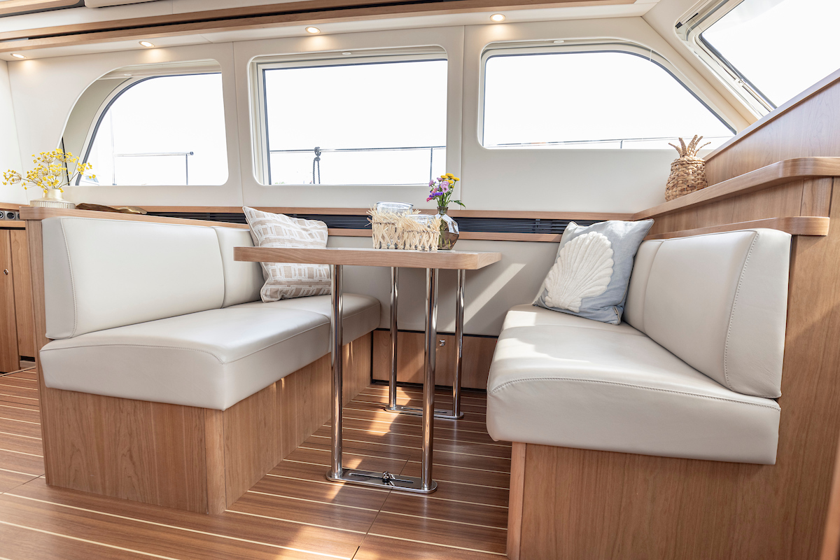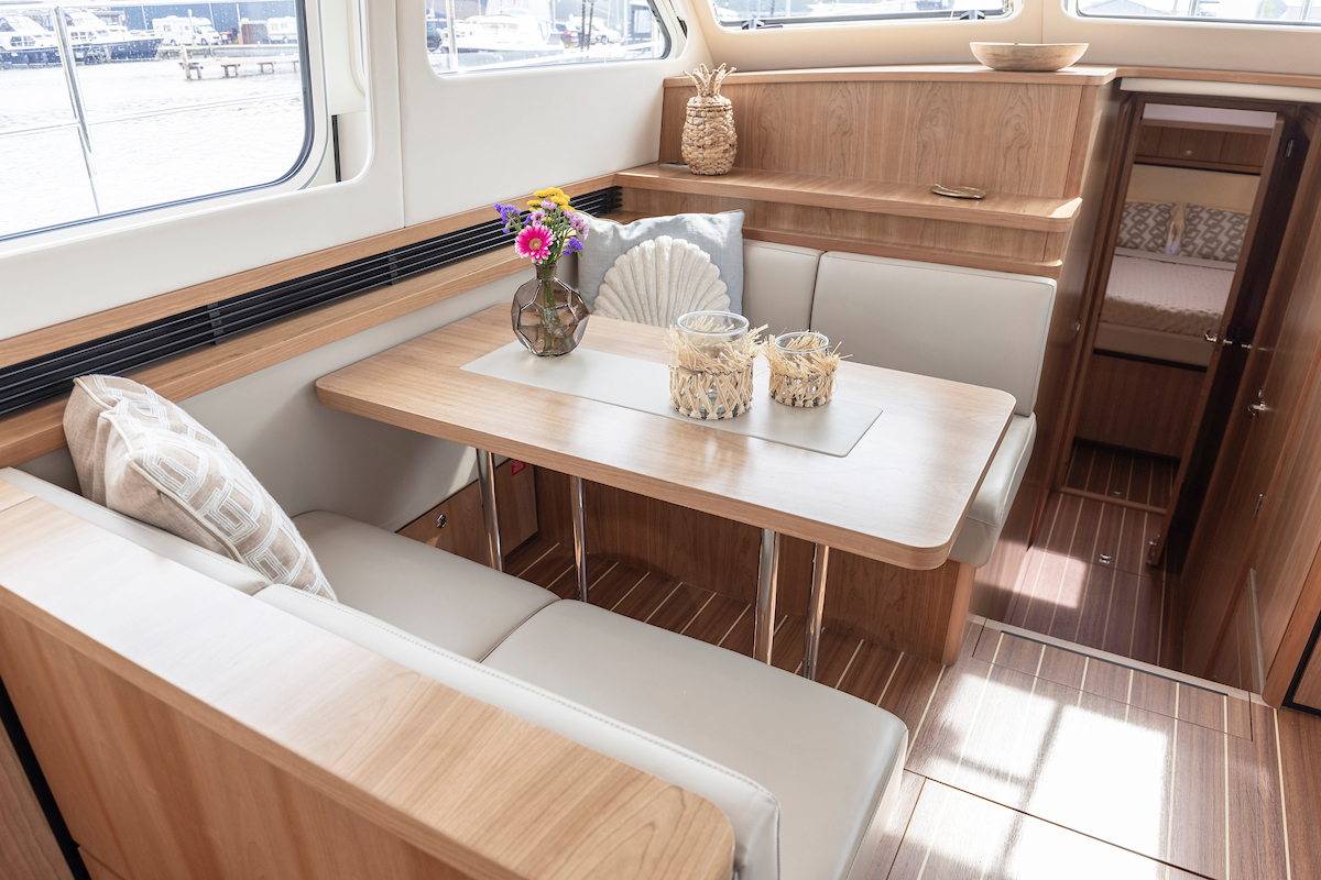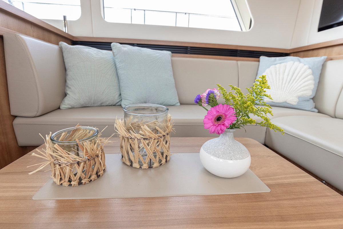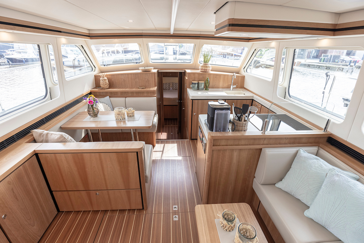 In the saloon you will find a spacious L-shaped settee and galley on the starboard side. On the port side there is a vis a vis dinette. Across from the seating area in the salon there is a low cabinet wall. The large TV (good reception via WiFi router and Apple TV) on the aft wall in the salon is pleasant to watch from several angles.