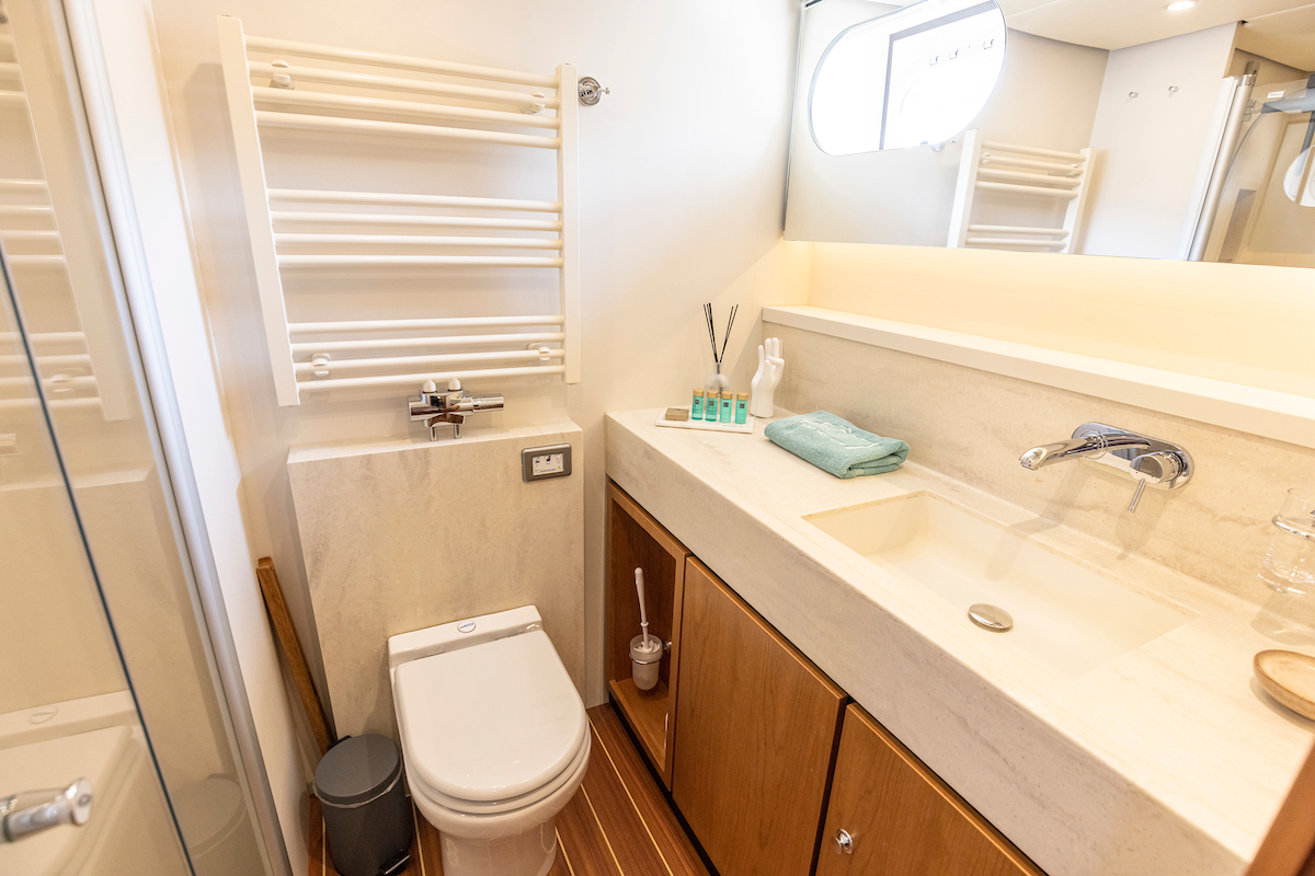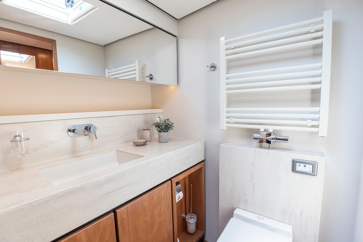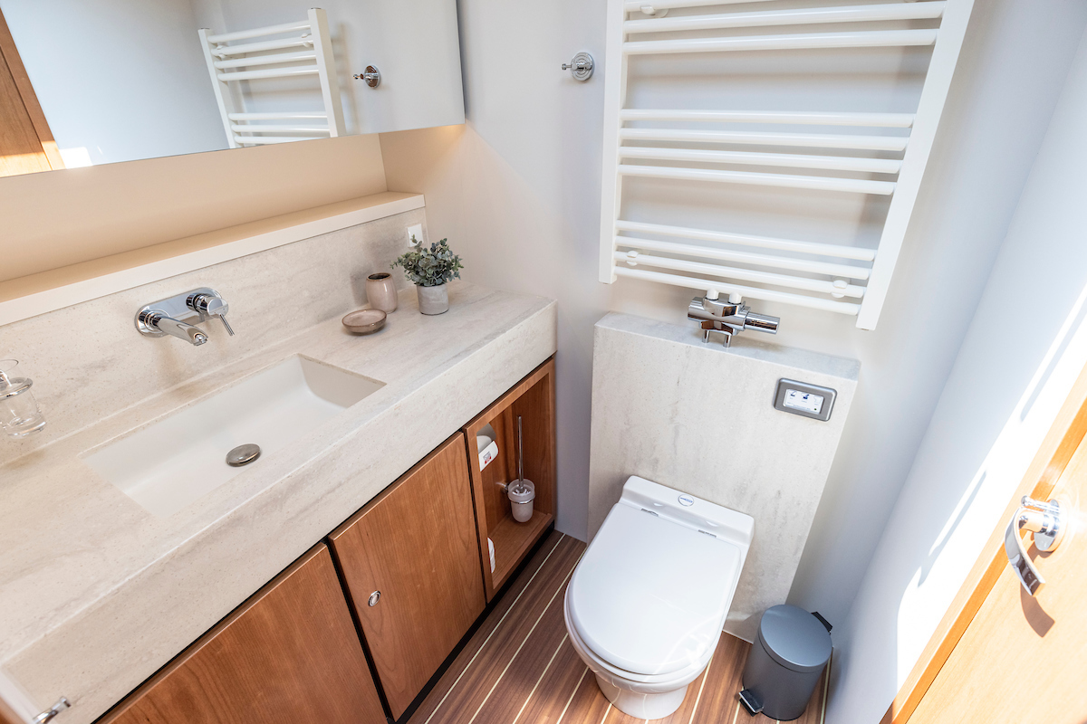The chic aft cabin features a generous double bed with excellent quality mattresses, an en suite bathroom with a stylish washbasin, an attached shower and a Geberit shower toilet. Furthermore, the aft cabin has very ample storage space, a desk and a cozy sitting area.