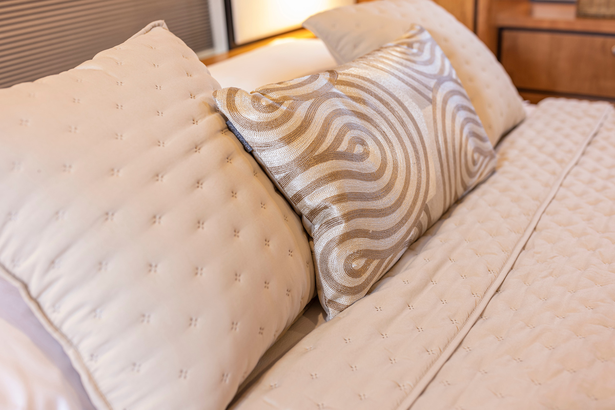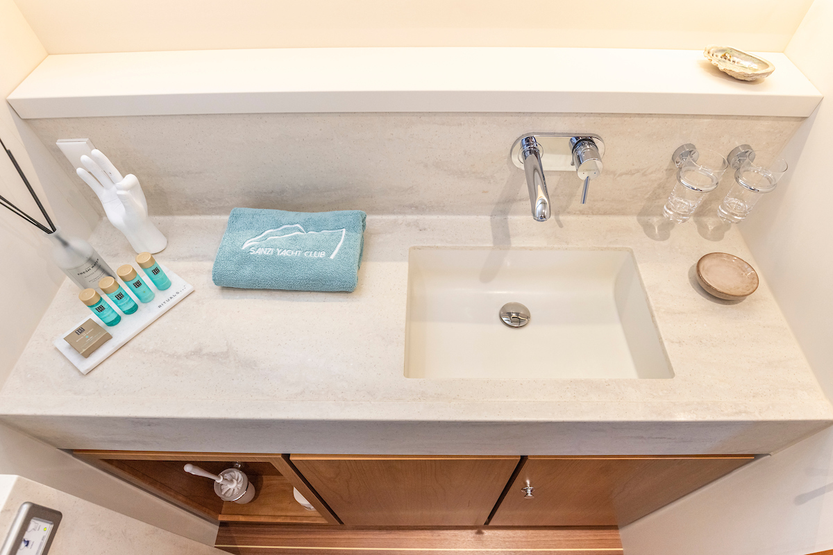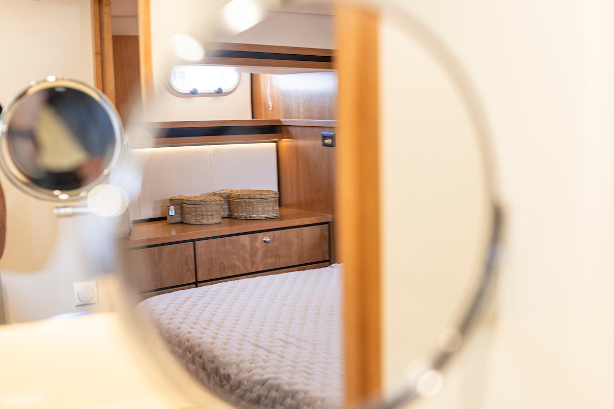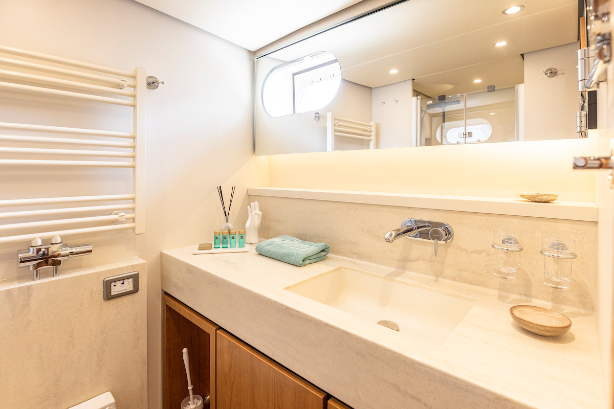 The chic aft cabin features a generous double bed with excellent quality mattresses, an en suite bathroom with a stylish washbasin, an attached shower and a Geberit shower toilet. Furthermore, the aft cabin has very ample storage space, a desk and a cozy sitting area.