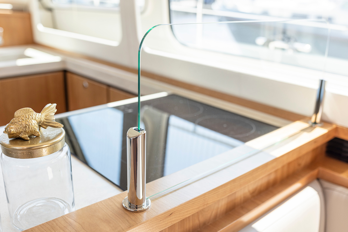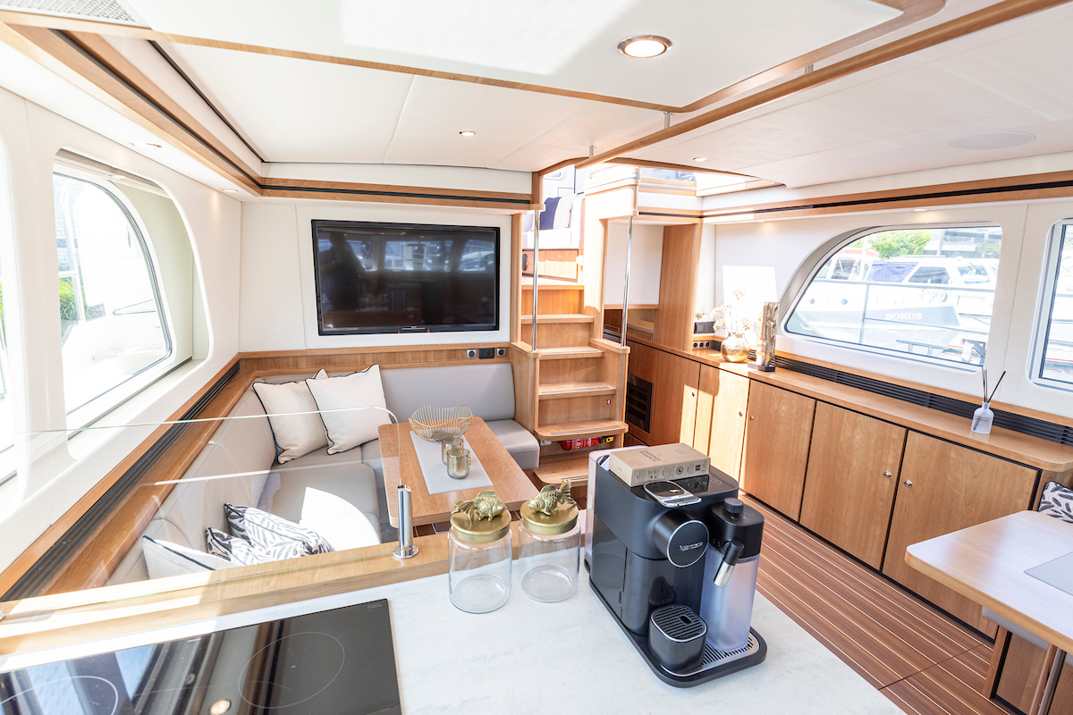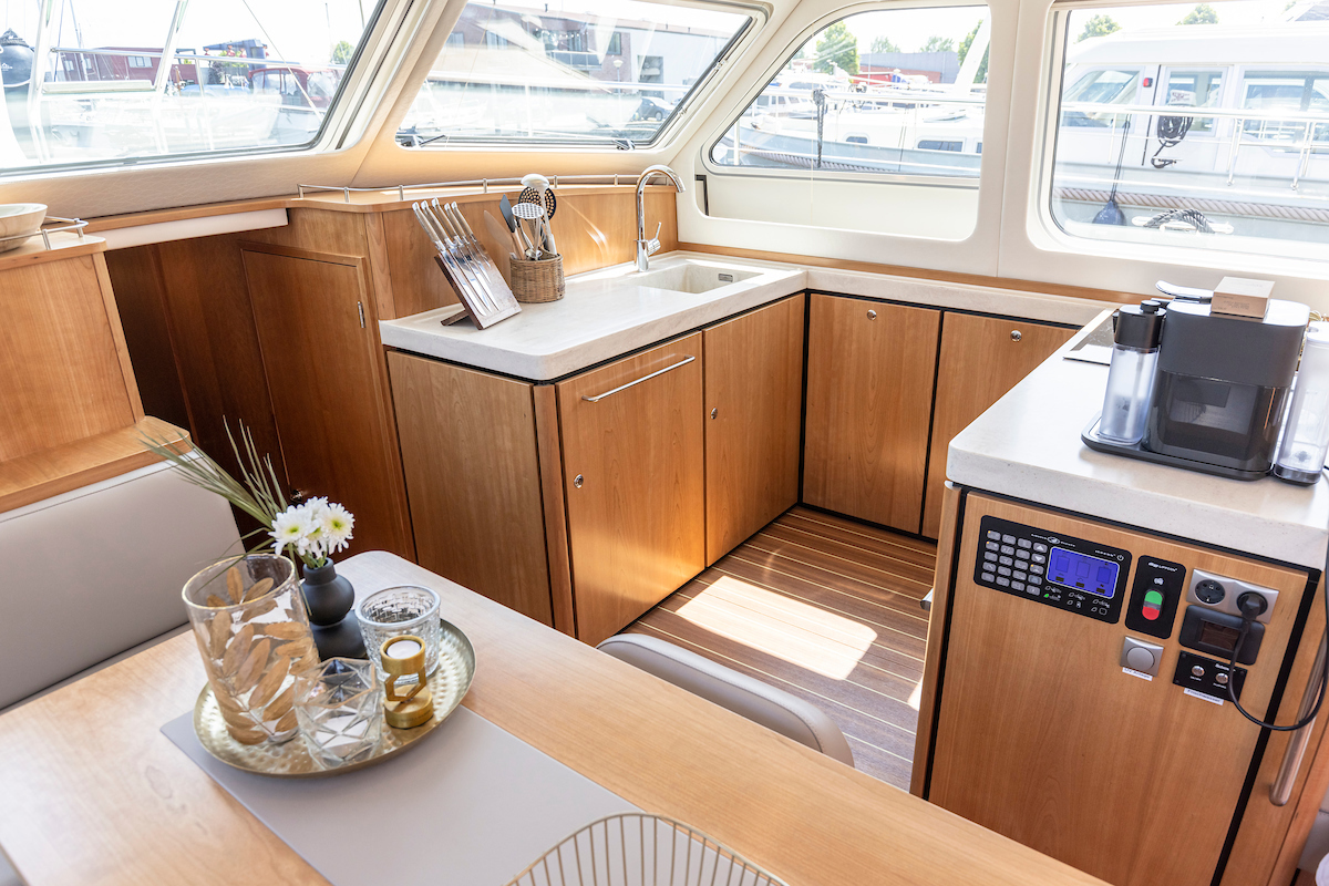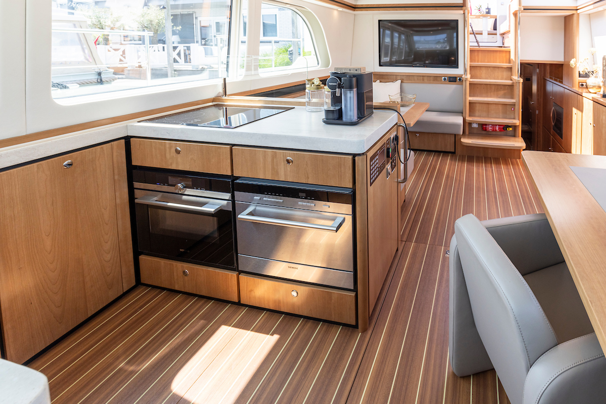 The galley is generous and bright and equipped with an induction cooktop, a combination oven (microwave and hot air oven), a dishwasher and a deluxe version of the Nespresso coffee maker.