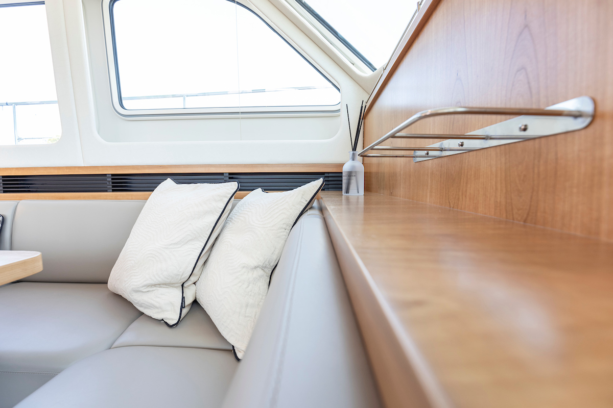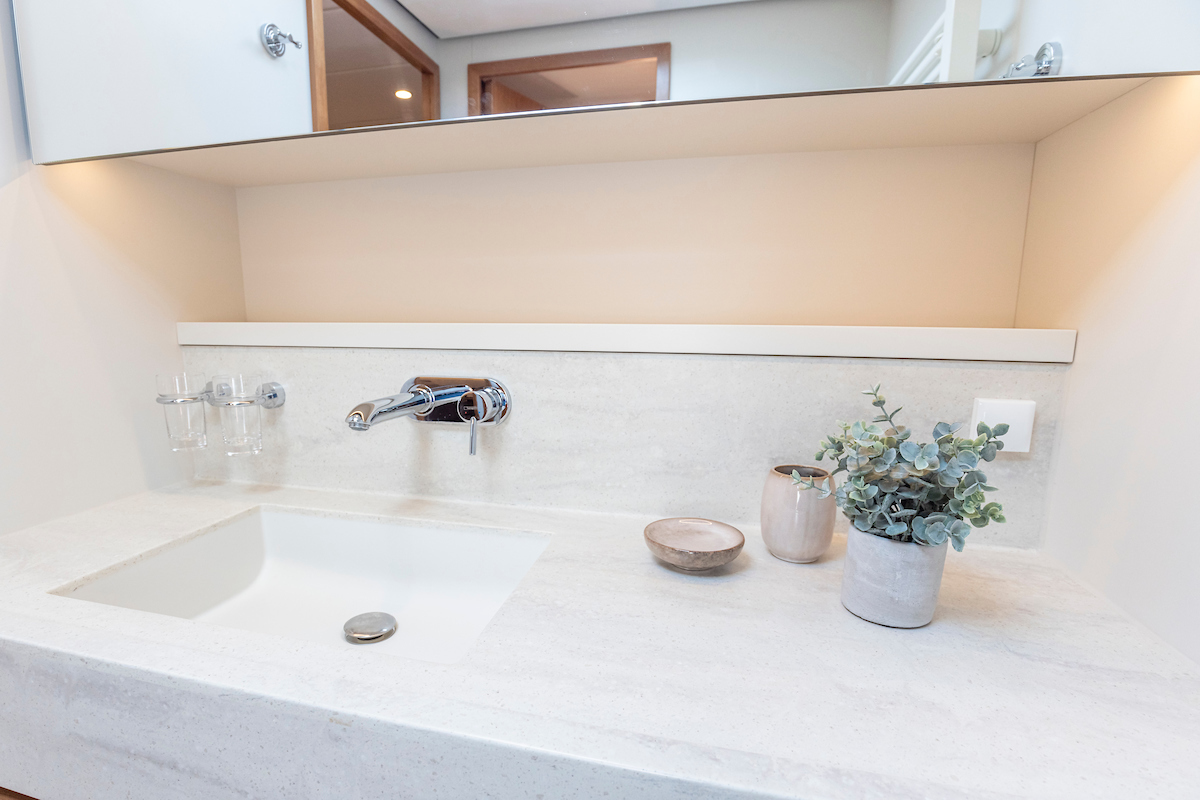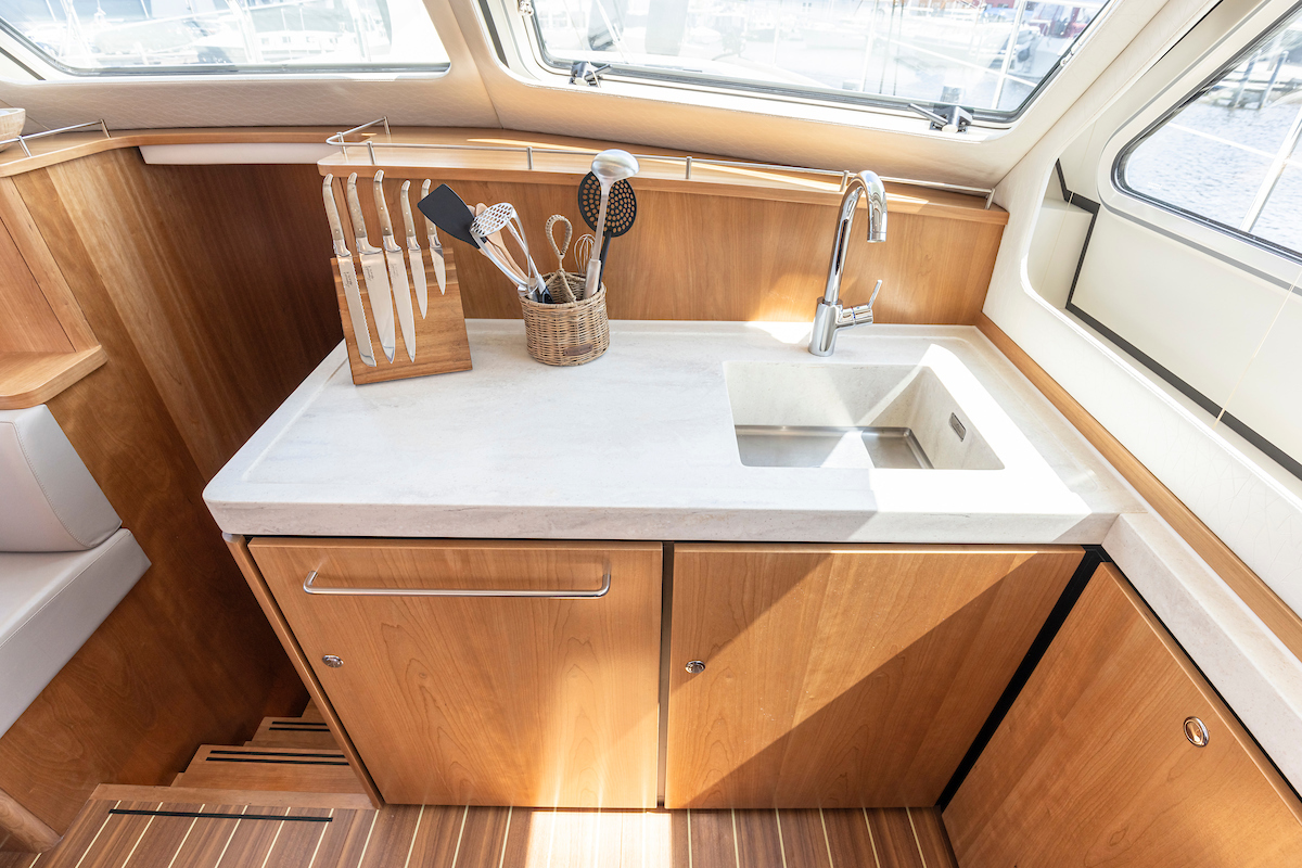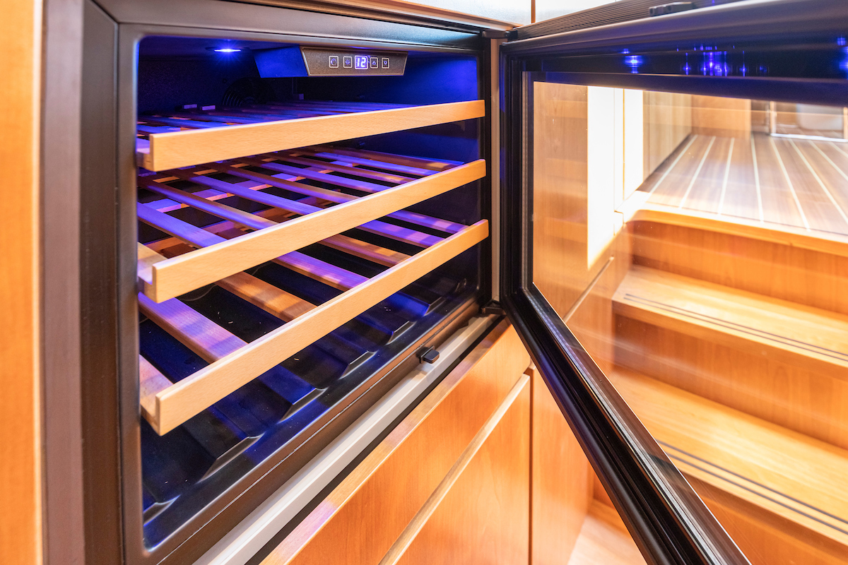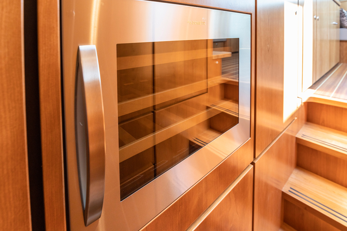The galley is generous and bright and equipped with an induction cooktop, a combination oven (microwave and hot air oven), a dishwasher and a deluxe version of the Nespresso coffee maker.