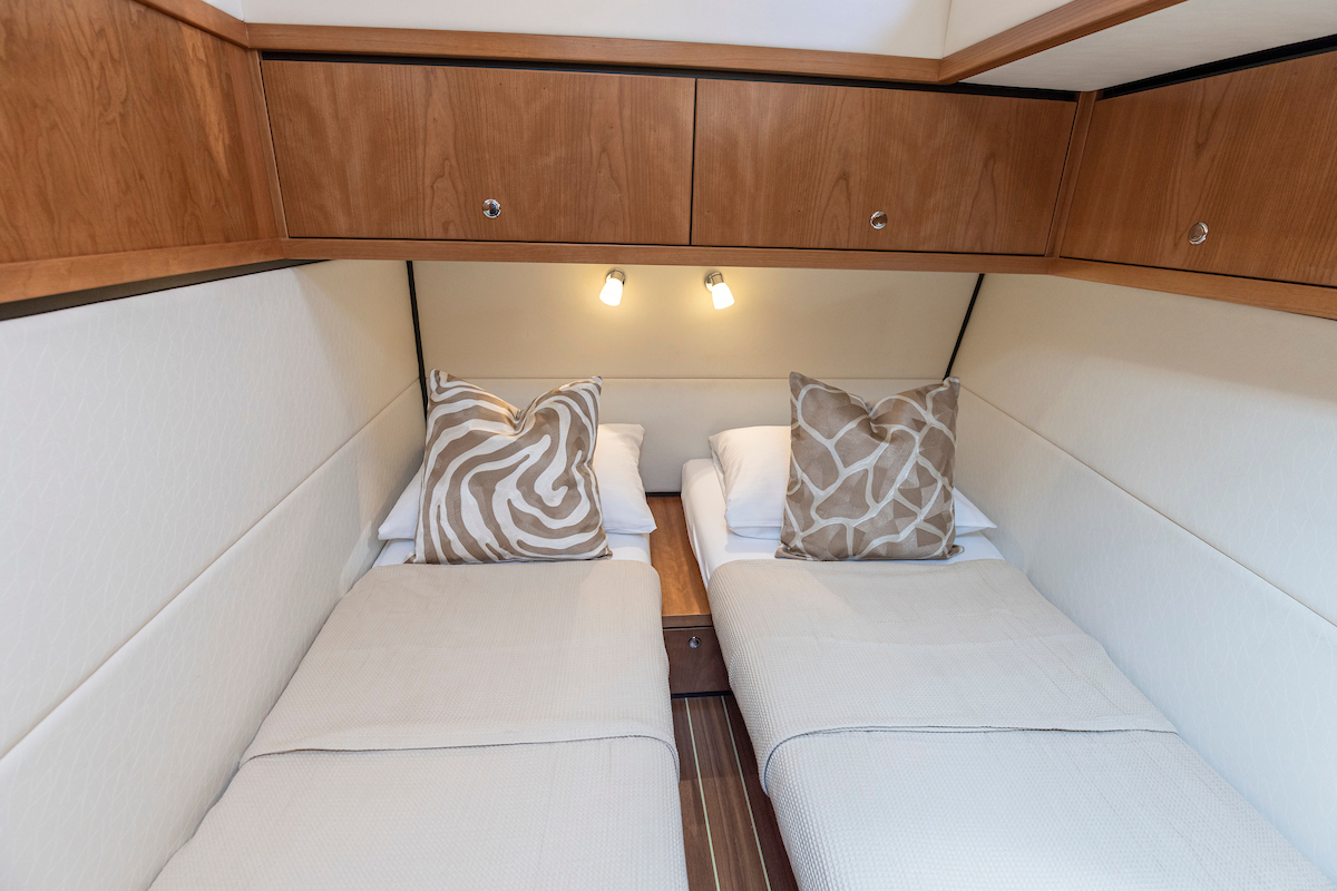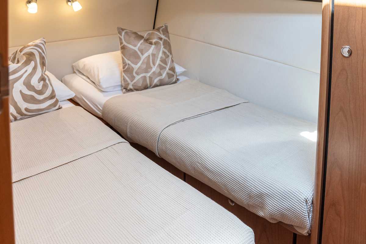 The forward cabin has a generous double bed and closets, with a separate toilet and shower area. The guest cabin has 2 single beds, one of which can be moved so that it can be used as a double bed. Plus in the aft cabin plenty of closet space.
