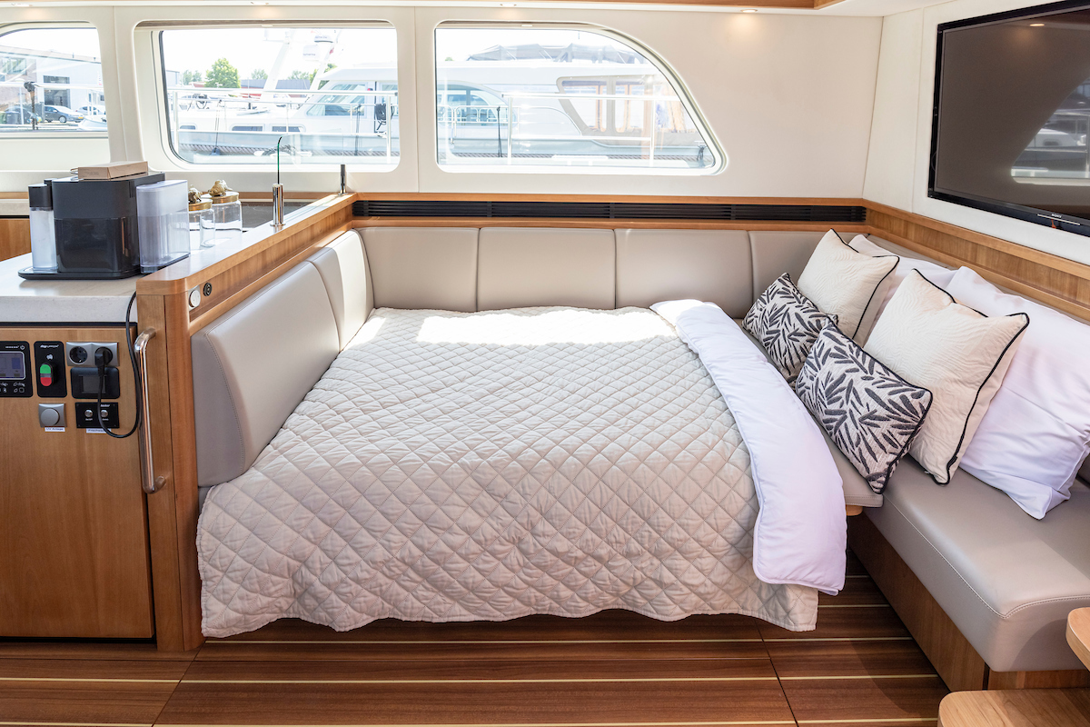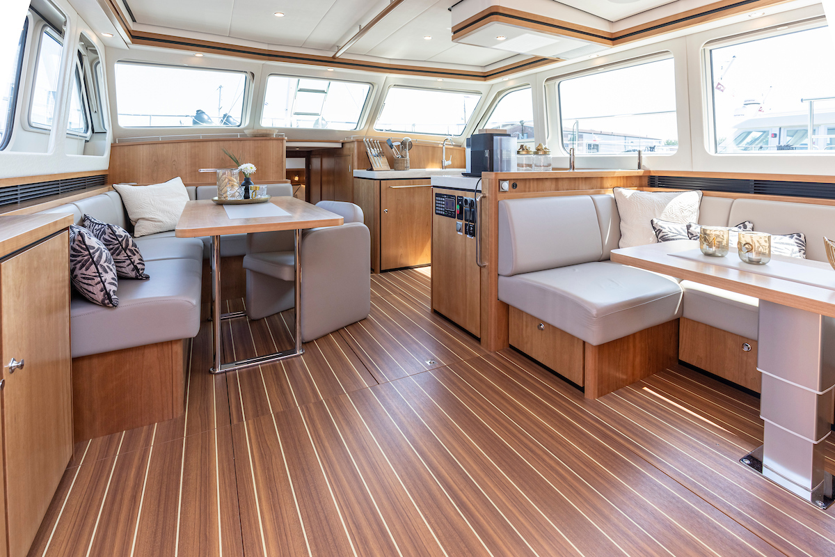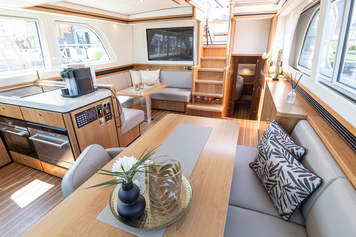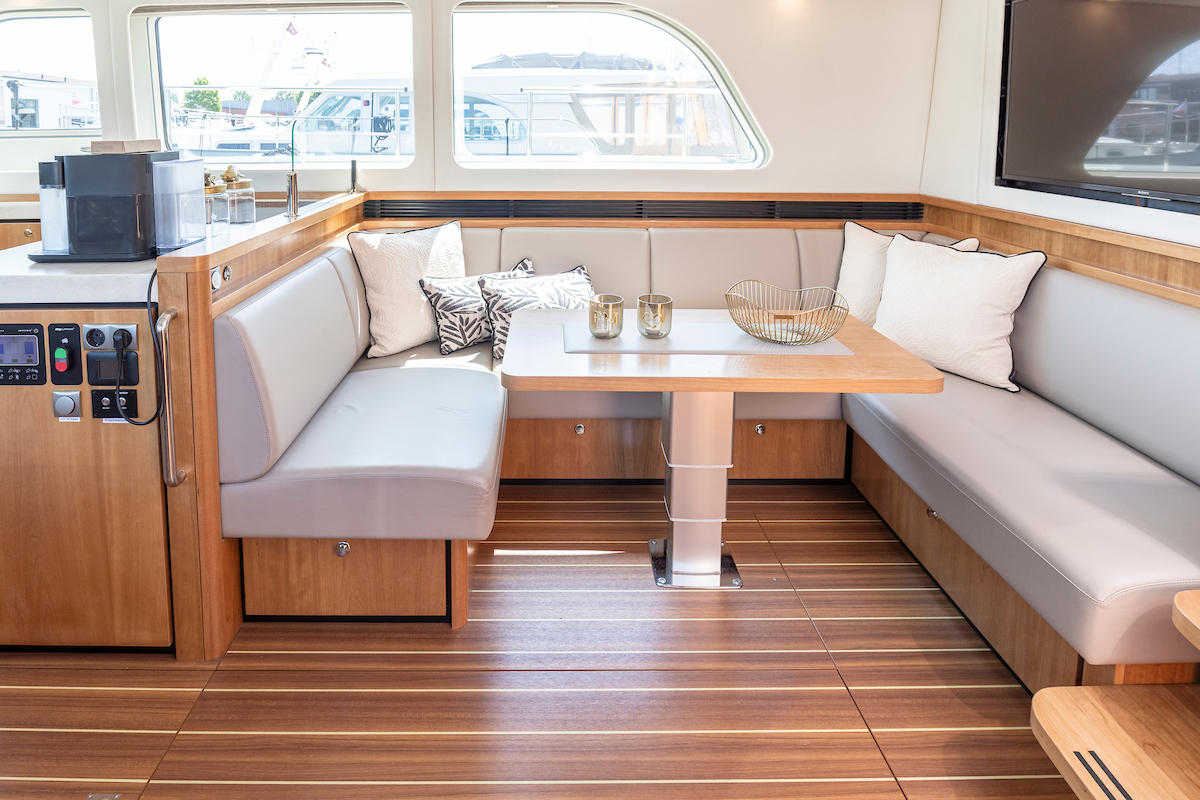 In the saloon you will find a spacious L-shaped settee and galley on the starboard side. On the port side there is a vis a vis dinette. Across from the seating area in the salon there is a low cabinet wall. The large TV (good reception via WiFi router and Apple TV) on the aft wall in the salon is pleasant to watch from several angles.