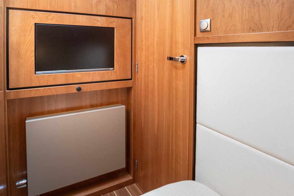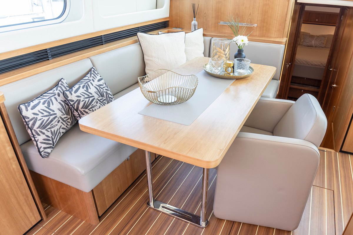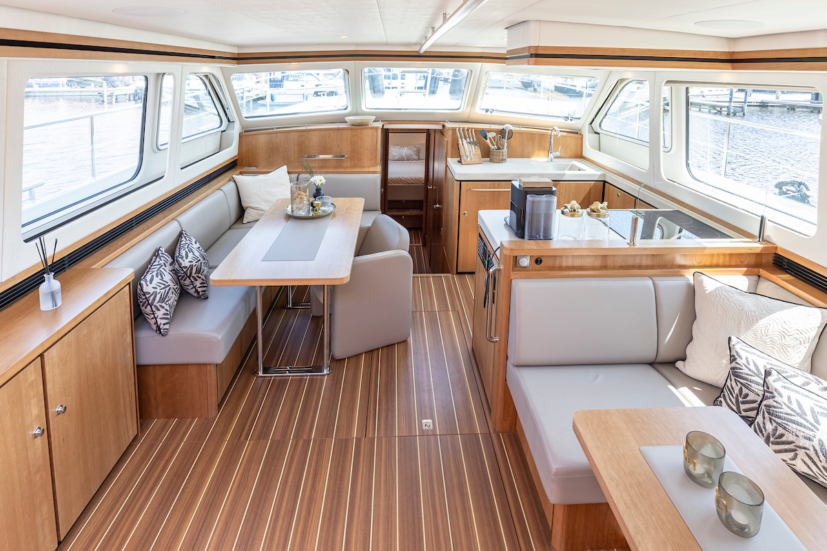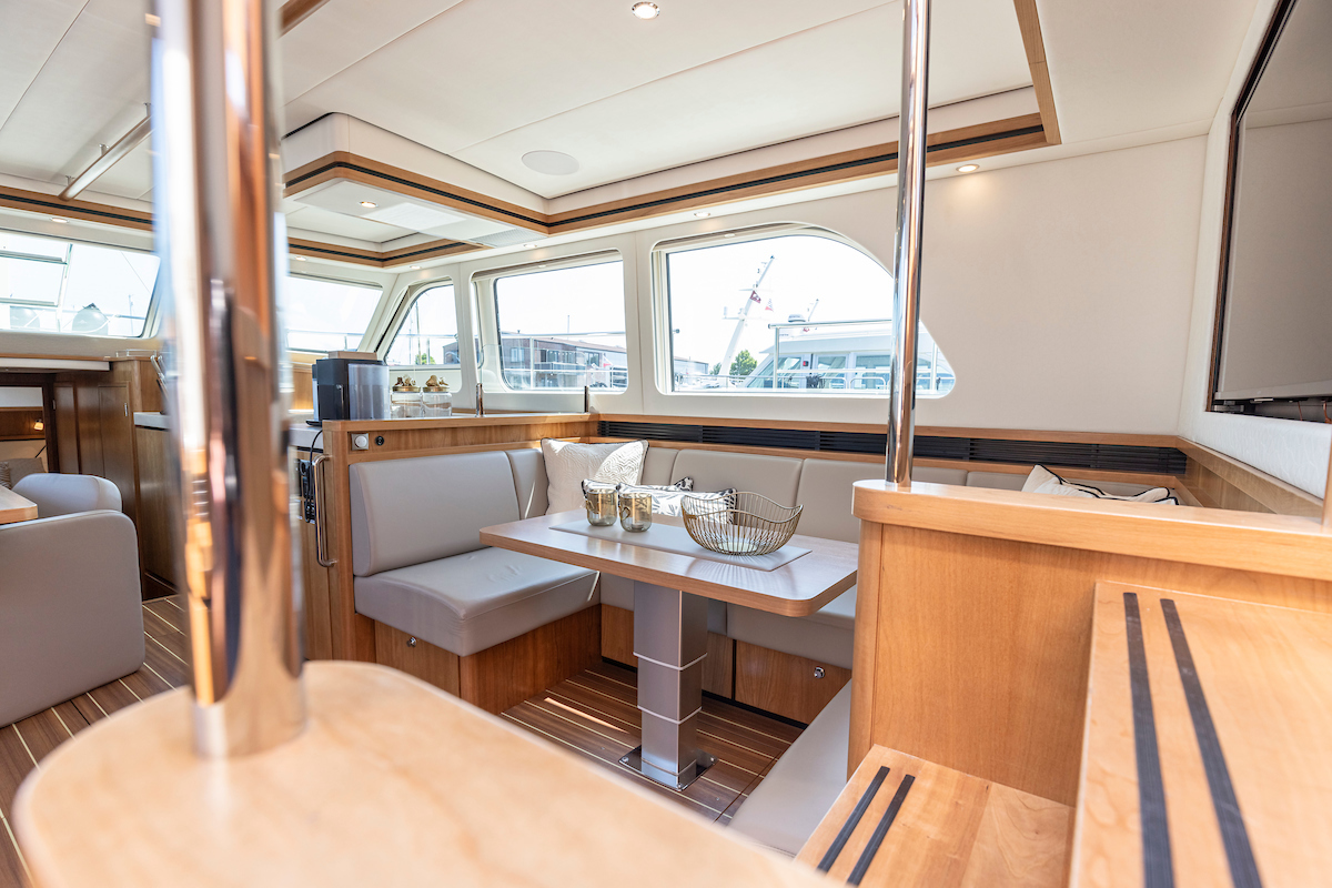 In the saloon you will find a spacious L-shaped settee and galley on the starboard side. On the port side there is a vis a vis dinette. Across from the seating area in the salon there is a low cabinet wall. The large TV (good reception via WiFi router and Apple TV) on the aft wall in the salon is pleasant to watch from several angles.