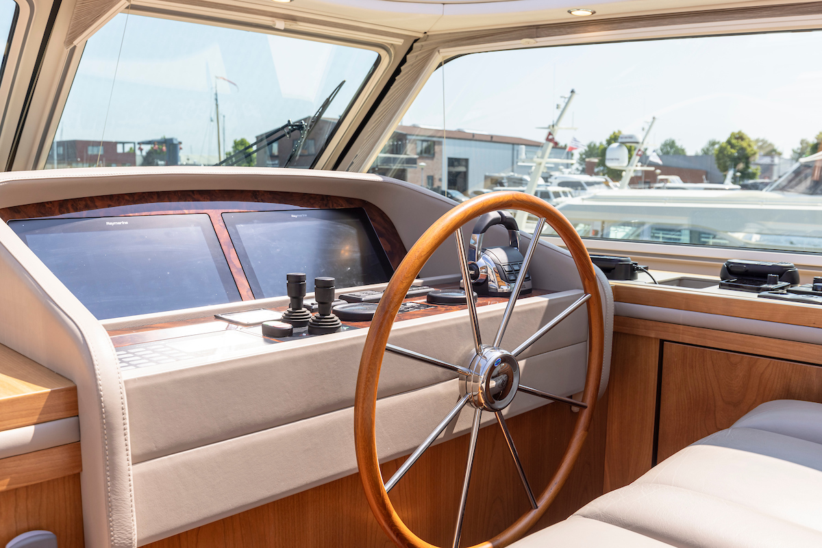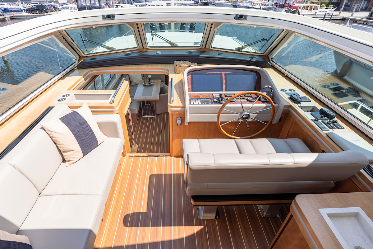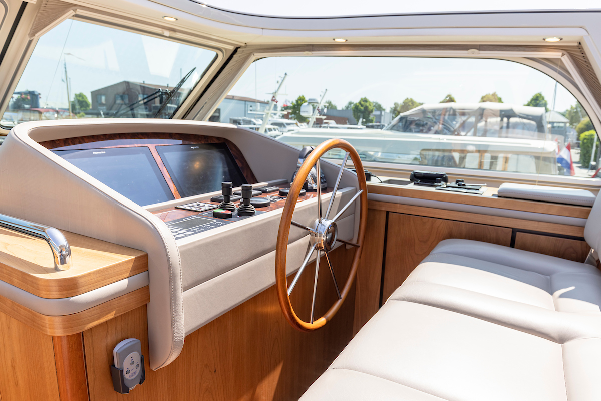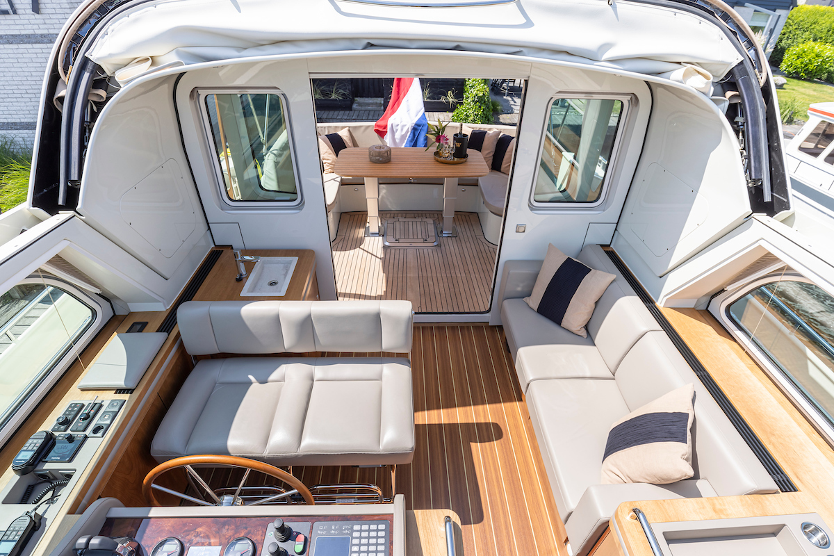 In the wheelhouse is the dashboard with an extensive set of navigation equipment: double plotter screen, autopilot, AIS and radar, tiller steering, VHF radio, cameras around, Navionics map Europe, proportional powerful bow and stern thruster. Remote control via Yachtcontroller to operate bow and stern thruster and both engines. The steering position is equipped with a luxurious leather two-person steering bench which can be electrically adjusted to any position. In the steering bench is a small extendable bar table. Behind the steering bench is a kitchenette with a sink and a refrigerator. In the wheelhouse is a second bench on the port side.