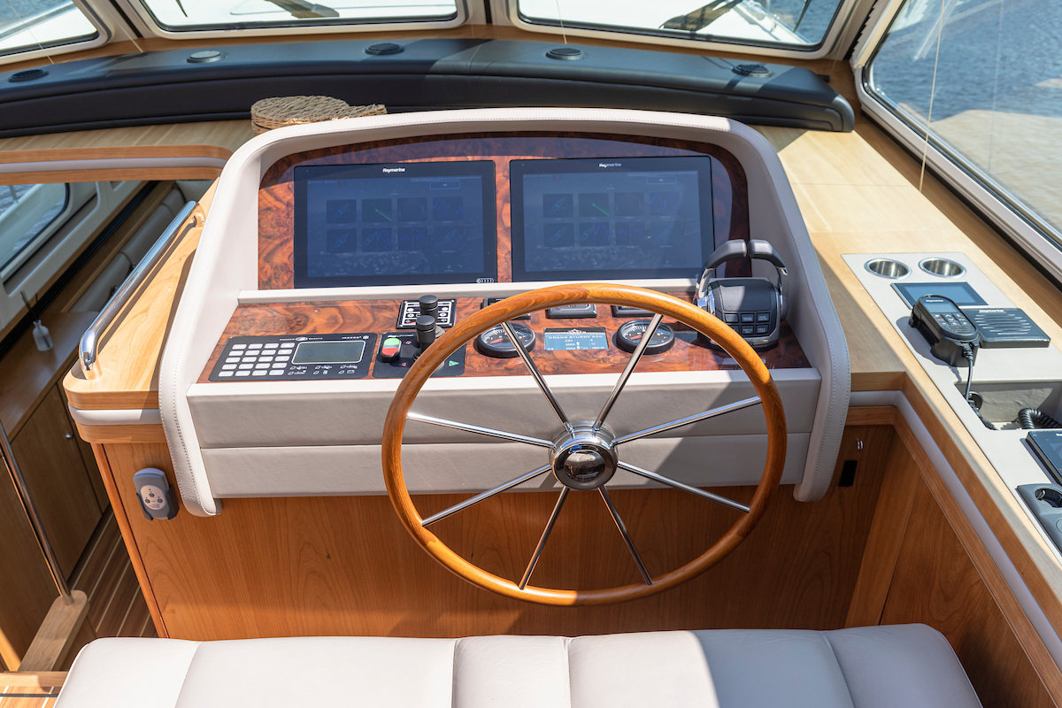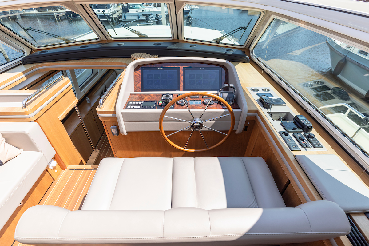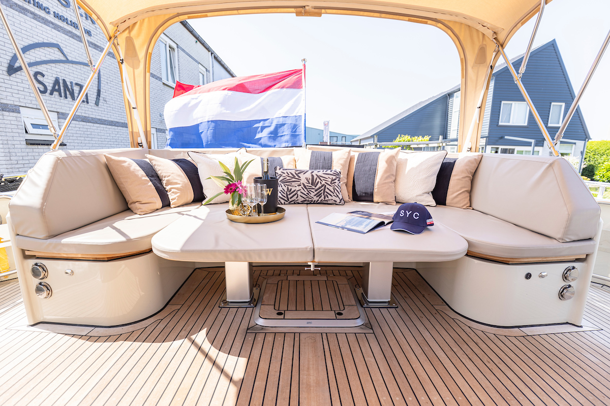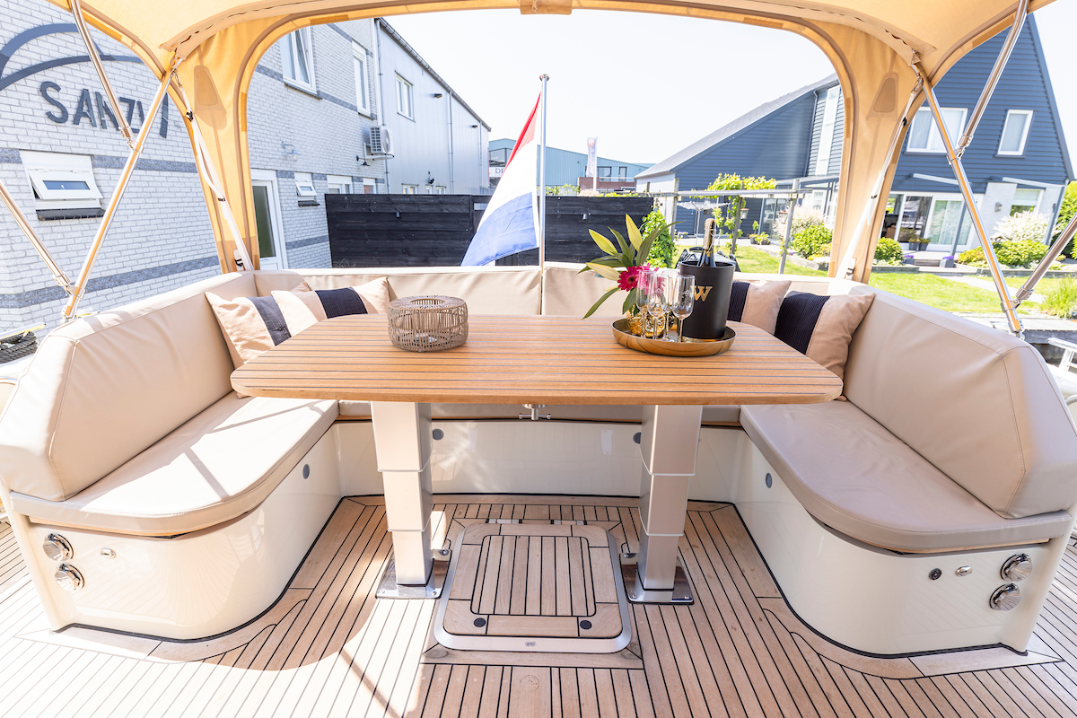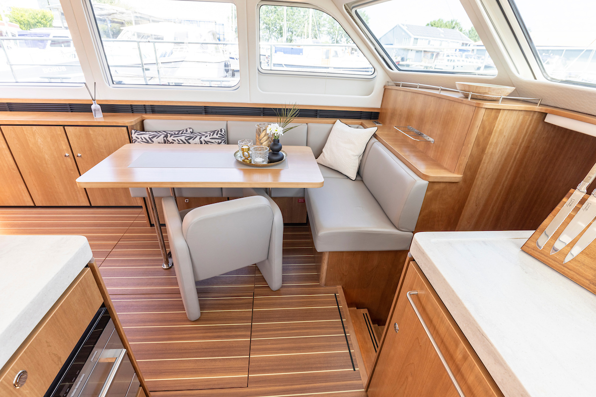 In the wheelhouse is the dashboard with an extensive set of navigation equipment: double plotter screen, autopilot, AIS and radar, tiller steering, VHF radio, cameras around, Navionics map Europe, proportional powerful bow and stern thruster. Remote control via Yachtcontroller to operate bow and stern thruster and both engines. The steering position is equipped with a luxurious leather two-person steering bench which can be electrically adjusted to any position. In the steering bench is a small extendable bar table. Behind the steering bench is a kitchenette with a sink and a refrigerator. In the wheelhouse is a second bench on the port side.